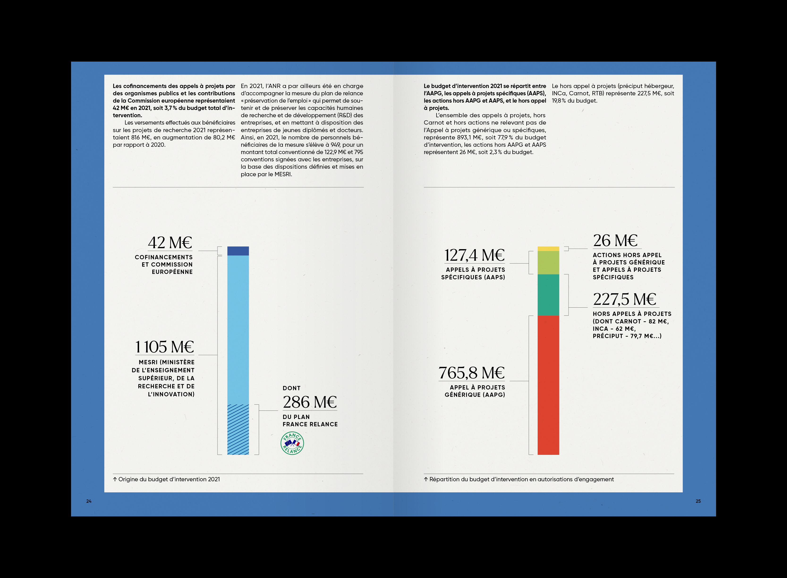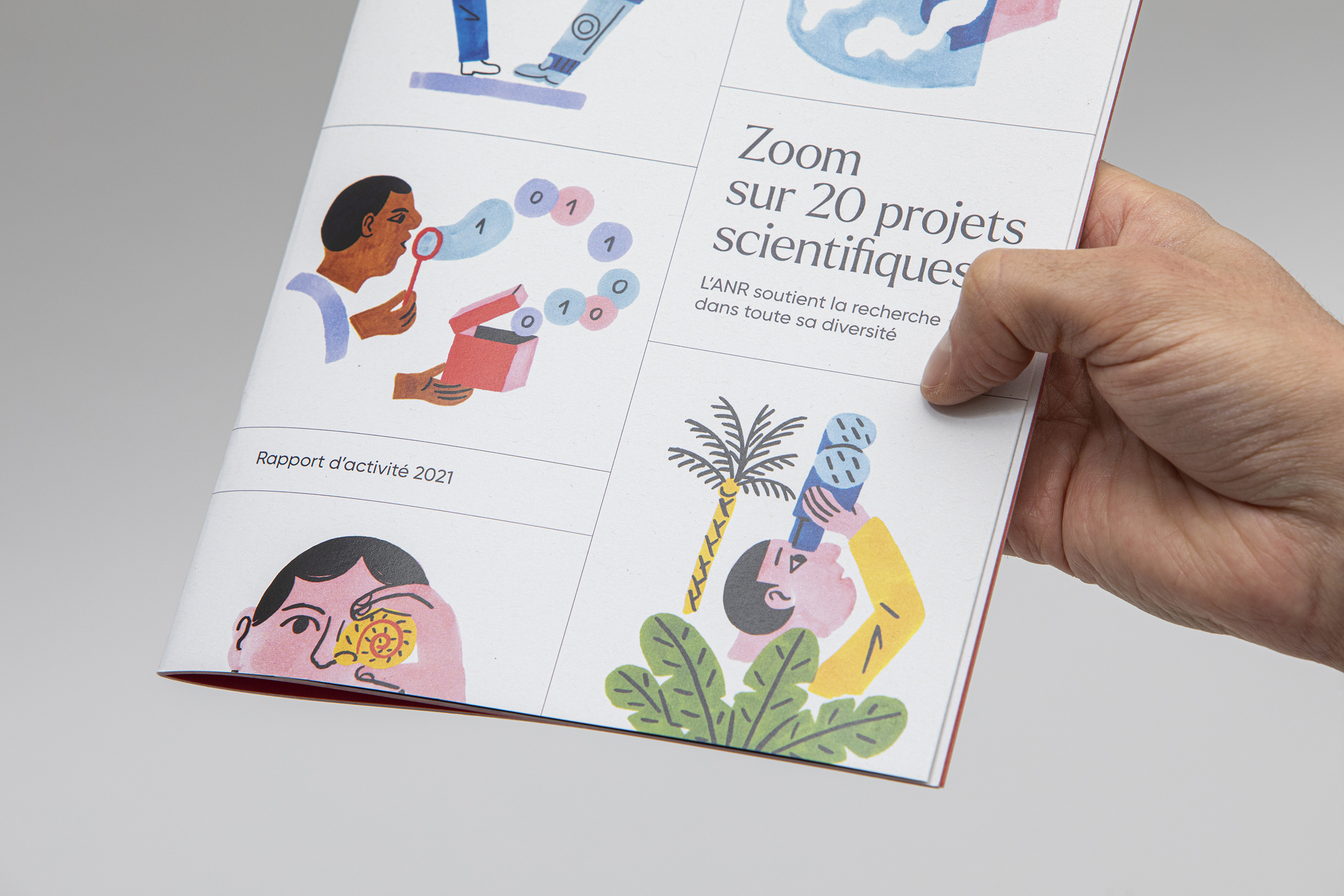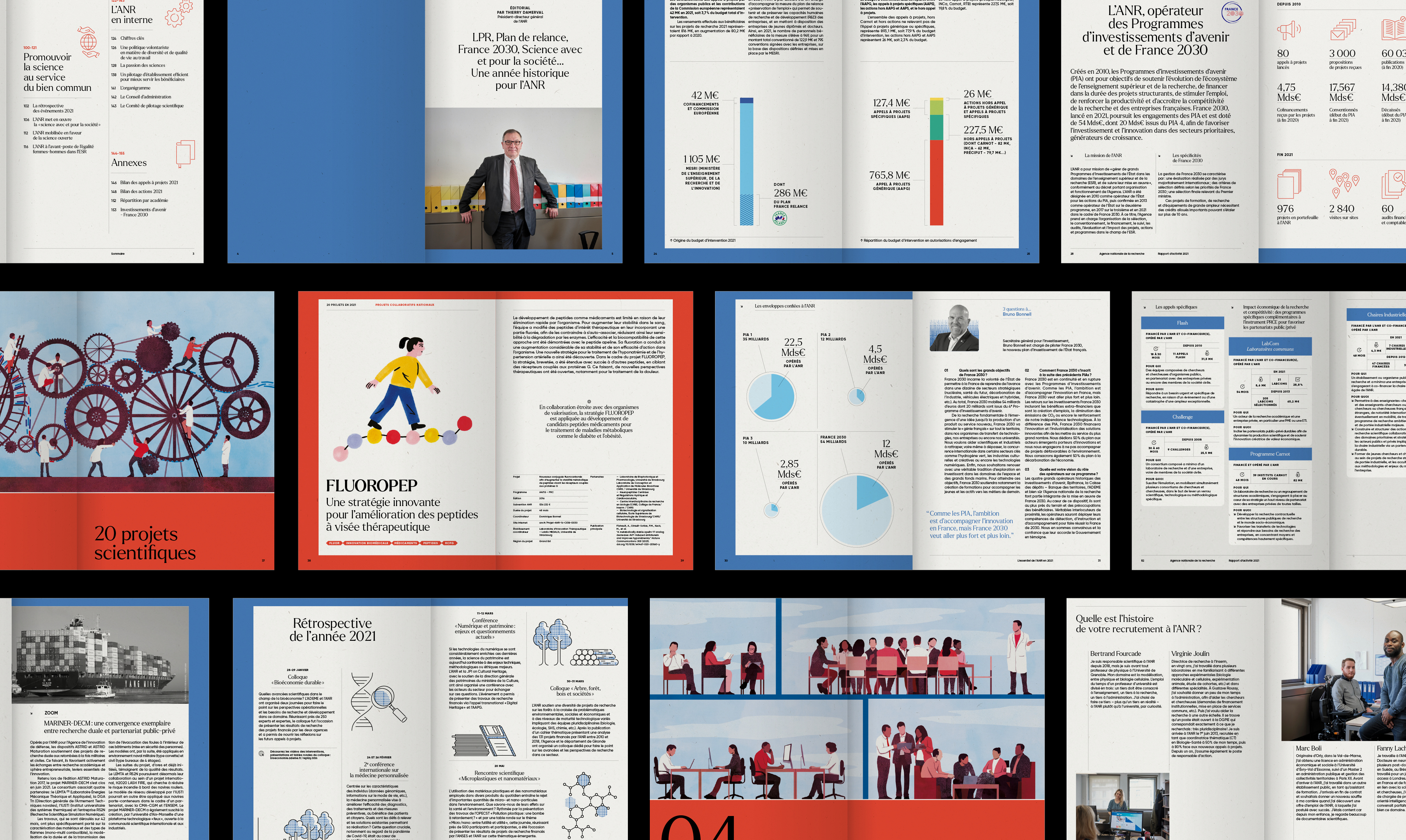 L’ANR est l’agence publique de financement de la recherche. Créée il y a un peu plus de 15 ans, elle est devenue un rouage essentiel de l’écosystème scientifique français. Dans un contexte d’augmentation historique de son budget, elle souhaite donner un nouveau souffle à son prochain rapport d’activité. Notre proposition éditoriale séduit, notre capacité à assurer l’intégralité de l’écriture et du design graphique rassure: nous remportons le marché.