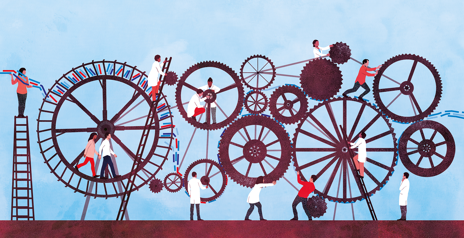 Les illustrations de Yasmine Gateau ouvrent les cinq grands chapitres du rapport: elles transposent de manière métaphorique le rôle de l’ANR.