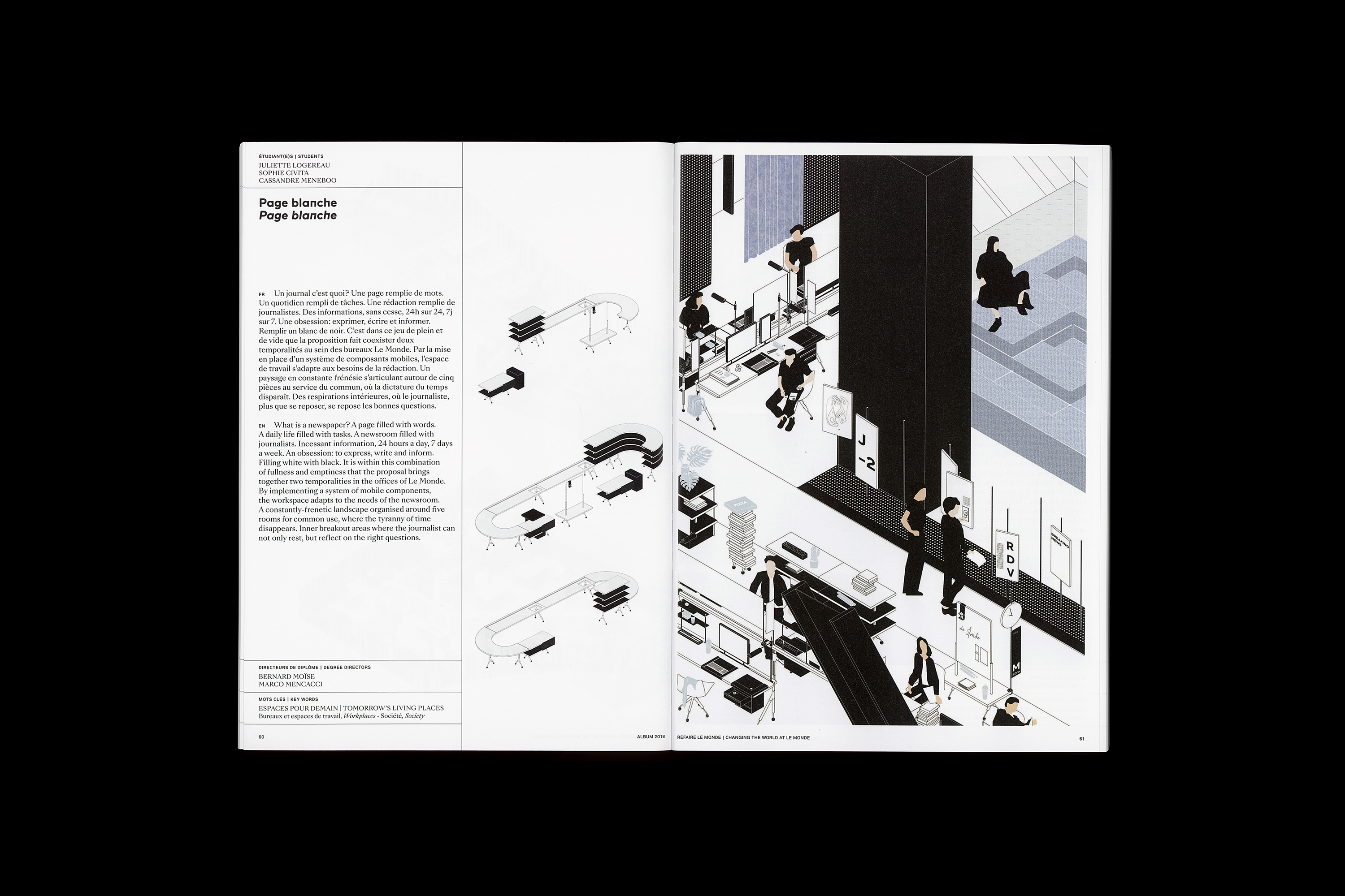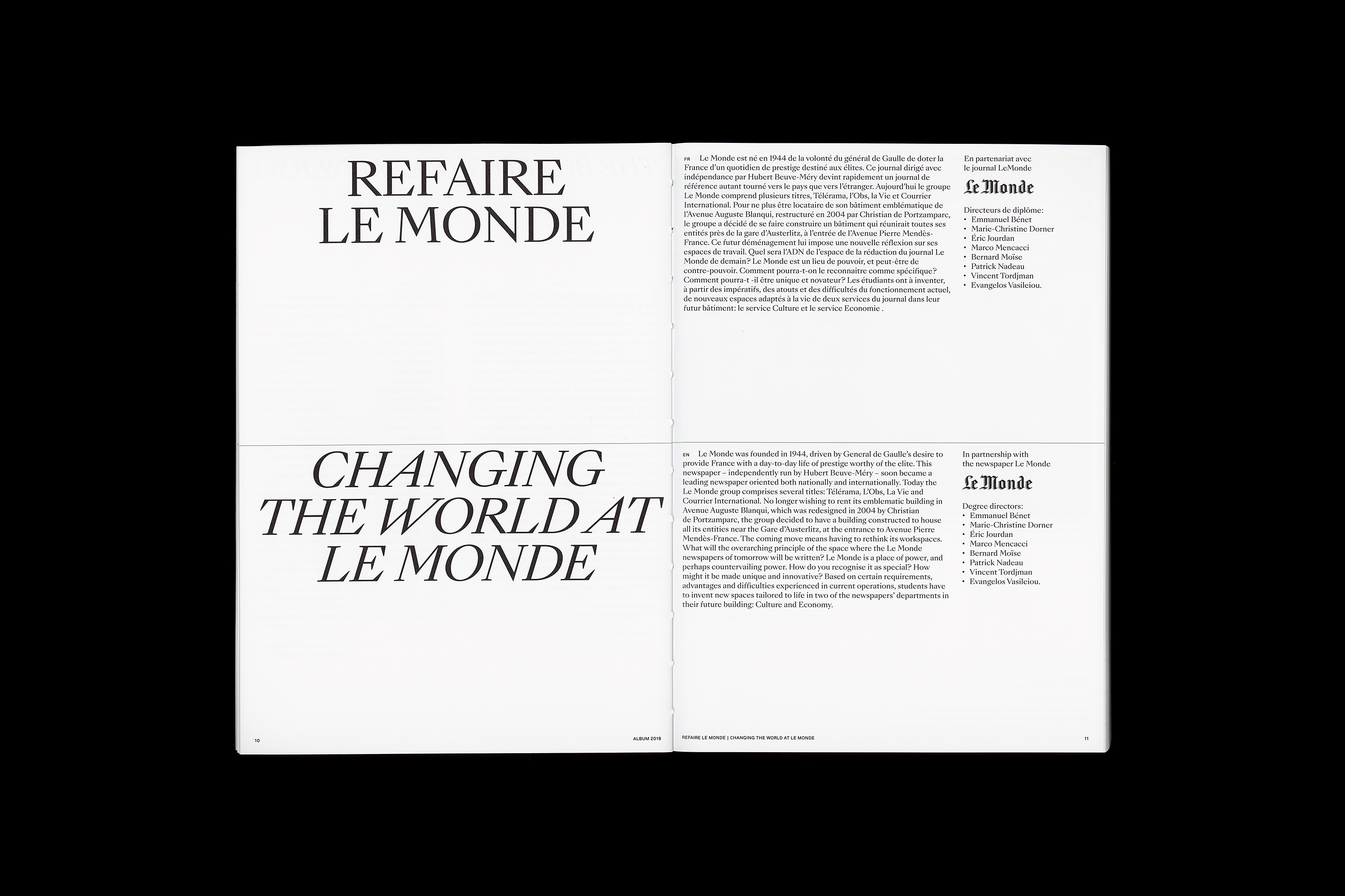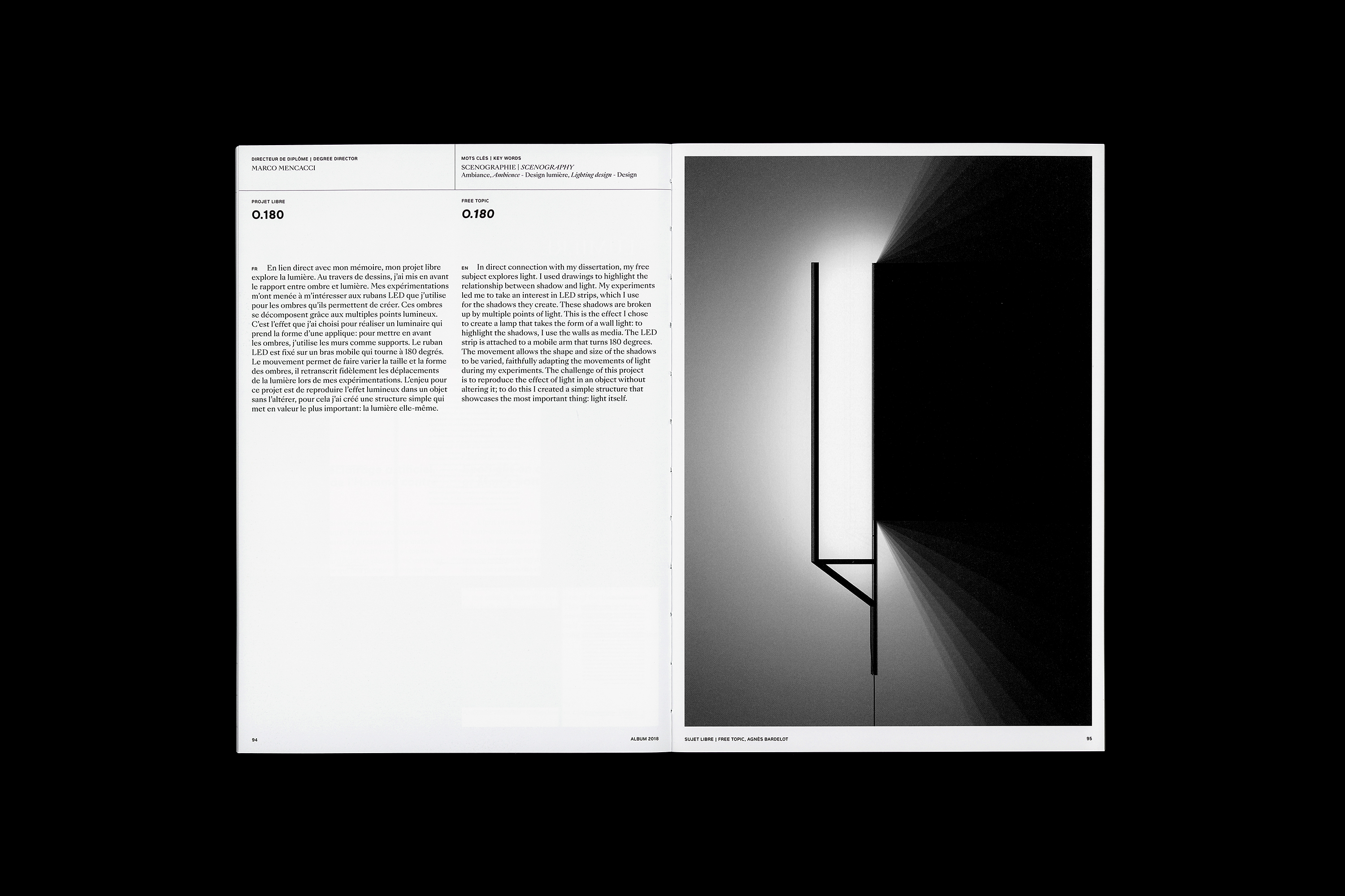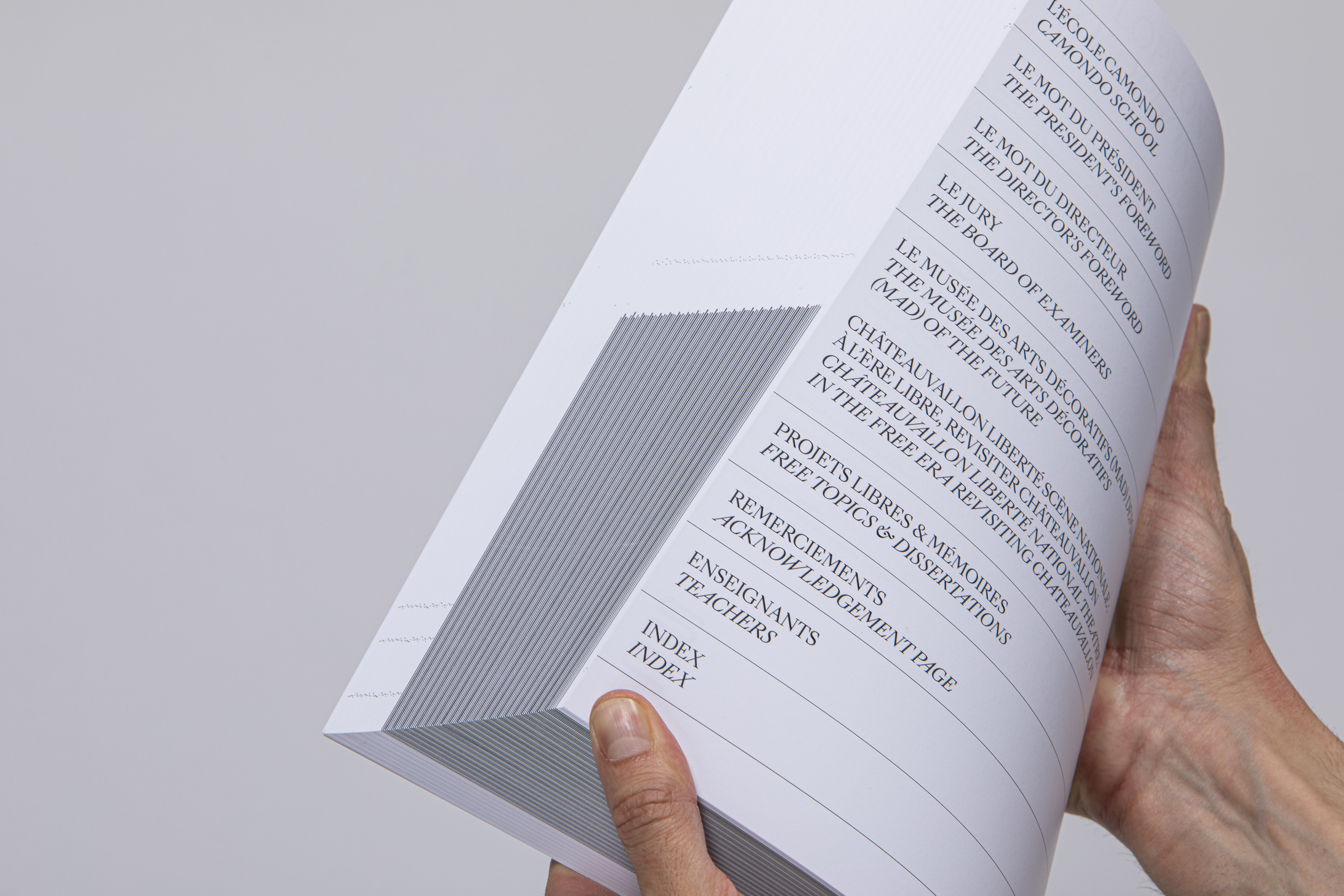 Cet objet de 380 pages présente les 49 projets de diplômes de la promotion 2018 de l’École Camondo. C’était la première fois que l’établissement s’engageait dans une démarche de compilation, véritable gratification pour les élèves et les enseignants. Nous avons réussi le tour de force de concevoir et réaliser l’ouvrage en 2 mois. À temps pour qu’il soit offert lors de la soirée de remise des diplômes, au musée des Arts décoratifs.