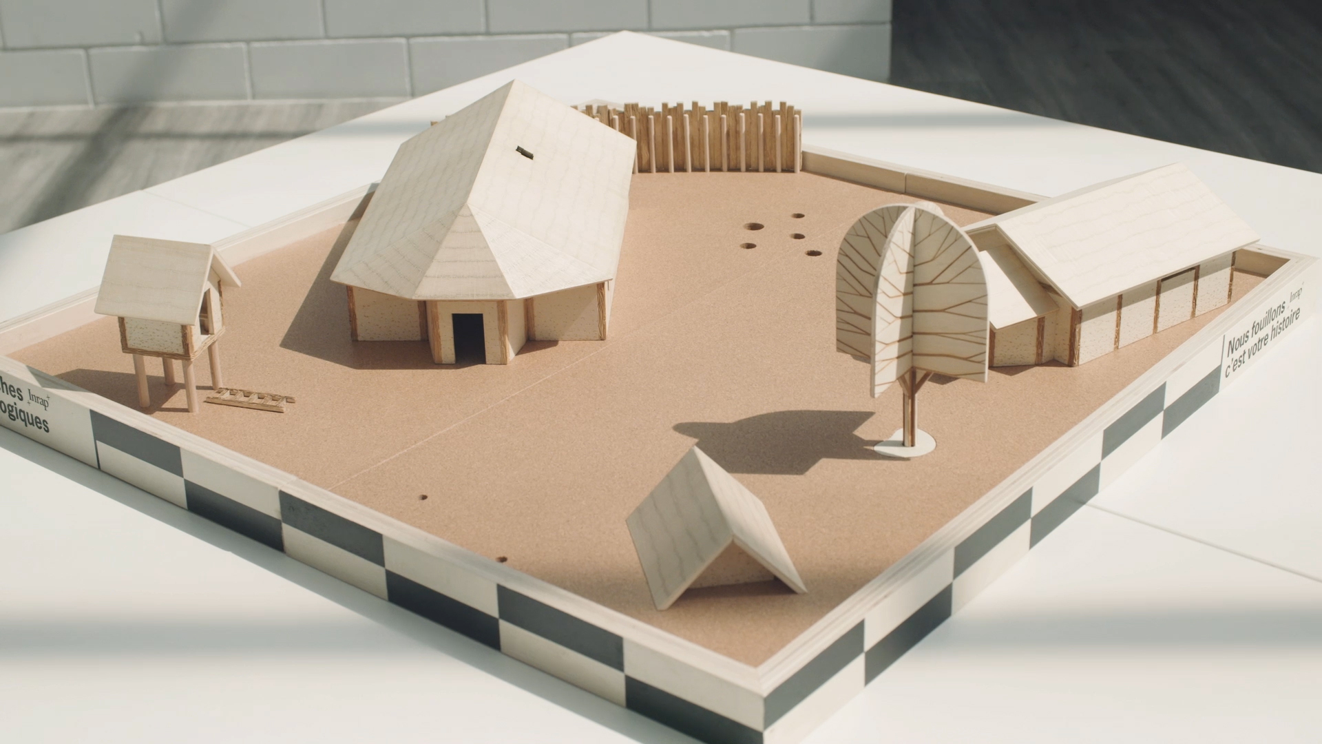 Conçue pour être effeuillée, la maquette permet de remonter le temps au fil des couches stratigraphiques. Pour gagner en qualité et en robustesse, nous optons pour le liège et le bois. Des motifs gravés au laser viennent signifier les différents matériaux et natures de sol.