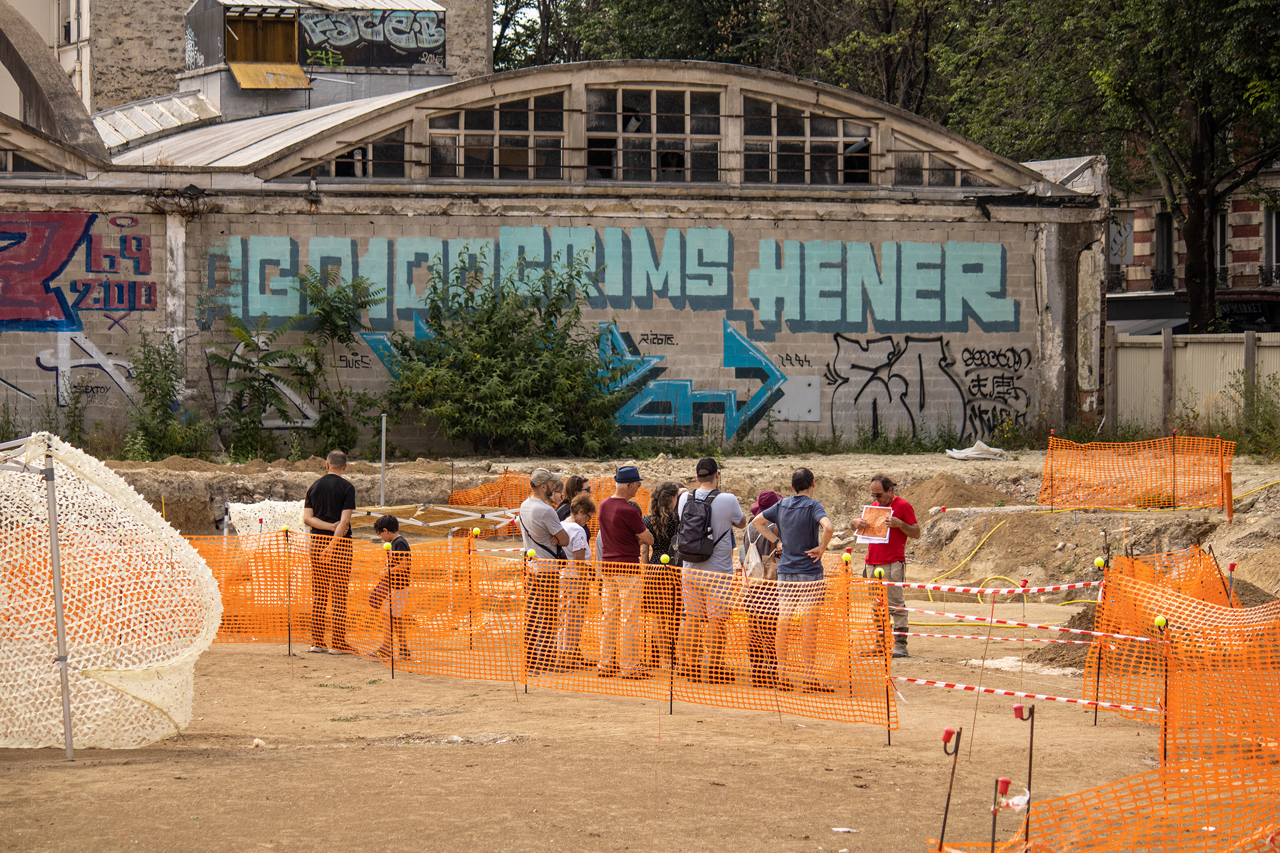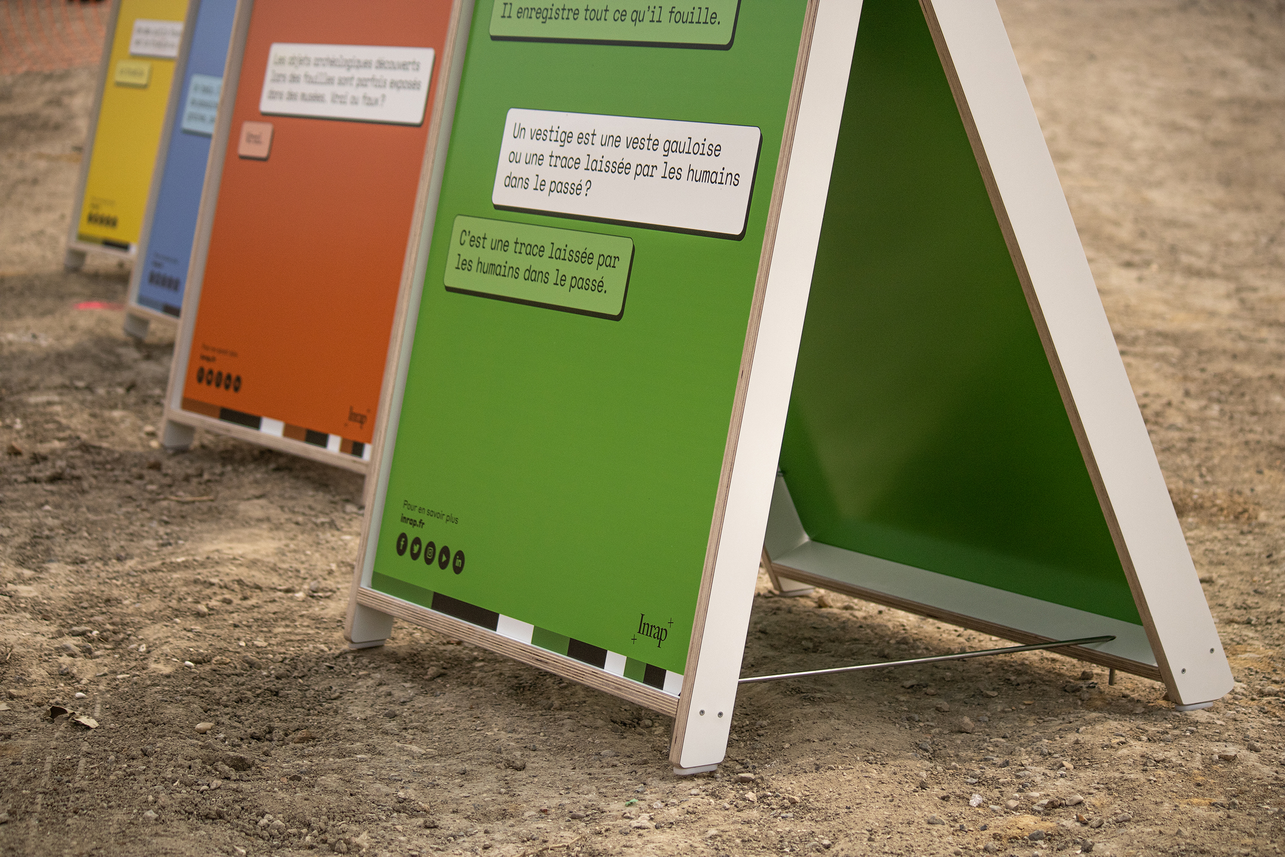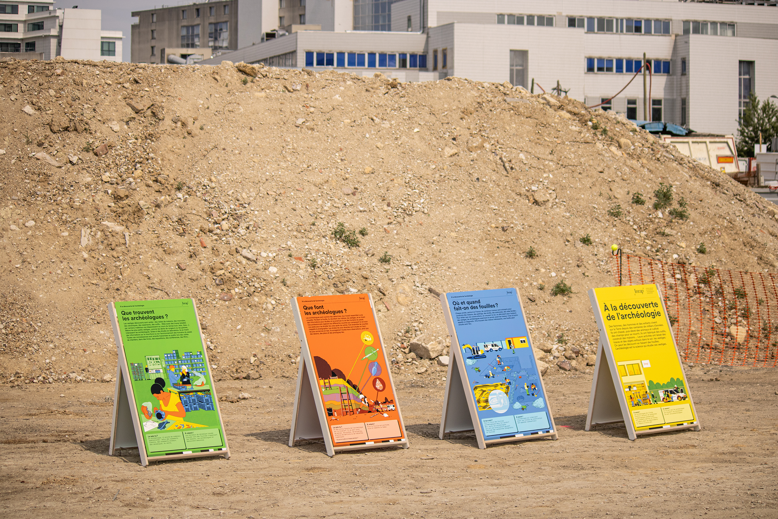 Installées sur des fonds de couleurs pop, les panneaux, malgré leurs dimensions modestes, attirent l’attention dans l’immensité du chantier.