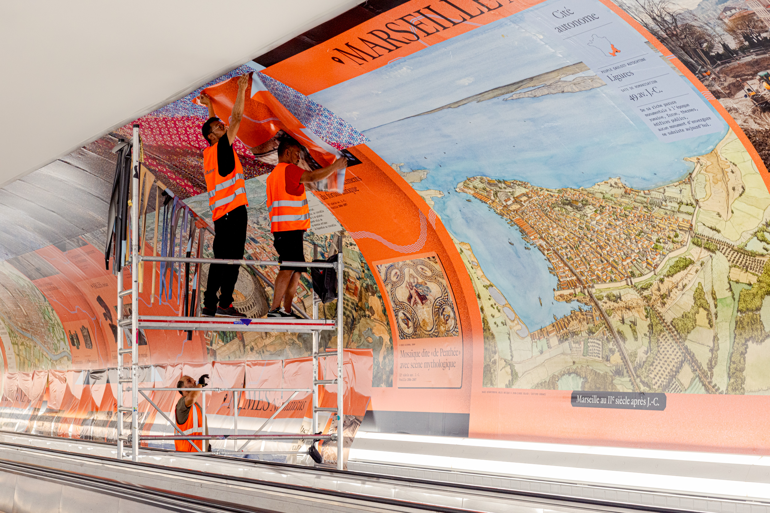 Le chantier est un contexte difficile pour une exposition. Afin de concevoir un dispositif plus adéquat que de simples enrouleurs, une mission de design et de redéfinition éditoriale nous est confiée.