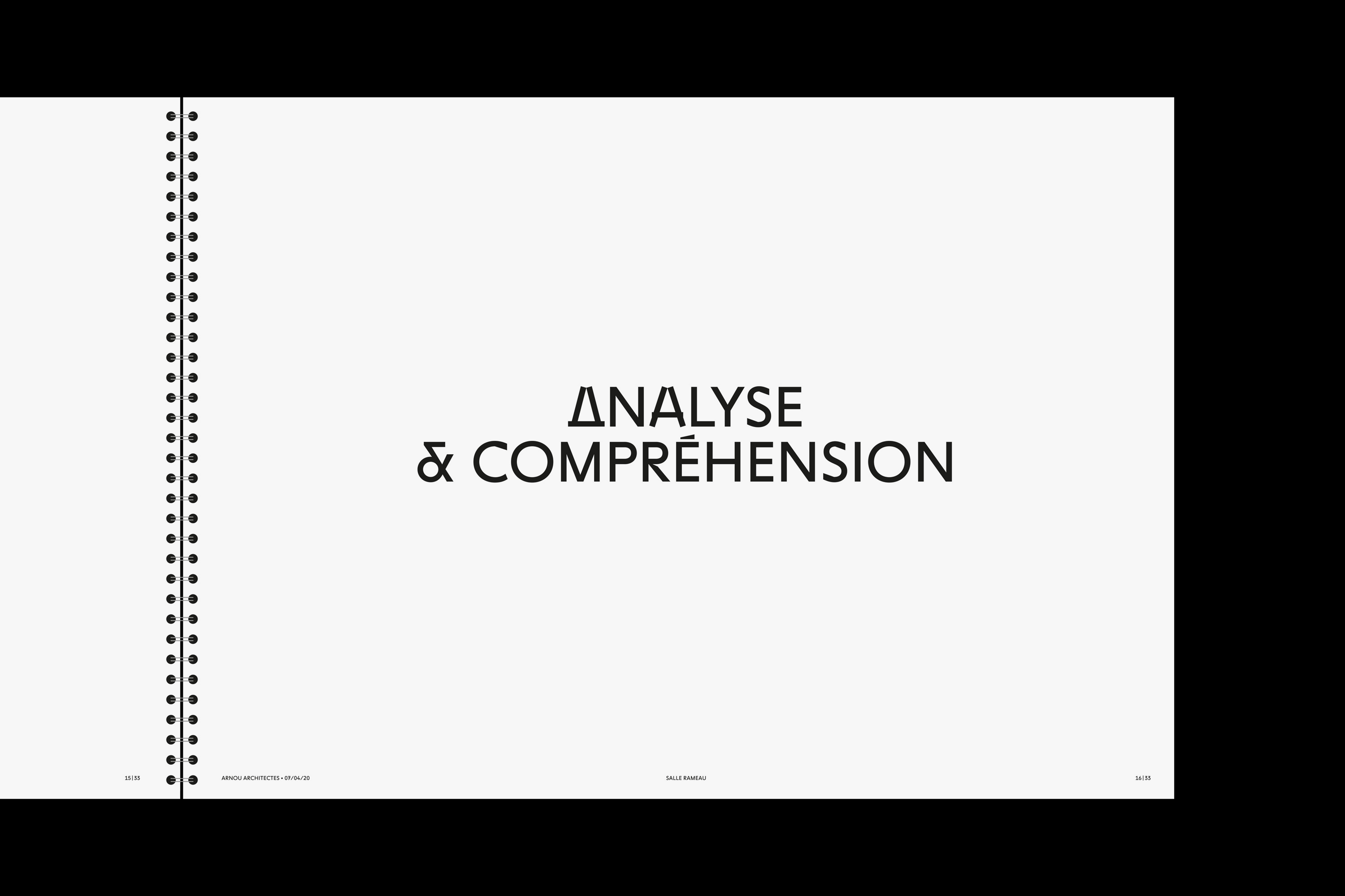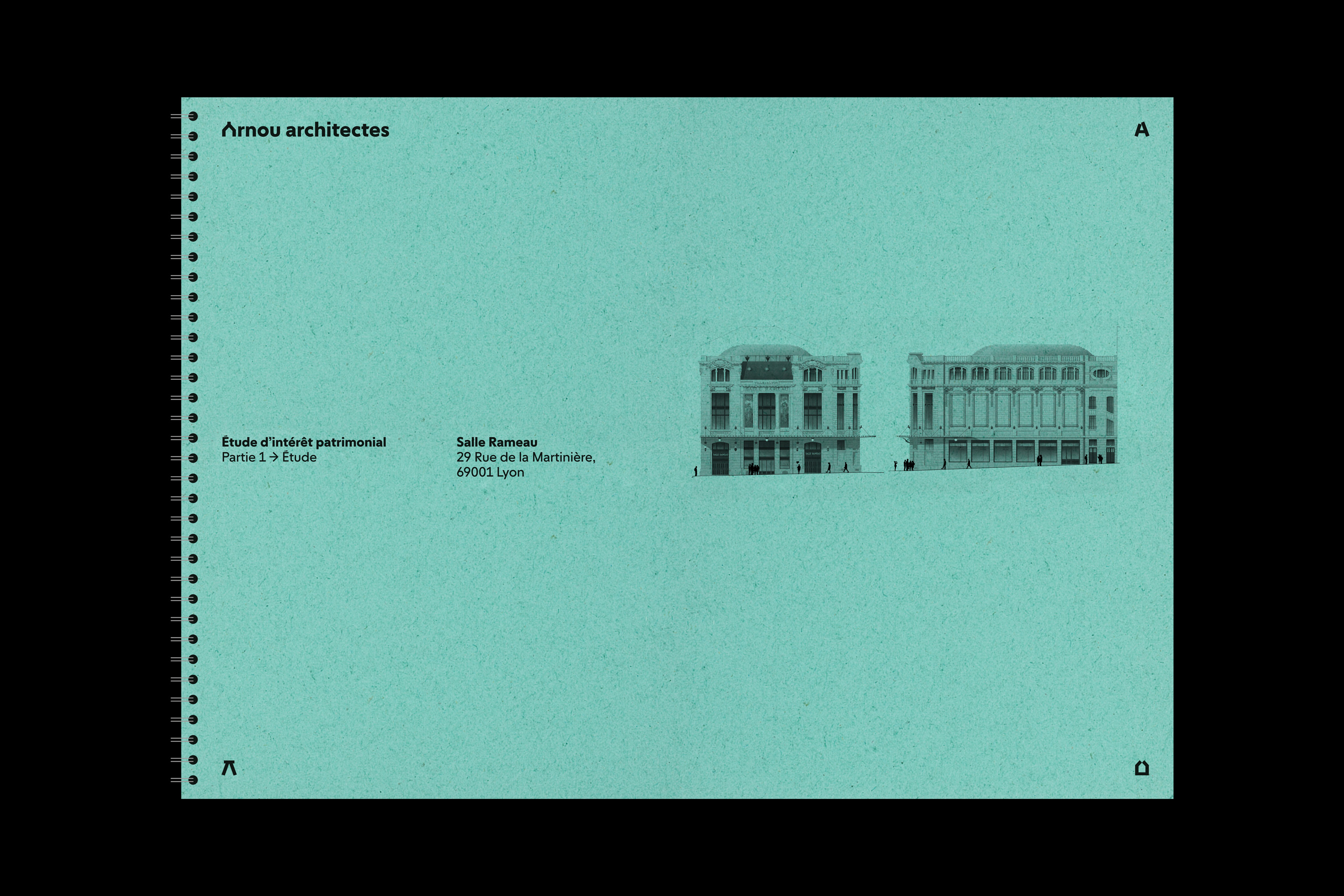 Développé en deux graisses, les quinze caractères custom se substituent au A originel de la Next. Utilisés pour titrer, ils permettent de singulariser les dossiers de présentation des architectes.
