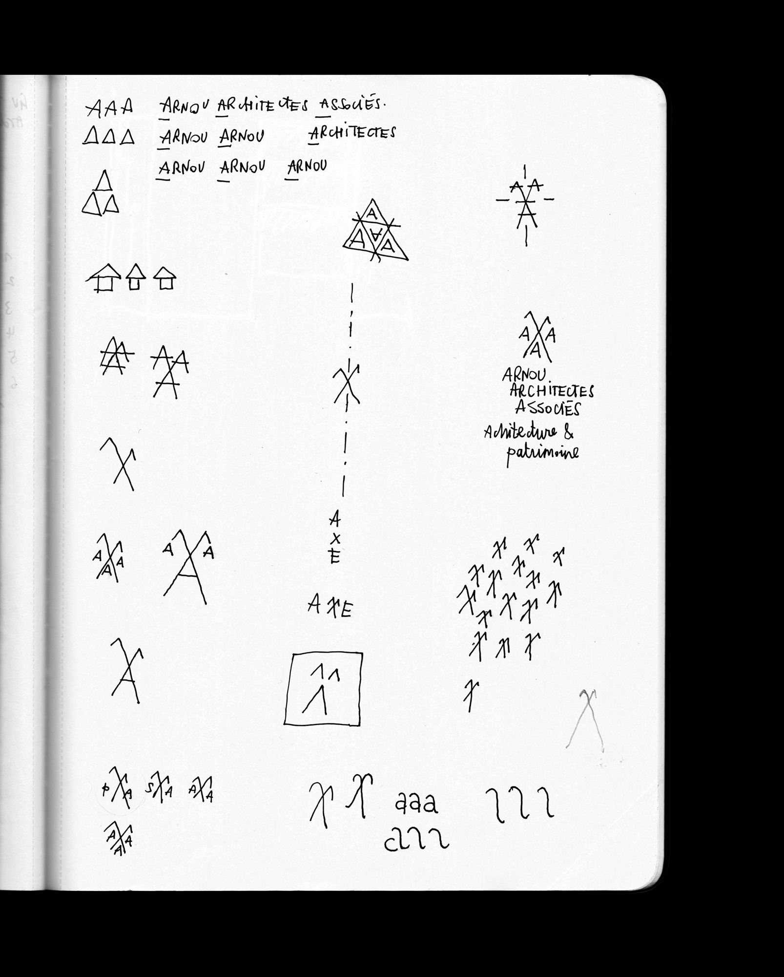 Frères et architectes, Simon et Pierre Arnou s’associent. Ils imaginent leur identité sous le signe évident du A, tracé à la manière des pichaçãos, graffitis découverts lors de leur séjour au Brésil. L’idée est prometteuse : nous nous en emparons. Pour eux, nous dessinons quinze variations de leur initiale – petites architectures à employer comme des balises ou comme des lettres associées à la typographie Next.