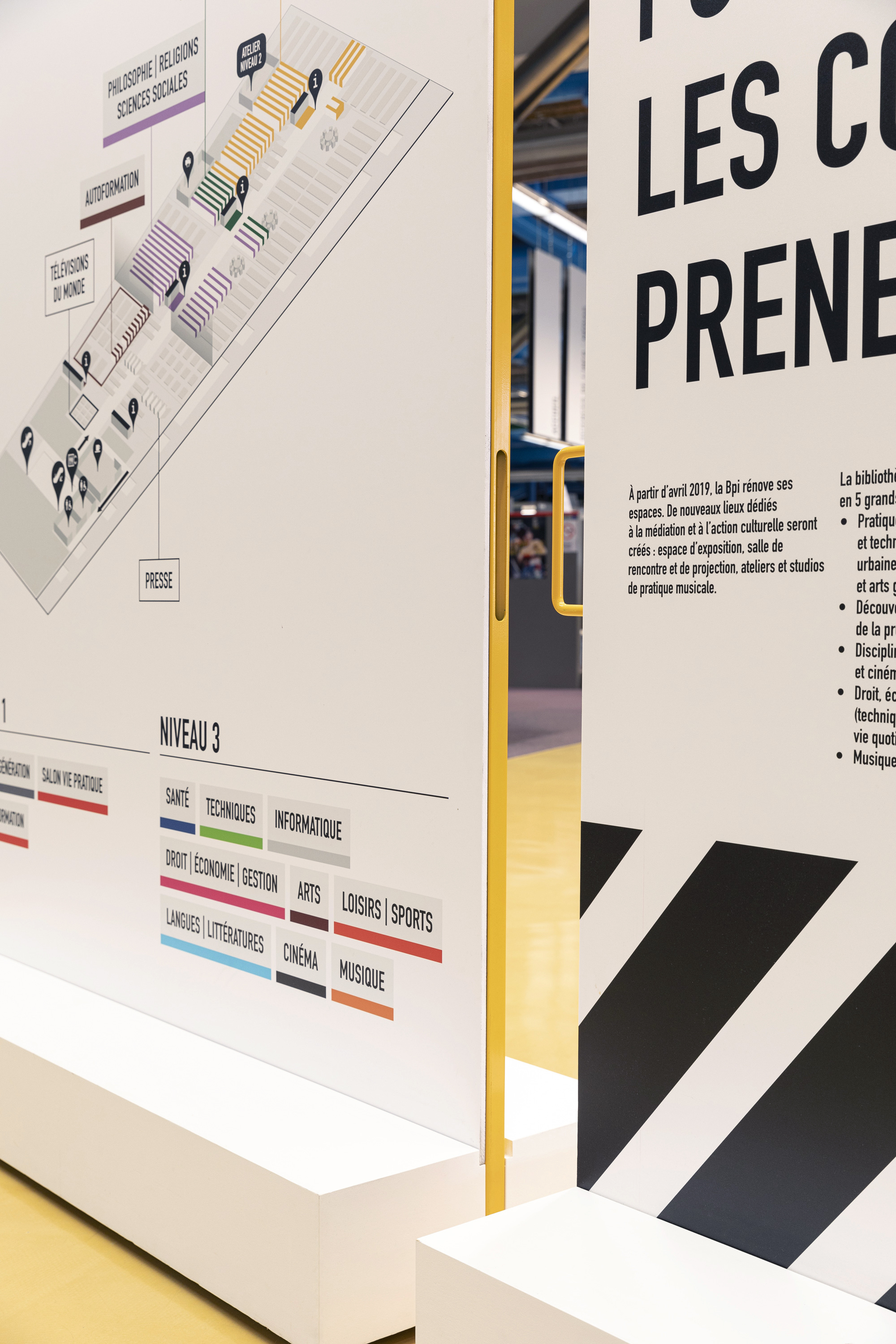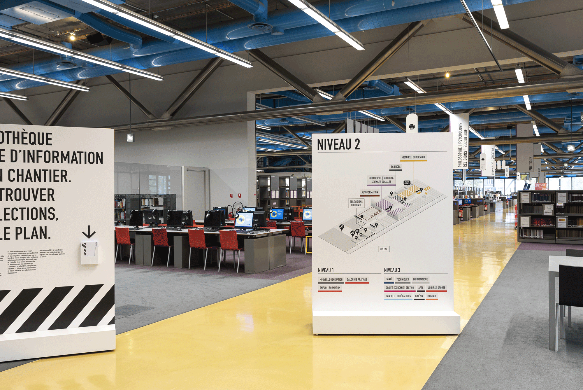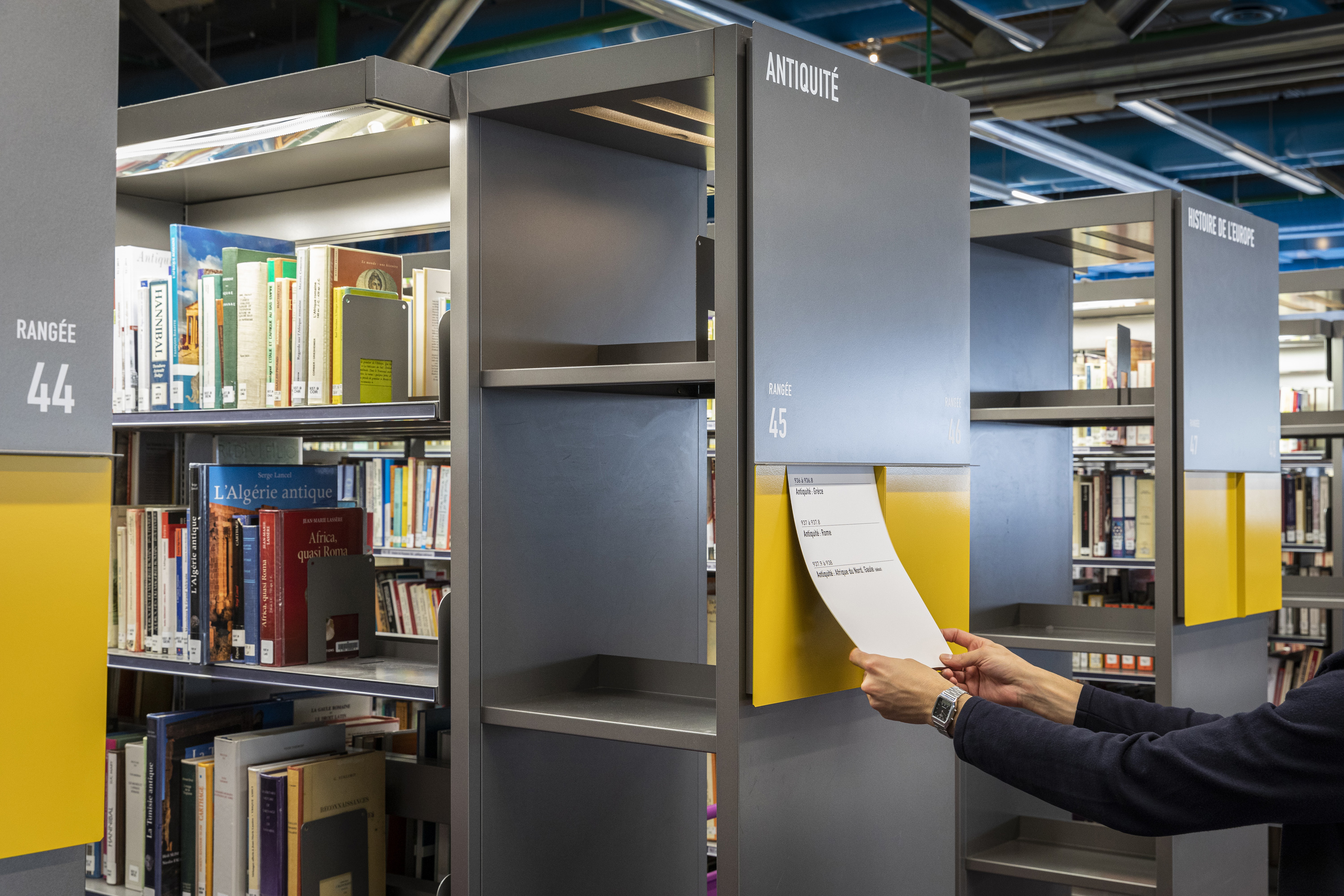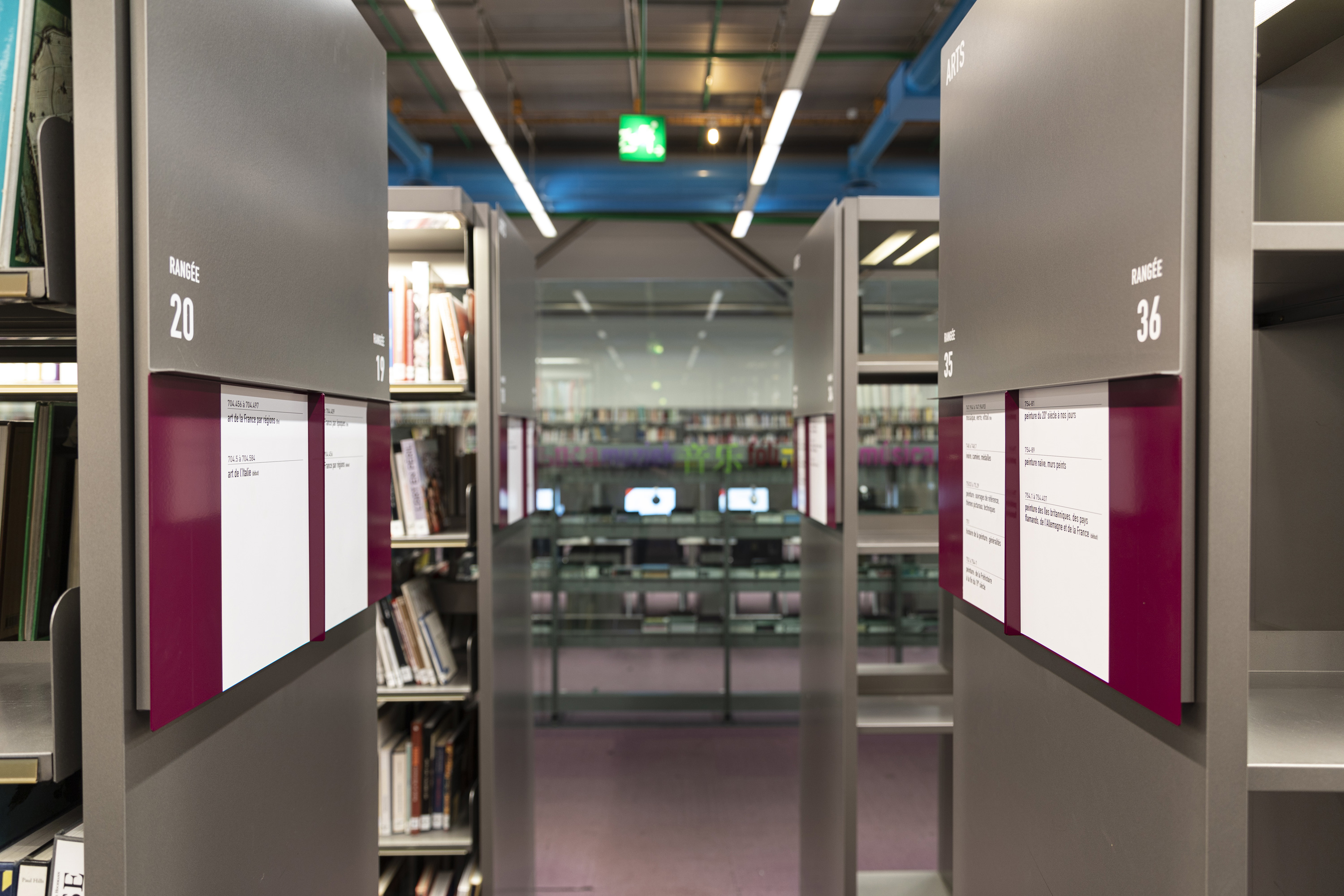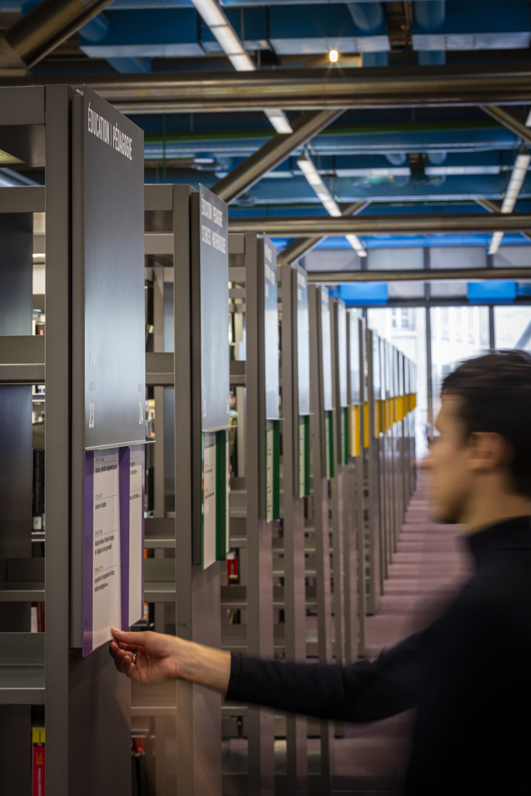 Fidèle à l’intention des architectes du Centre Pompidou, la réhabilitation de la BPI conçue par Canal Architecture désencombre les plateaux pour restituer un paysage intérieur continu. Préalable à ce long chantier conduit sans fermeture, les collections sont déménagées et réimplantées. Mandatés pour concevoir la nouvelle signalétique, nous devons la déployer sans attendre afin de garantir la continuité du service.