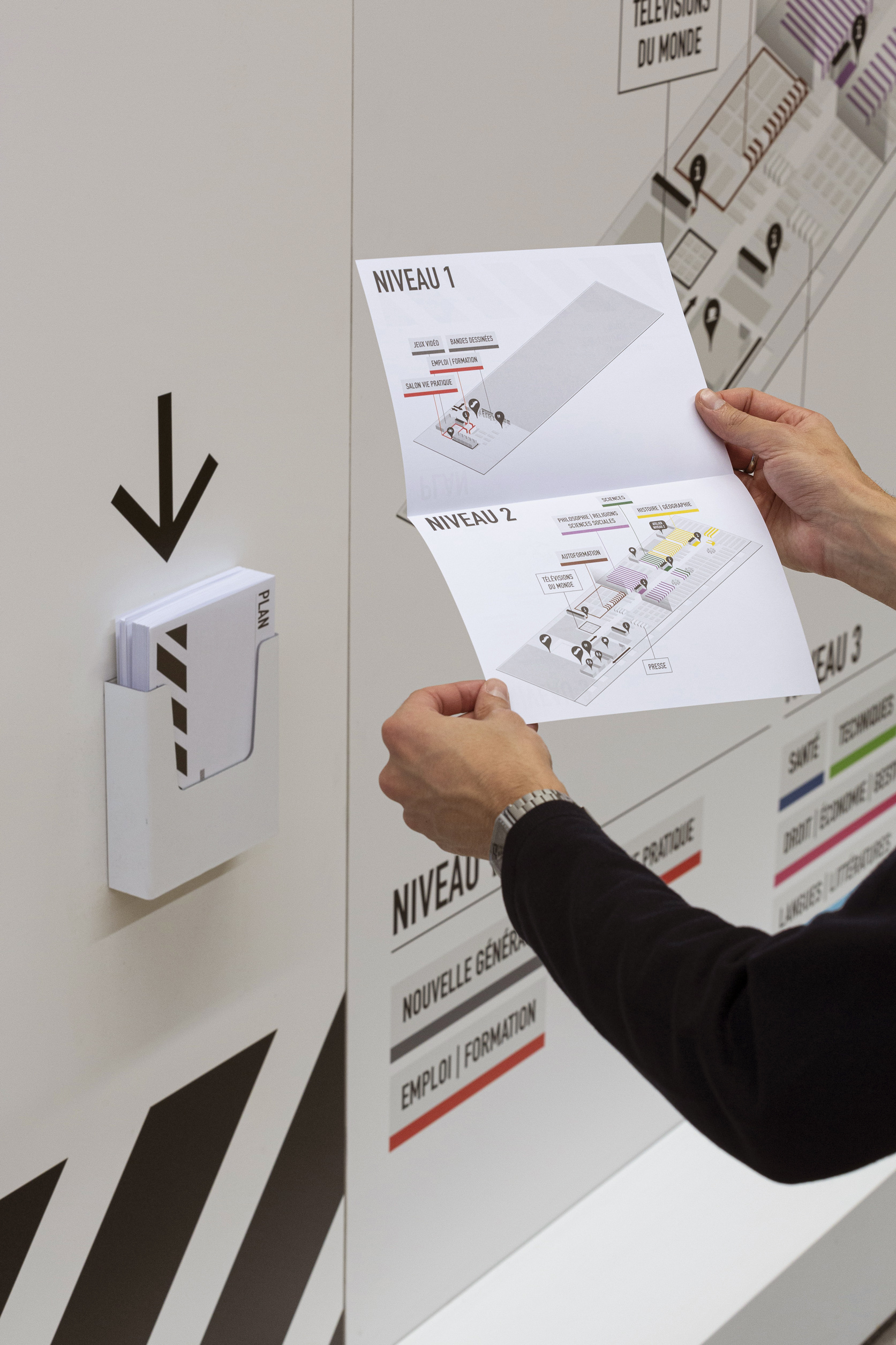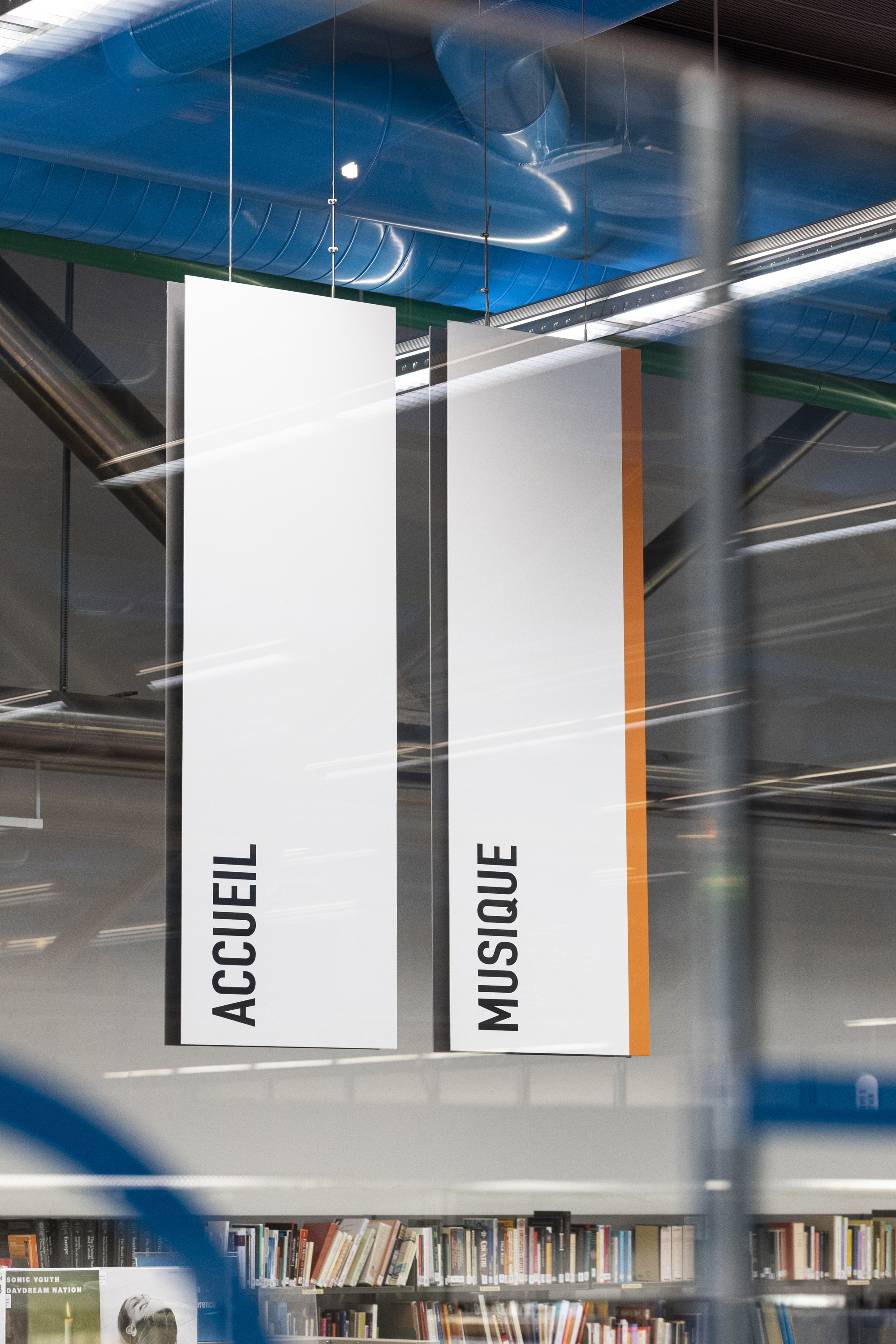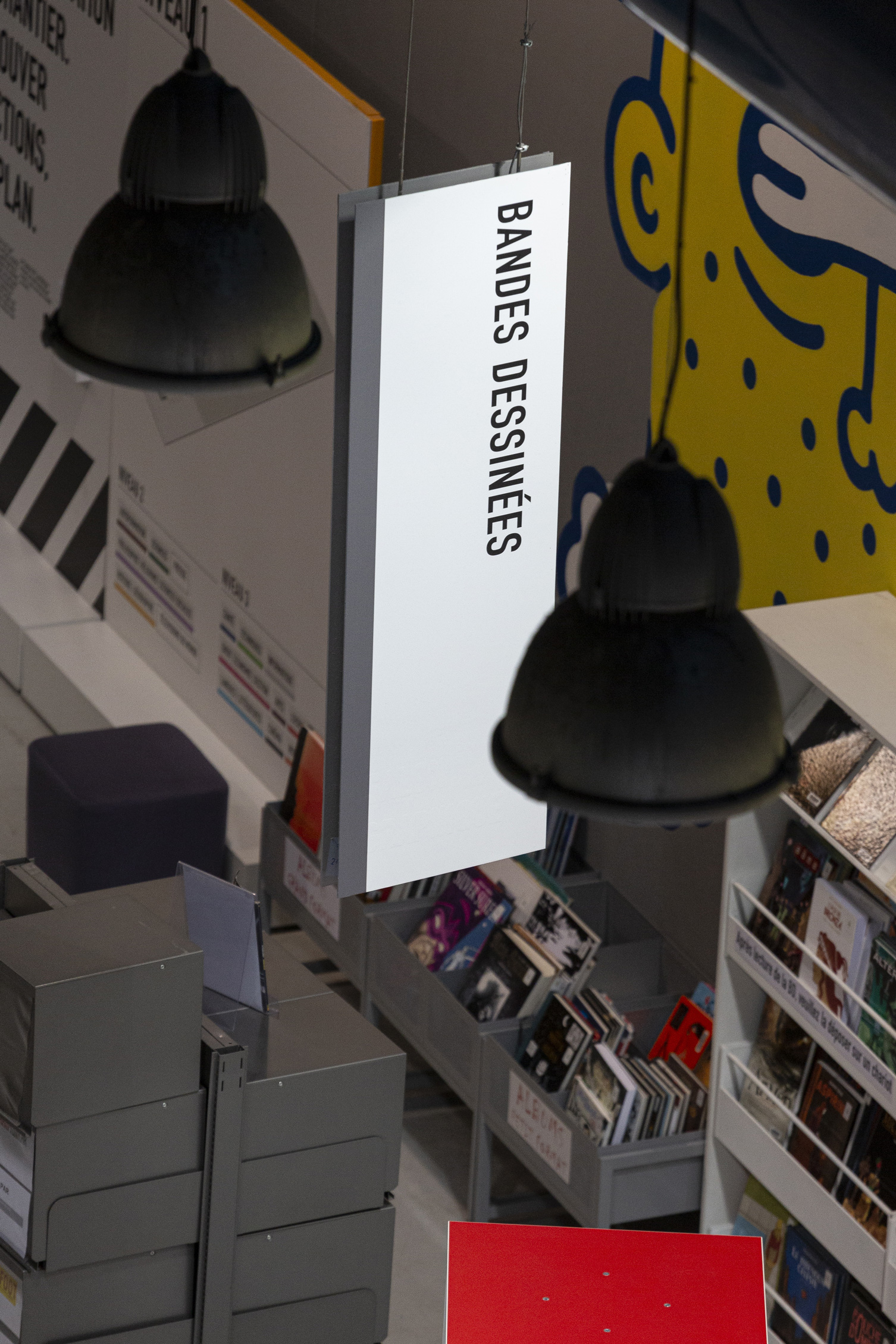 Les panneaux suspendus existants restent en place. Nous repensons leur graphisme : comme le titre sur le dos d’un livre, l’intitulé de chaque section est désormais écrit à la verticale, de bas en haut. Les mots peuvent ainsi prendre leurs aises, pour une meilleure lisibilité.