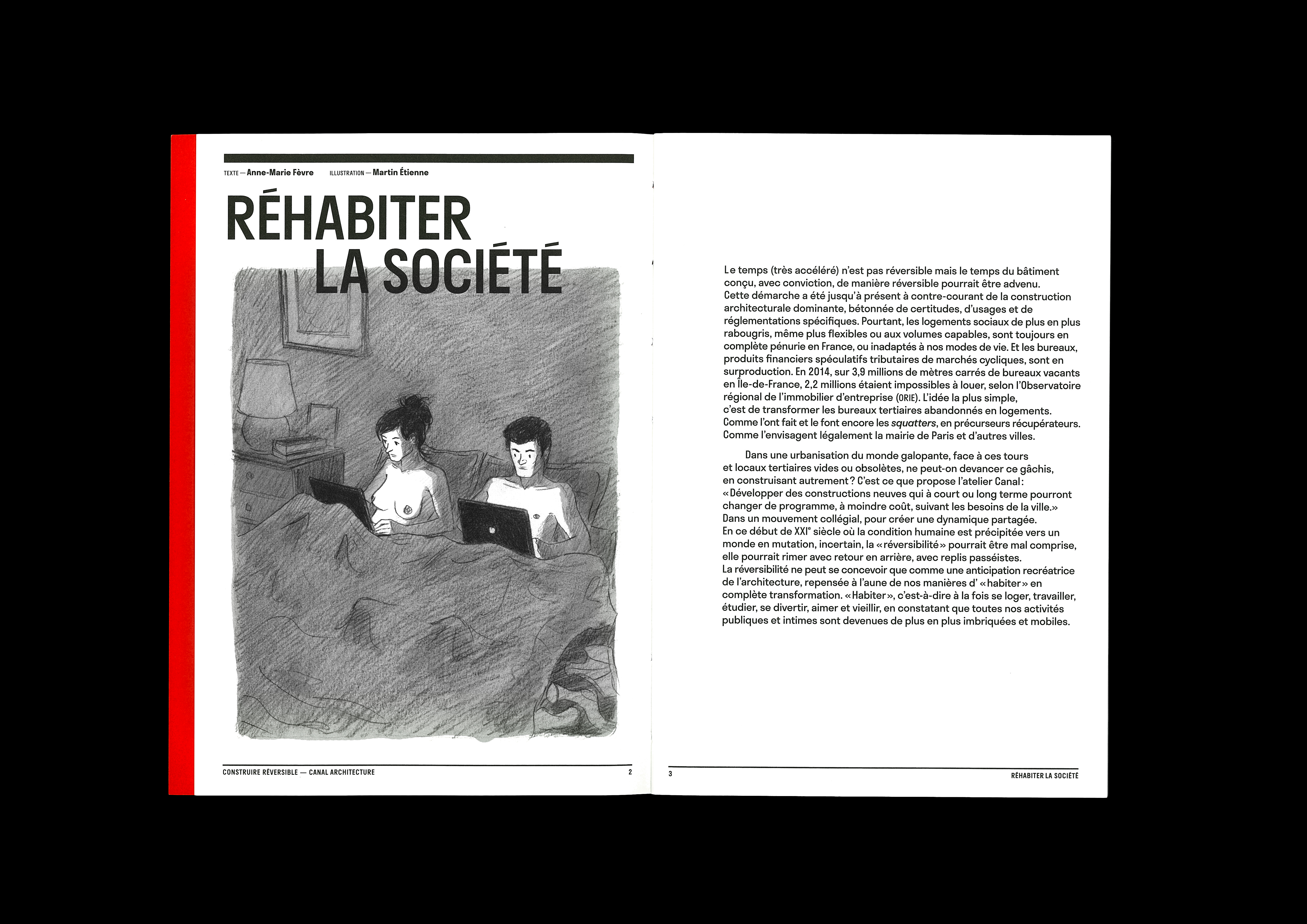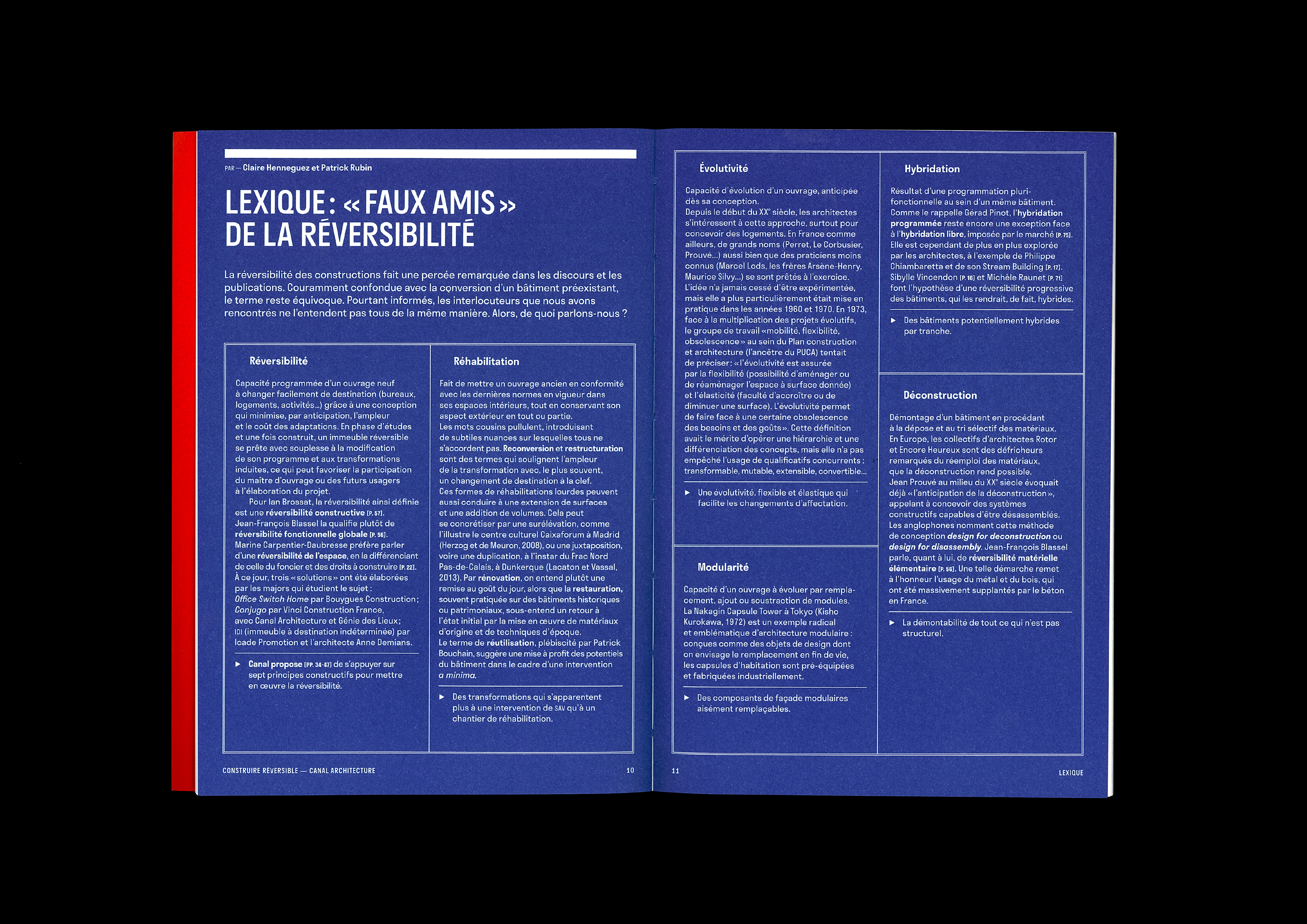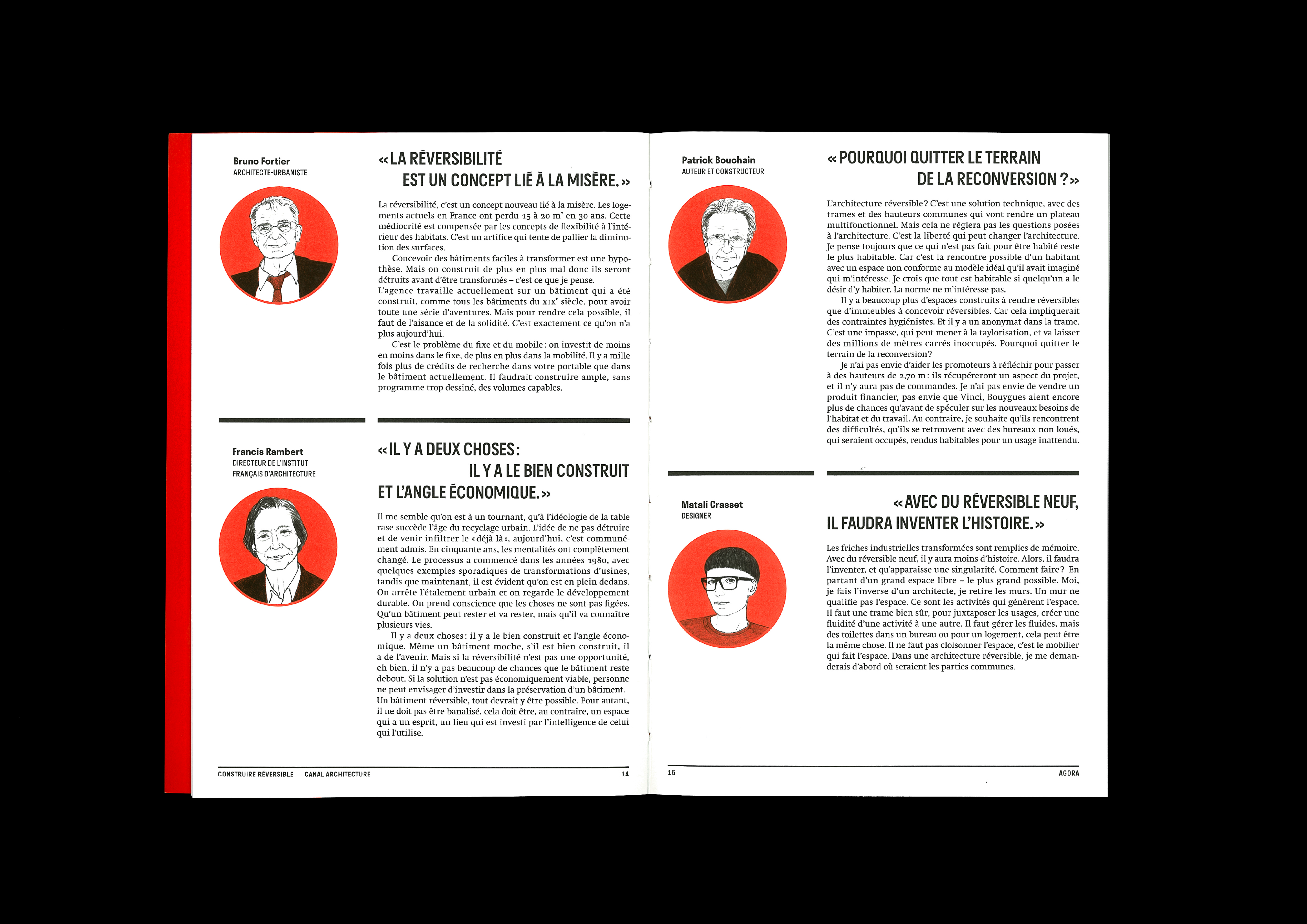 Pour décortiquer le sujet complexe de la réversibilité de l’architecture, nous avons emprunté à la presse certains procédés narratifs : article sociétal, lexique, interviews, étude historique, figures commentées, fiction…
