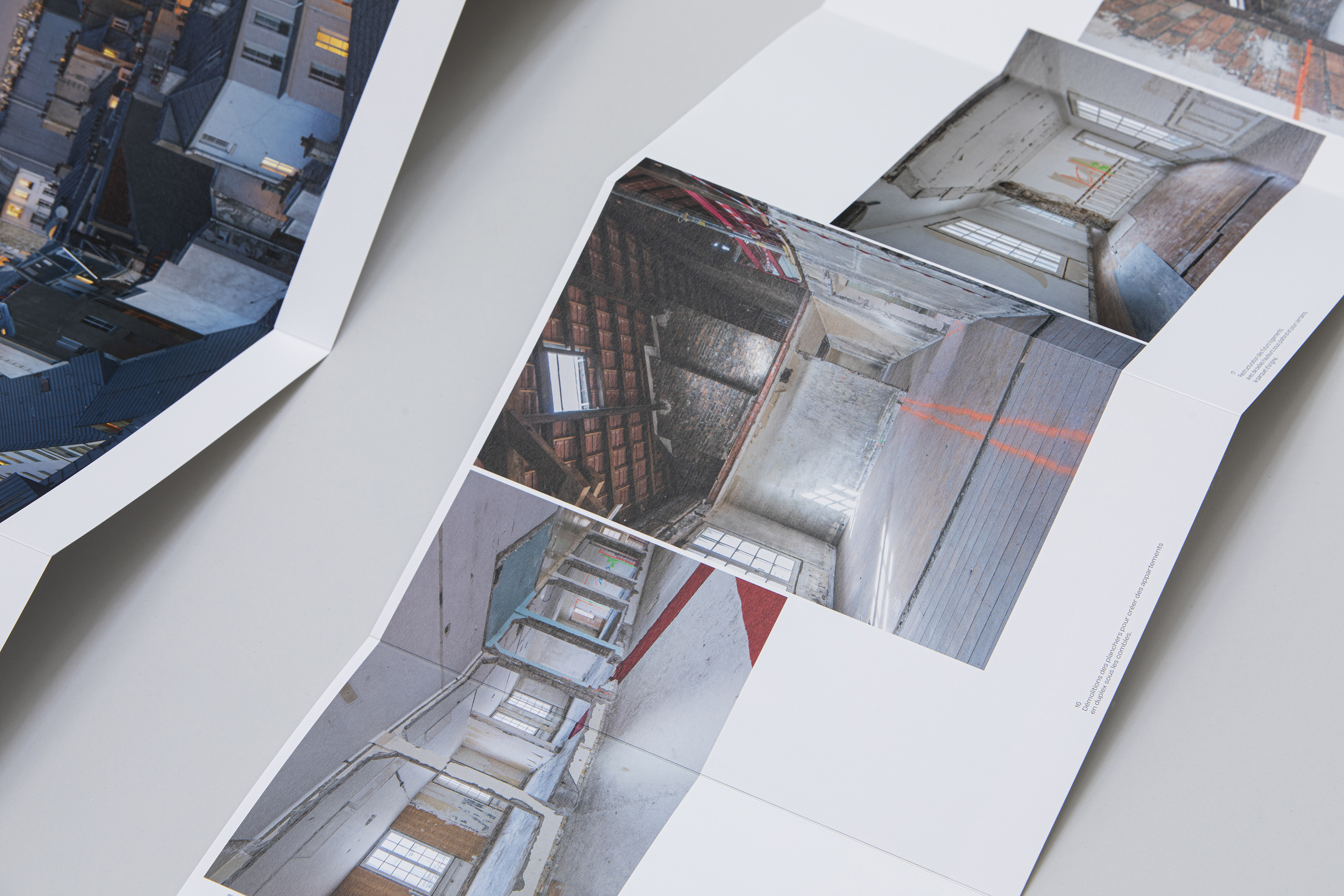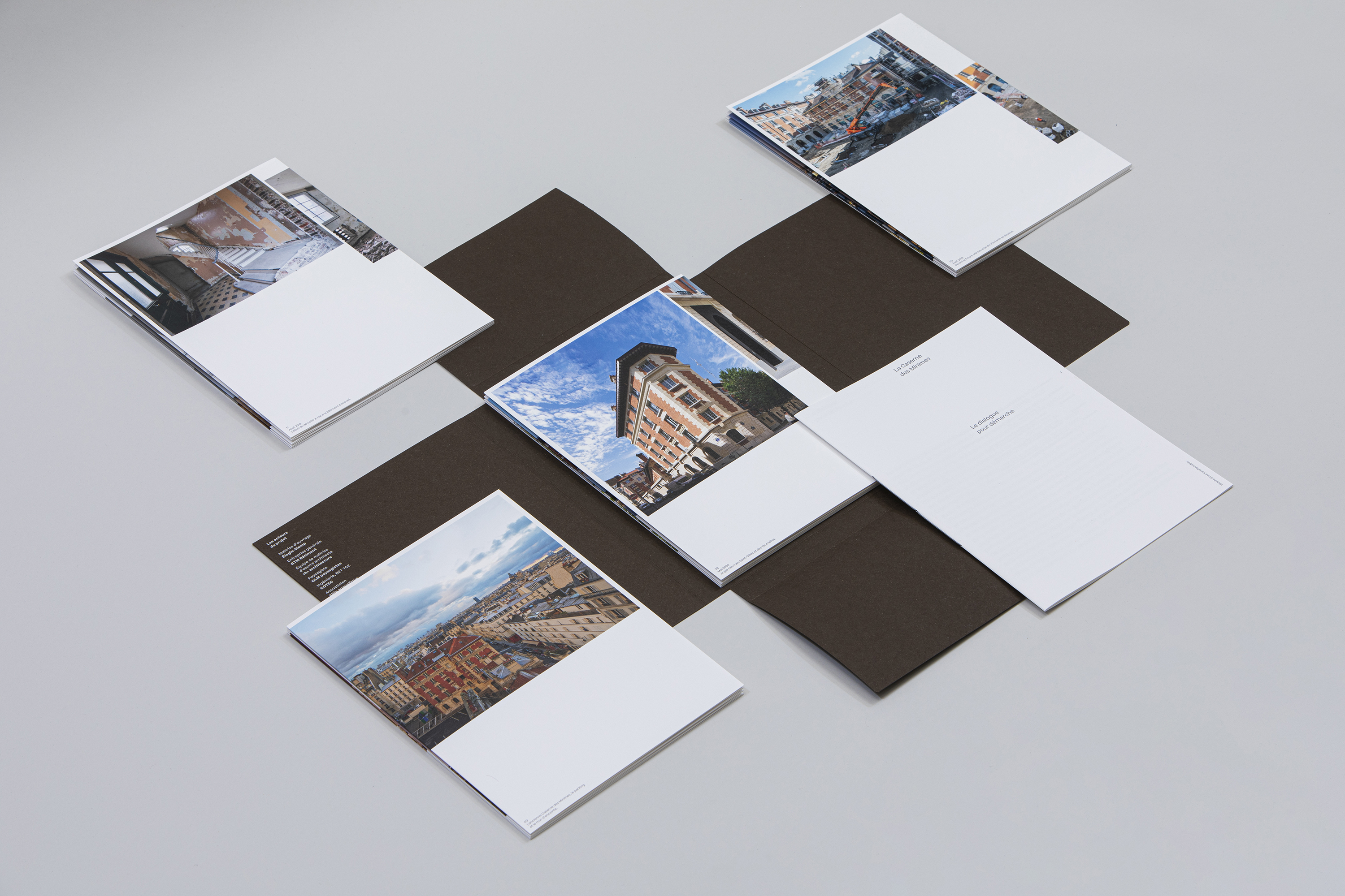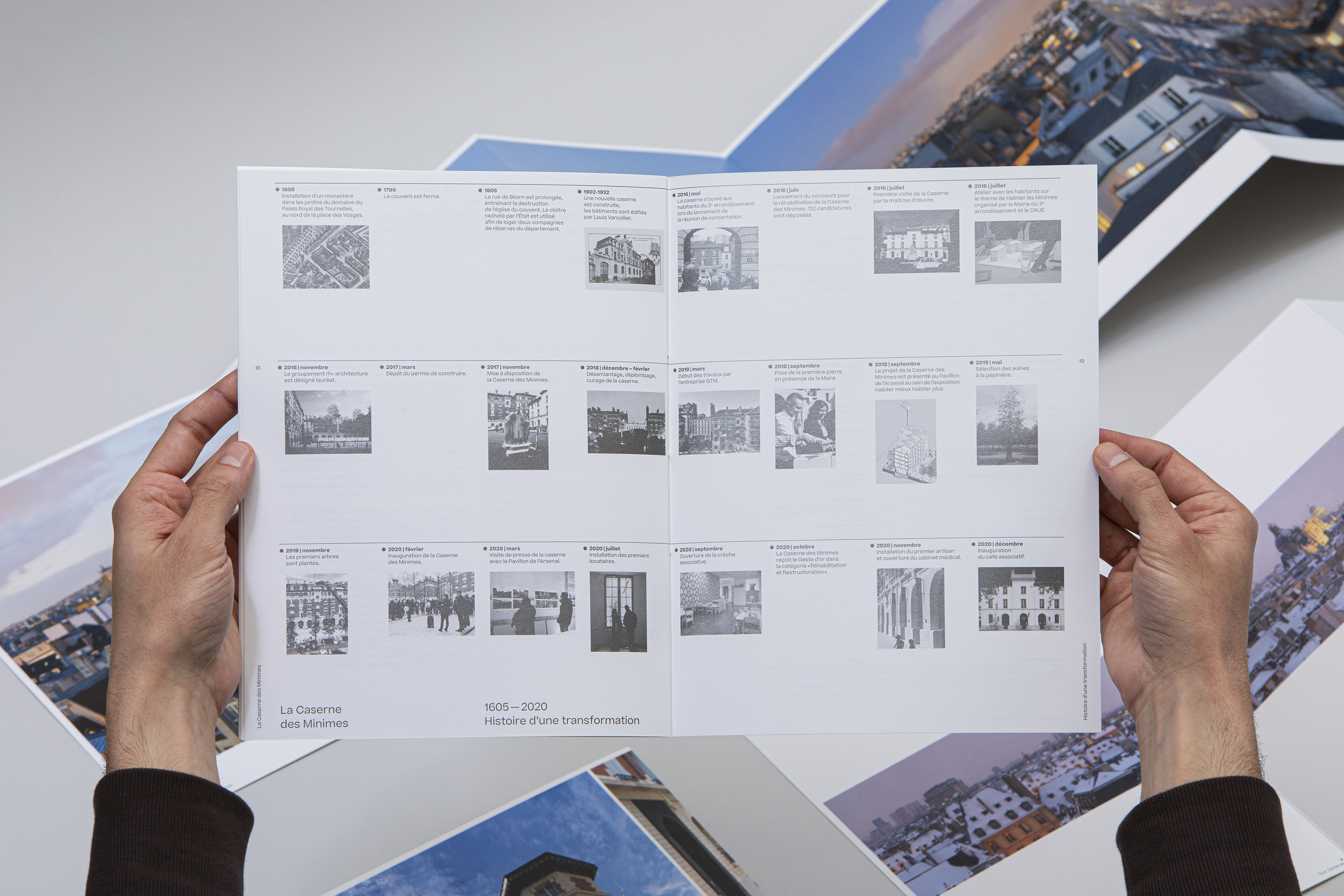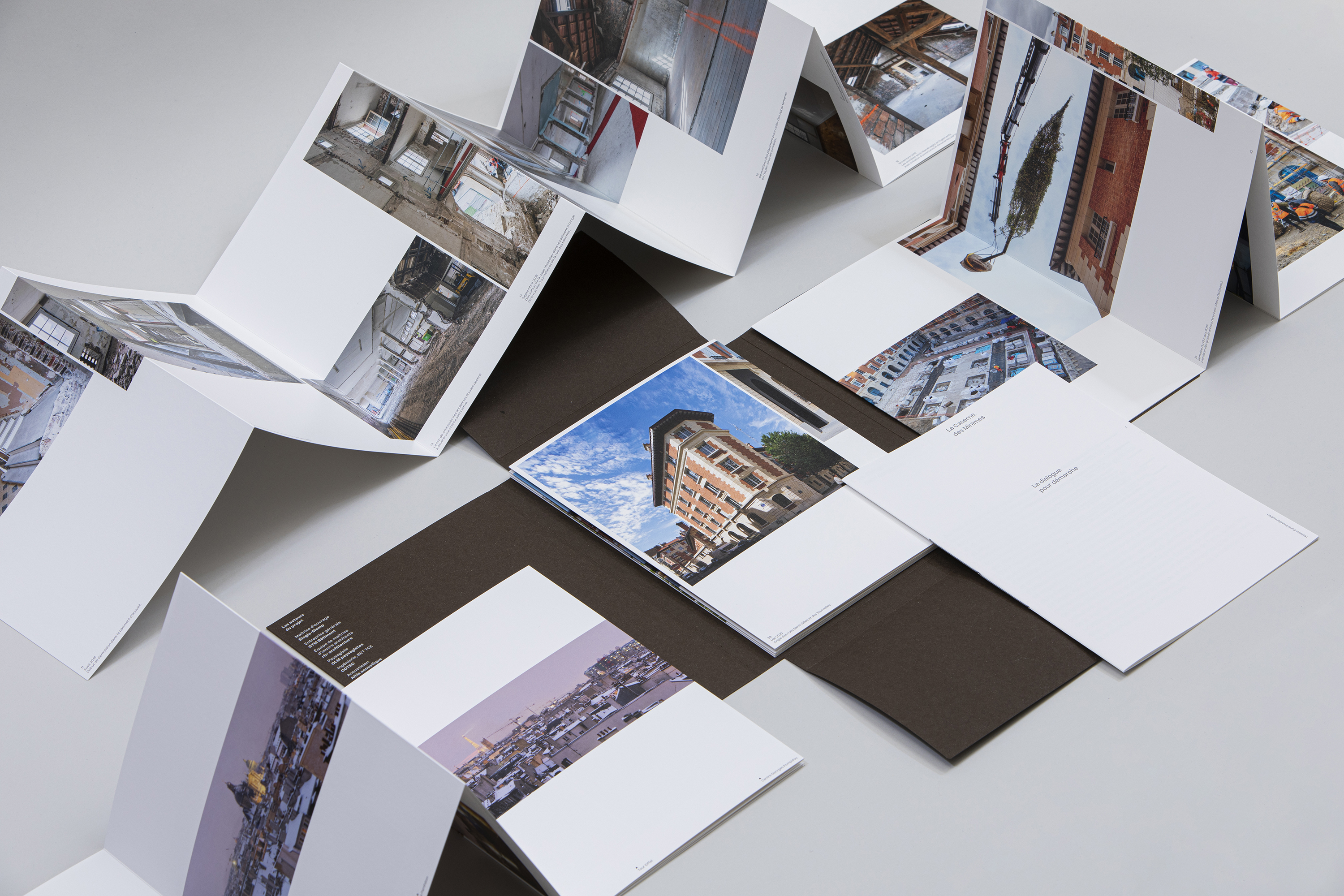 La documentation photographique accumulée dès le début du chantier par les architectes constitue la matière première de la publication. Quatre leporelli retracent huit promenades thématiques. La transformation de la Caserne s’y opère au fil des pages.