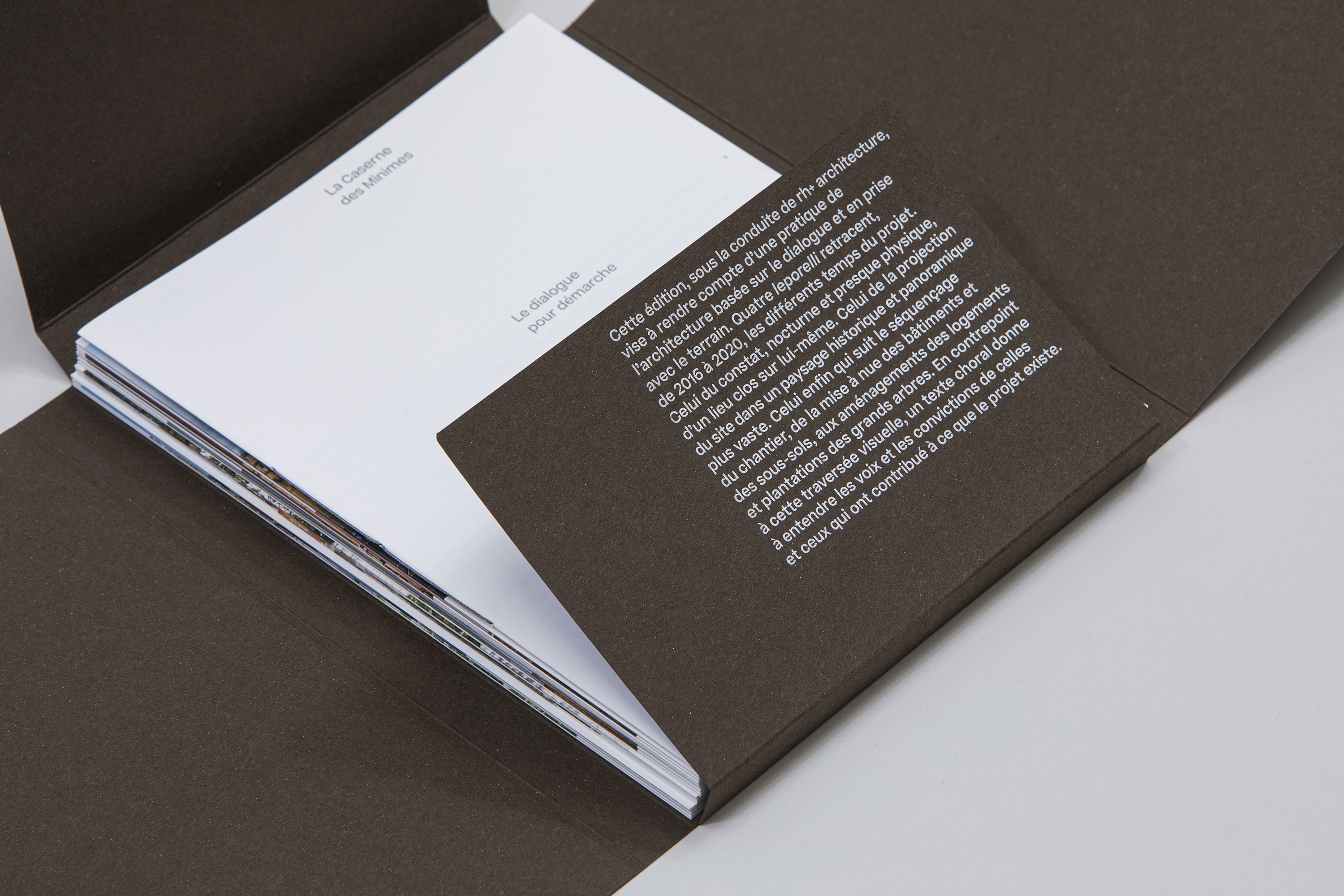En guise de couverture, une enveloppe vient protéger les différents livrets qui constituent l’ouvrage. Façonnée dans un carton matiéré et soigneusement sérigraphiée, elle est, à l’instar de l’architecture de rh+, d’une généreuse simplicité.