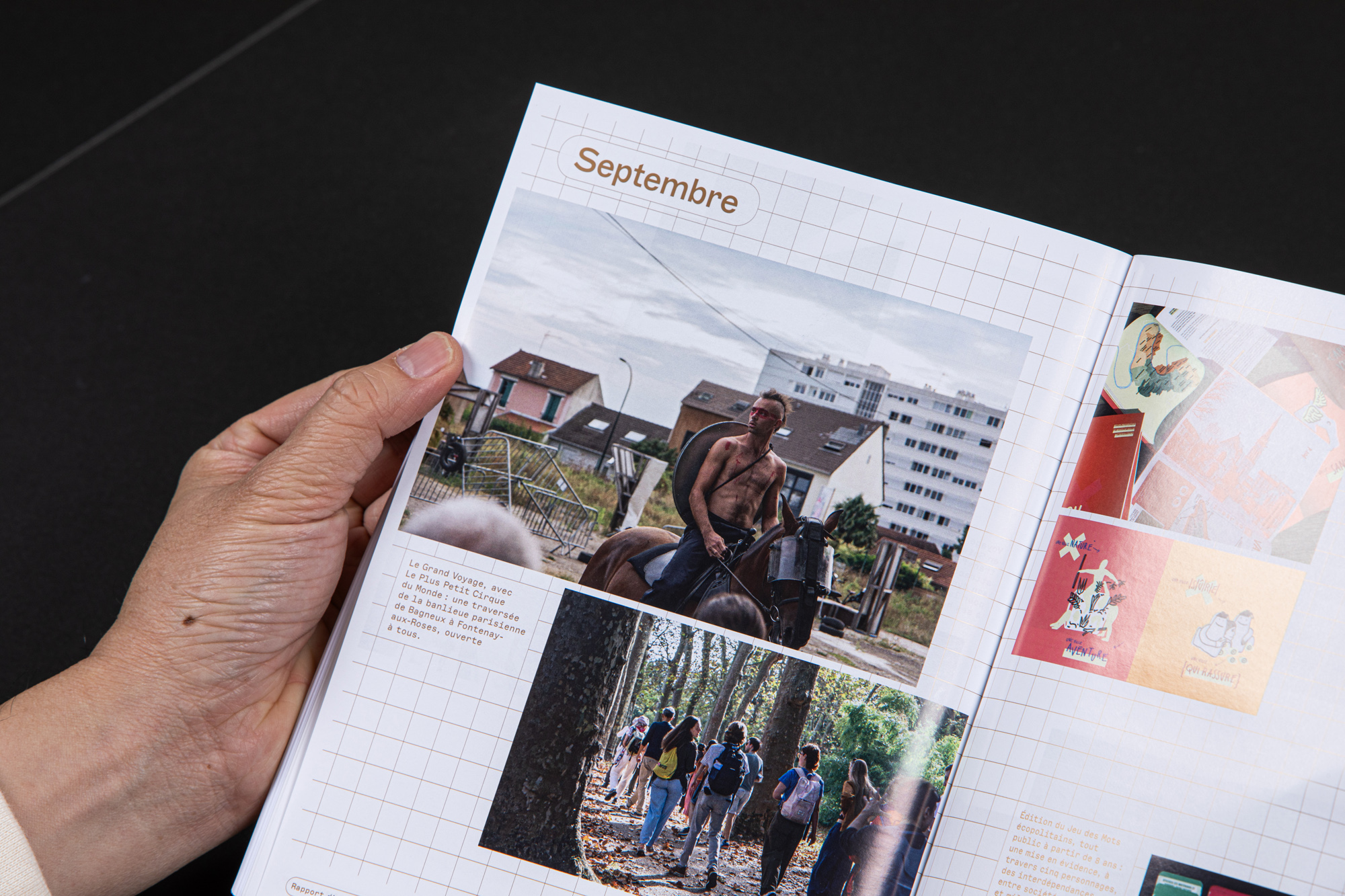 Deux cahiers de photos, imprimées en quadrichromie, sont encartés dans le document monochrome. Le premier revient sur le projet phare de l’année: la commande de deux missions photographiques ayant donné lieu à une publication, une exposition et diverses animations.