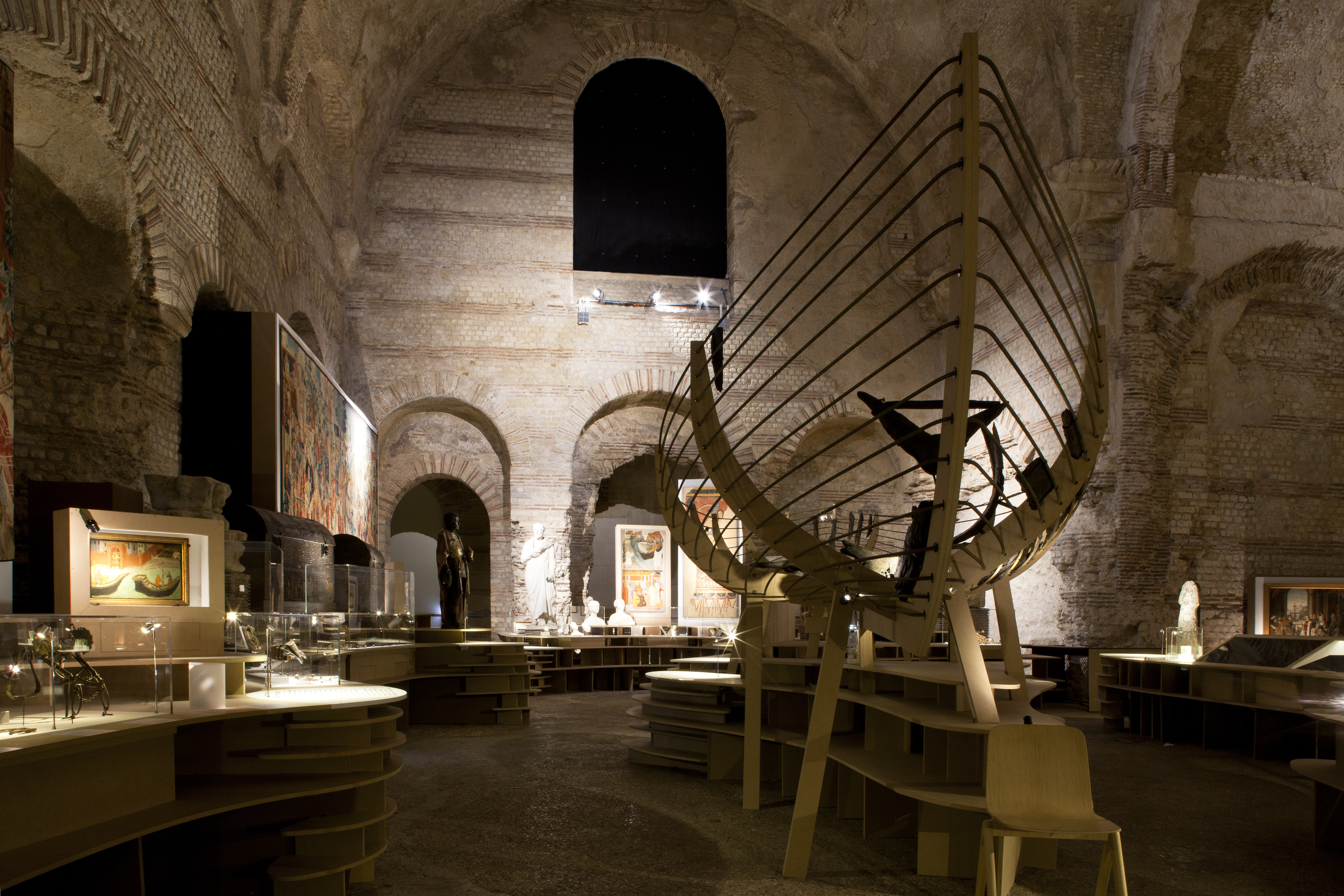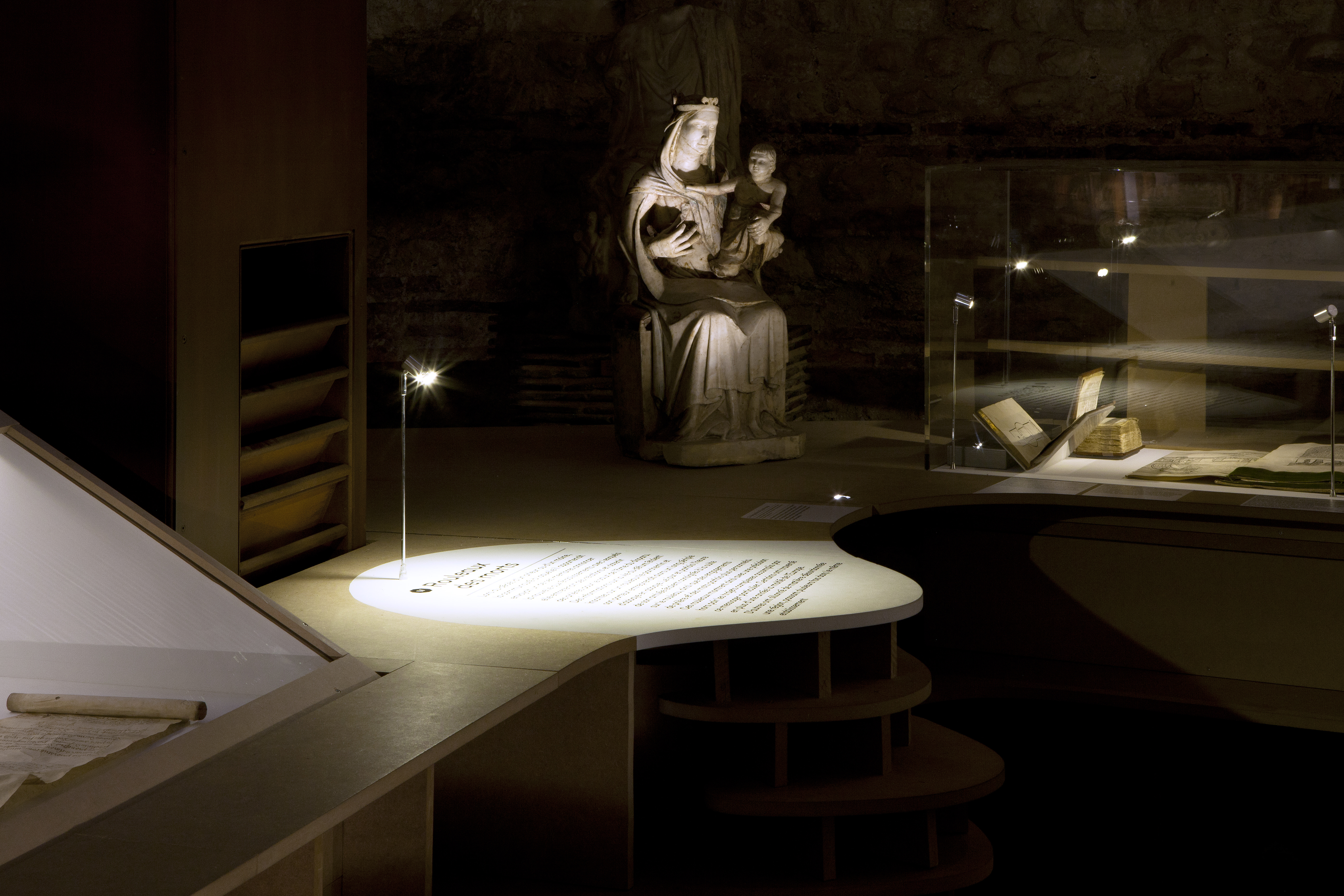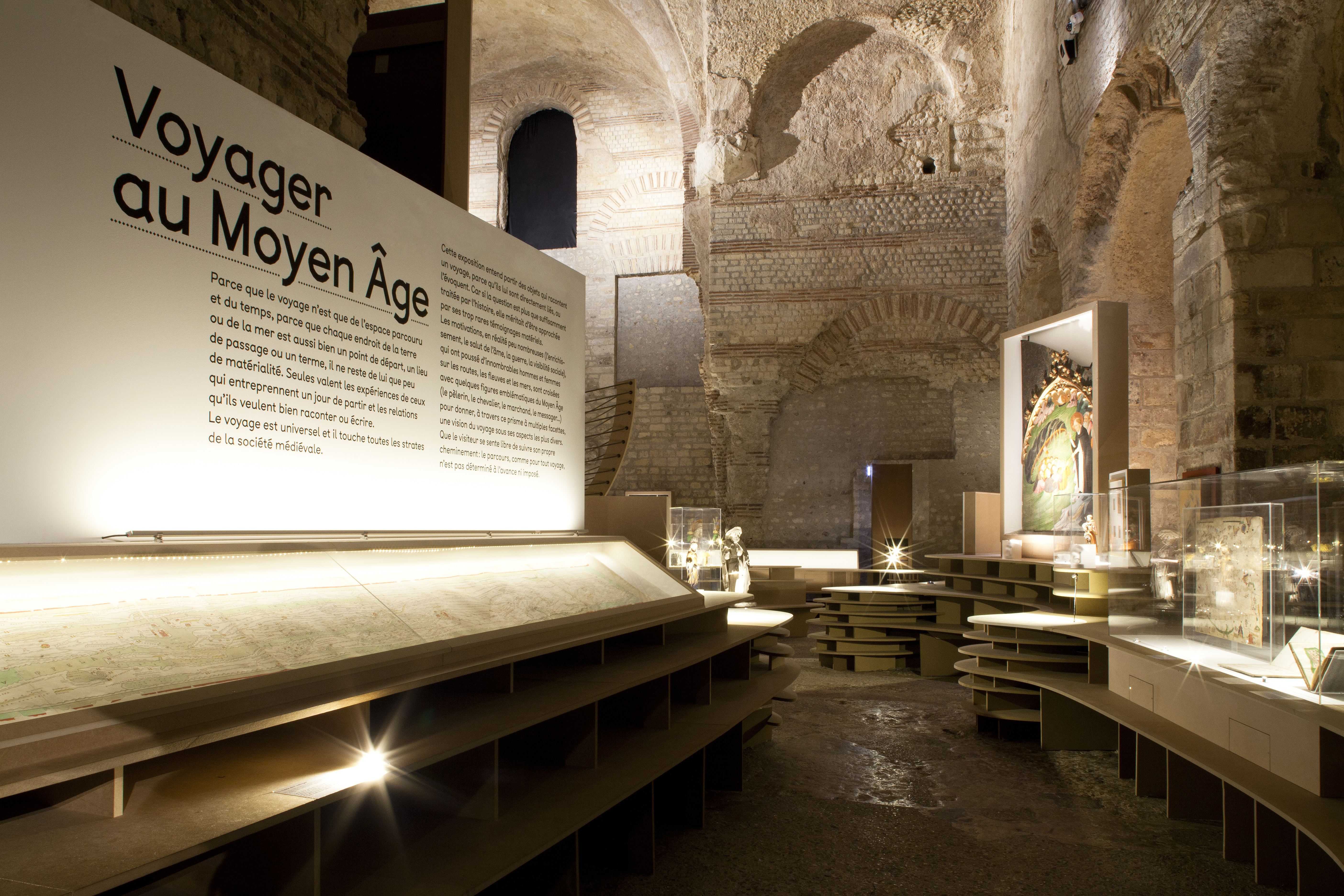 Installée dans le frigidarium du musée, cette exposition révèle la manière dont le voyage est envisagé et vécu au Moyen Âge. La scénographie dessine un paysage fluide dans lequel se nichent les pièces à découvrir dont l’impressionnante table de Peutinger et le monumental Codex Amiatinus. Sobre, à même le support scénographique, la signalétique accompagne la déambulation de visiteur tout au long l’exposition.