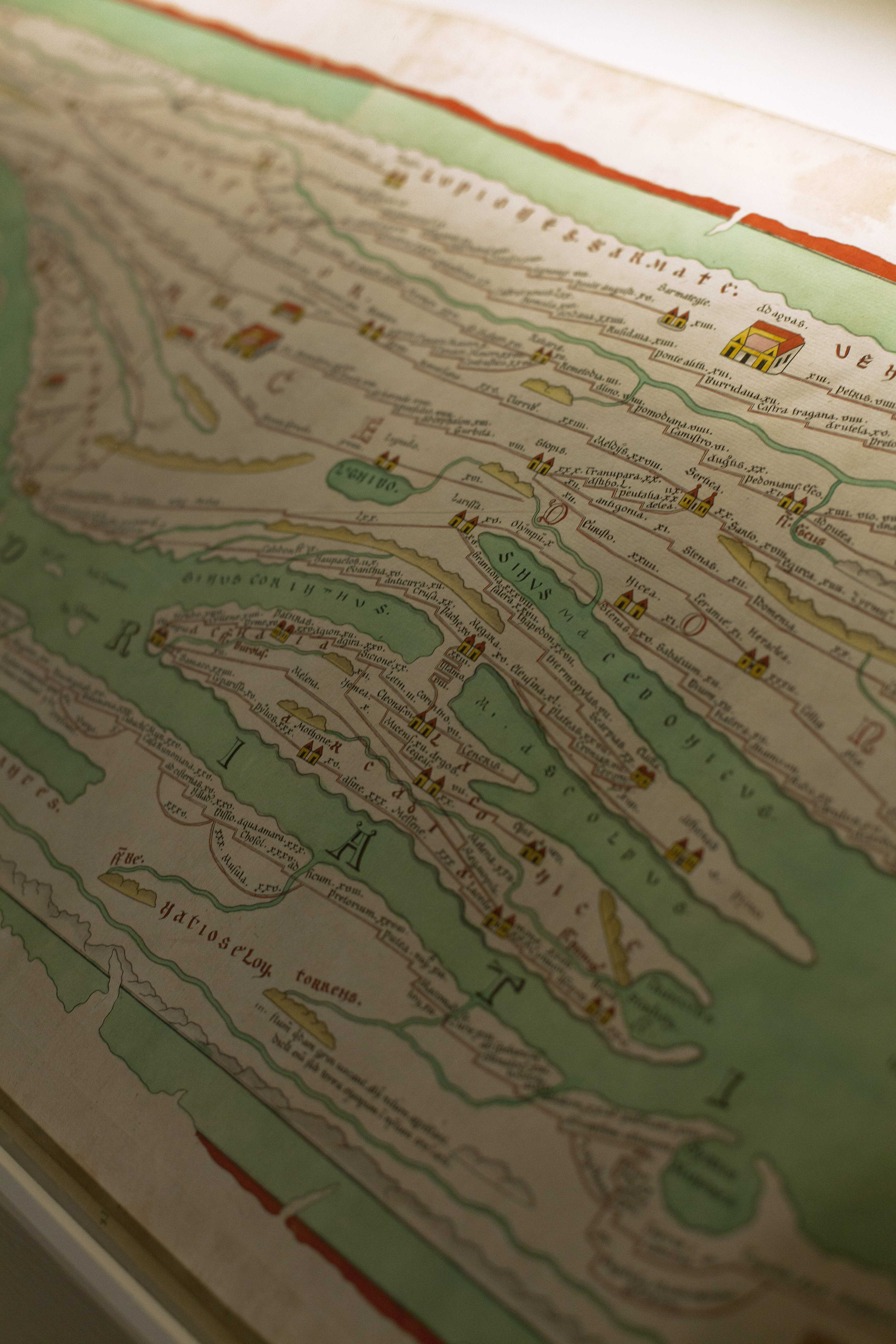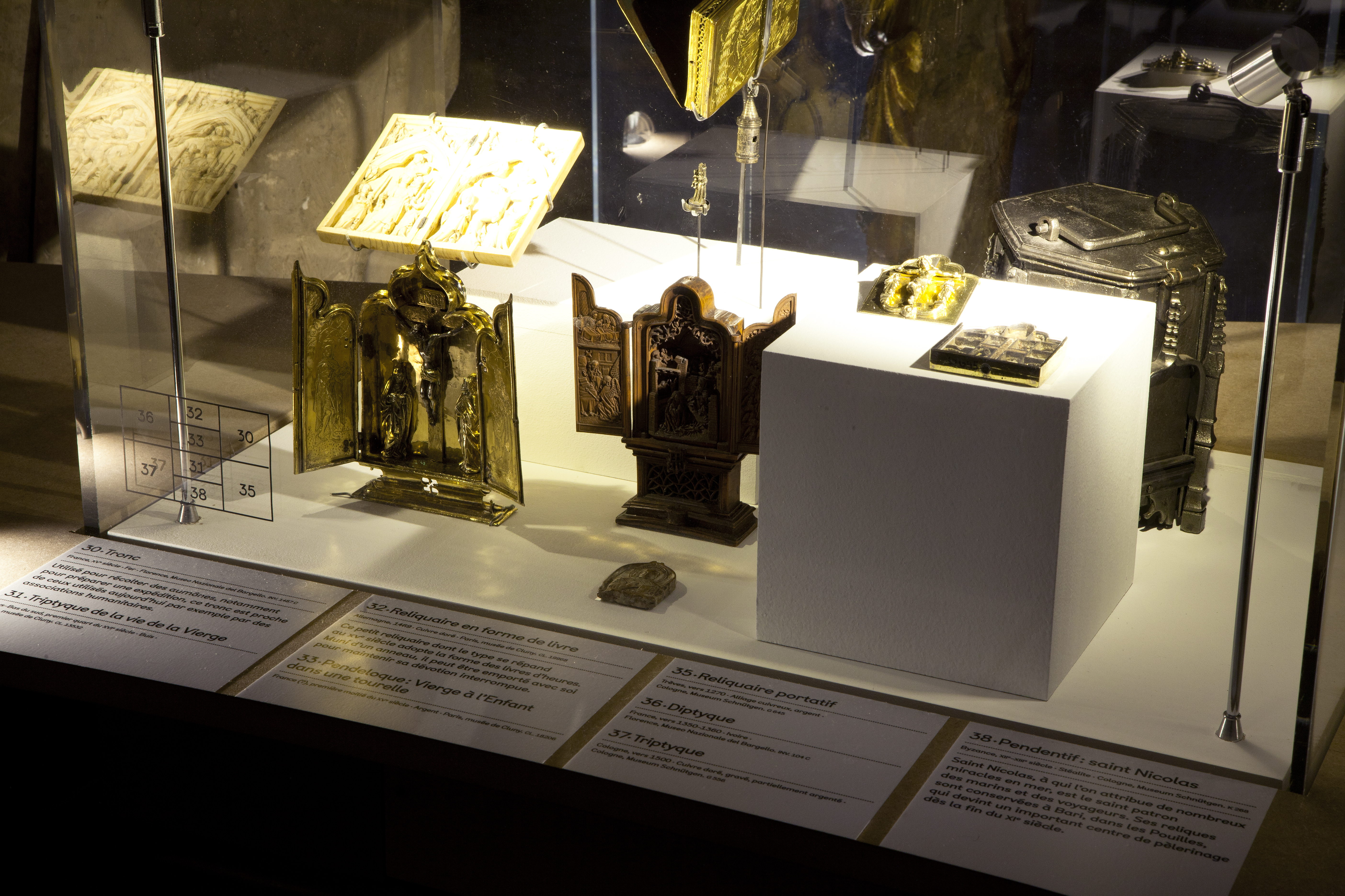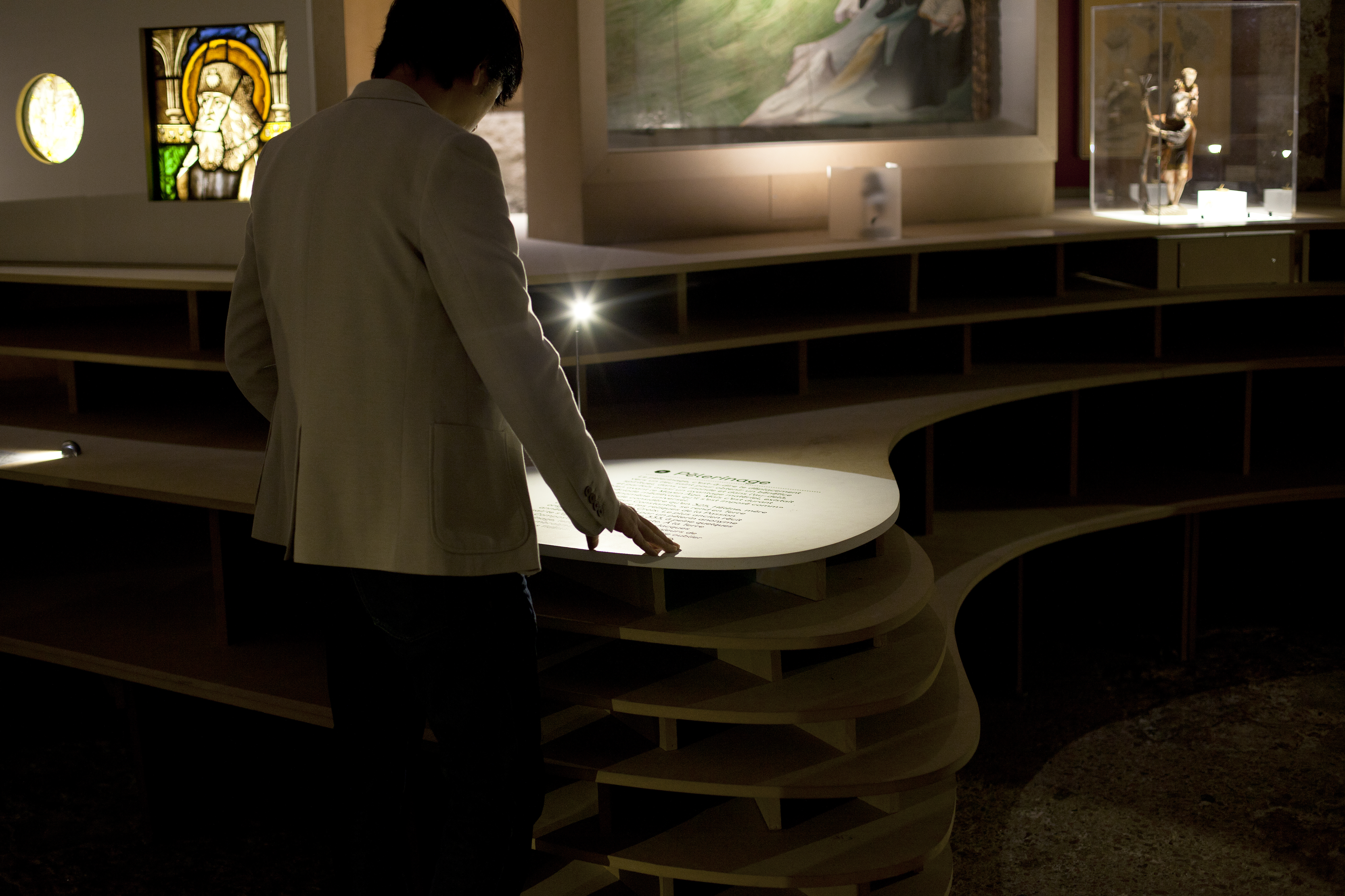 Installée dans le frigidarium du musée, cette exposition révèle la manière dont le voyage est envisagé et vécu au Moyen Âge. La scénographie dessine un paysage fluide dans lequel se nichent les pièces à découvrir dont l’impressionnante table de Peutinger et le monumental Codex Amiatinus. Sobre, à même le support scénographique, la signalétique accompagne la déambulation de visiteur tout au long l’exposition.