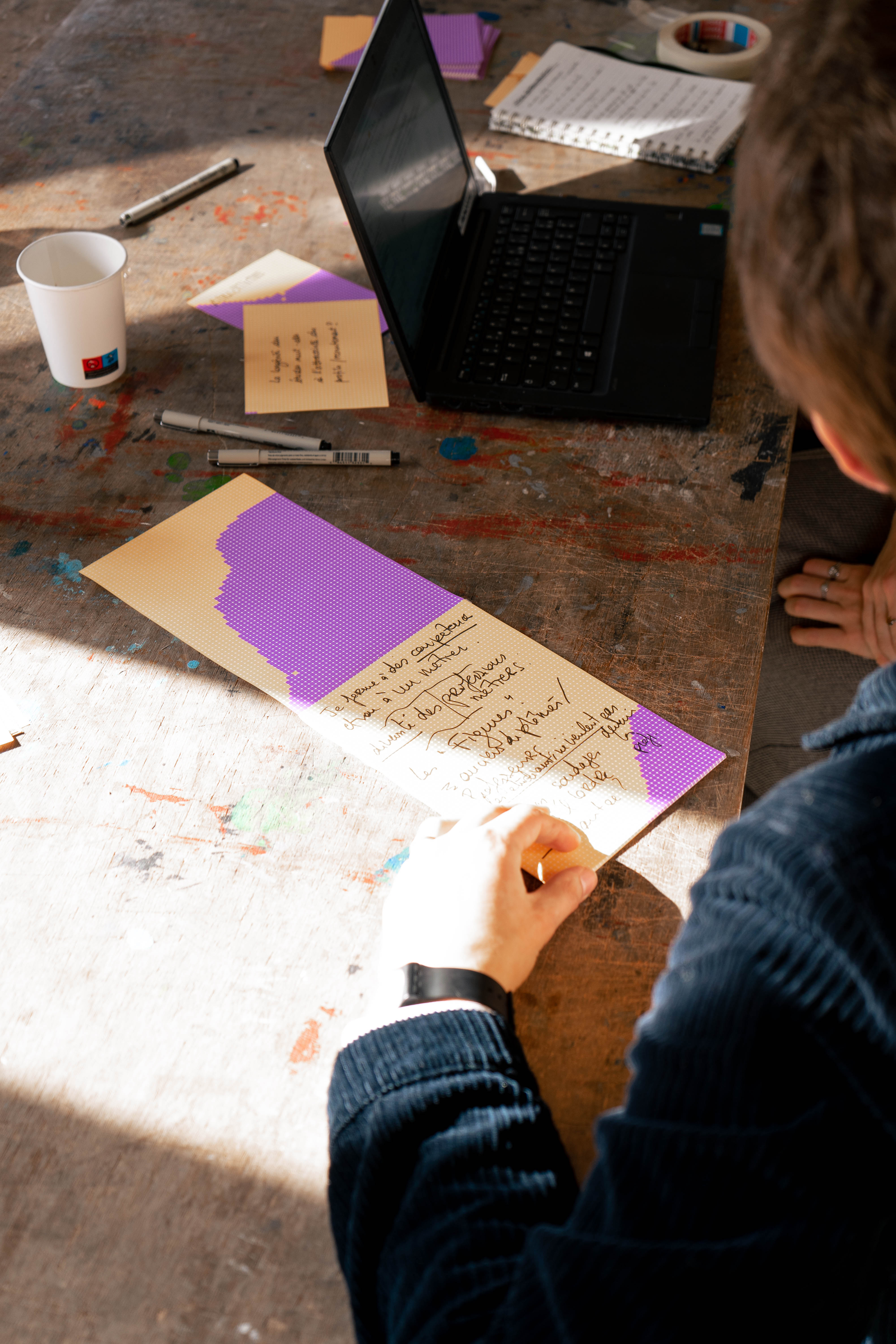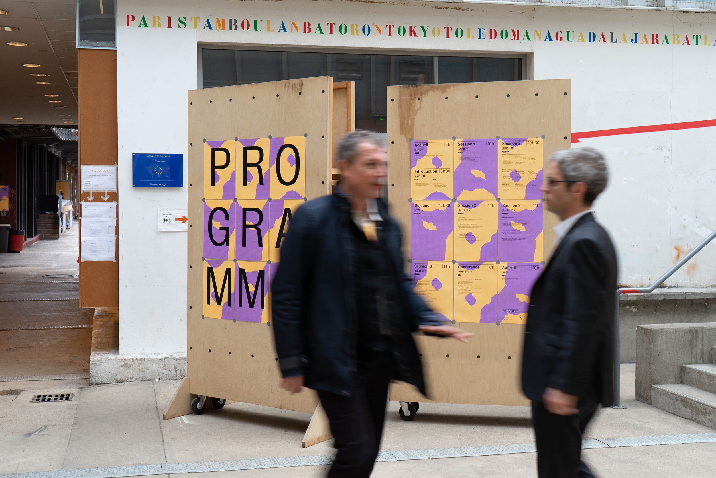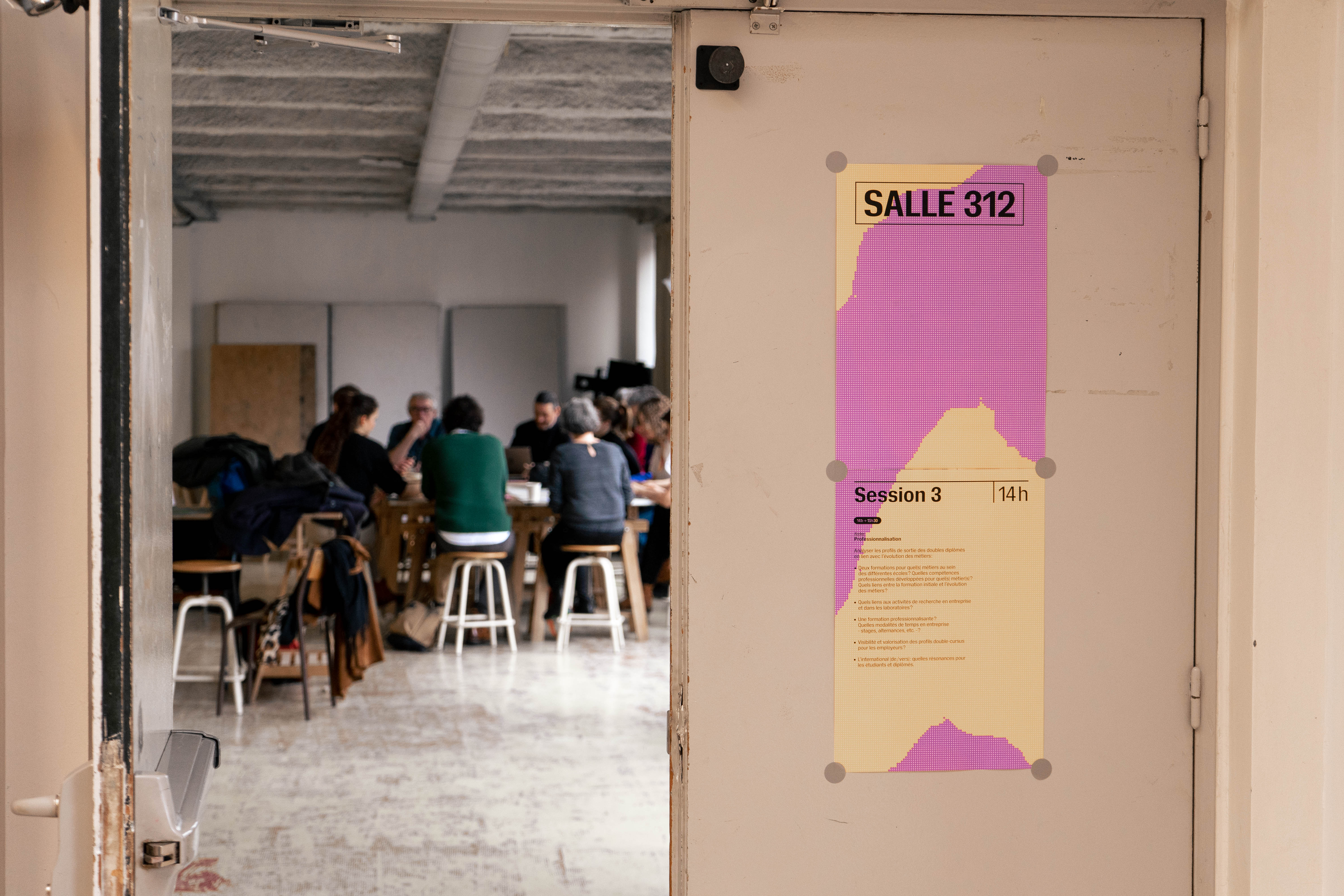 Le budget de communication de l’événement est modeste. Pour s’y tenir, nous proposons d’habiller d’une trame bicolore de grandes feuilles A2. Redécoupées en A5 et reliées, elles se muent en carnets de notes. Redécoupées en A3 et sur-imprimées de noir, avec l’imprimante laser de l’école, elles permettent de composer de grands affichages modulaires qui accrochent le regard.