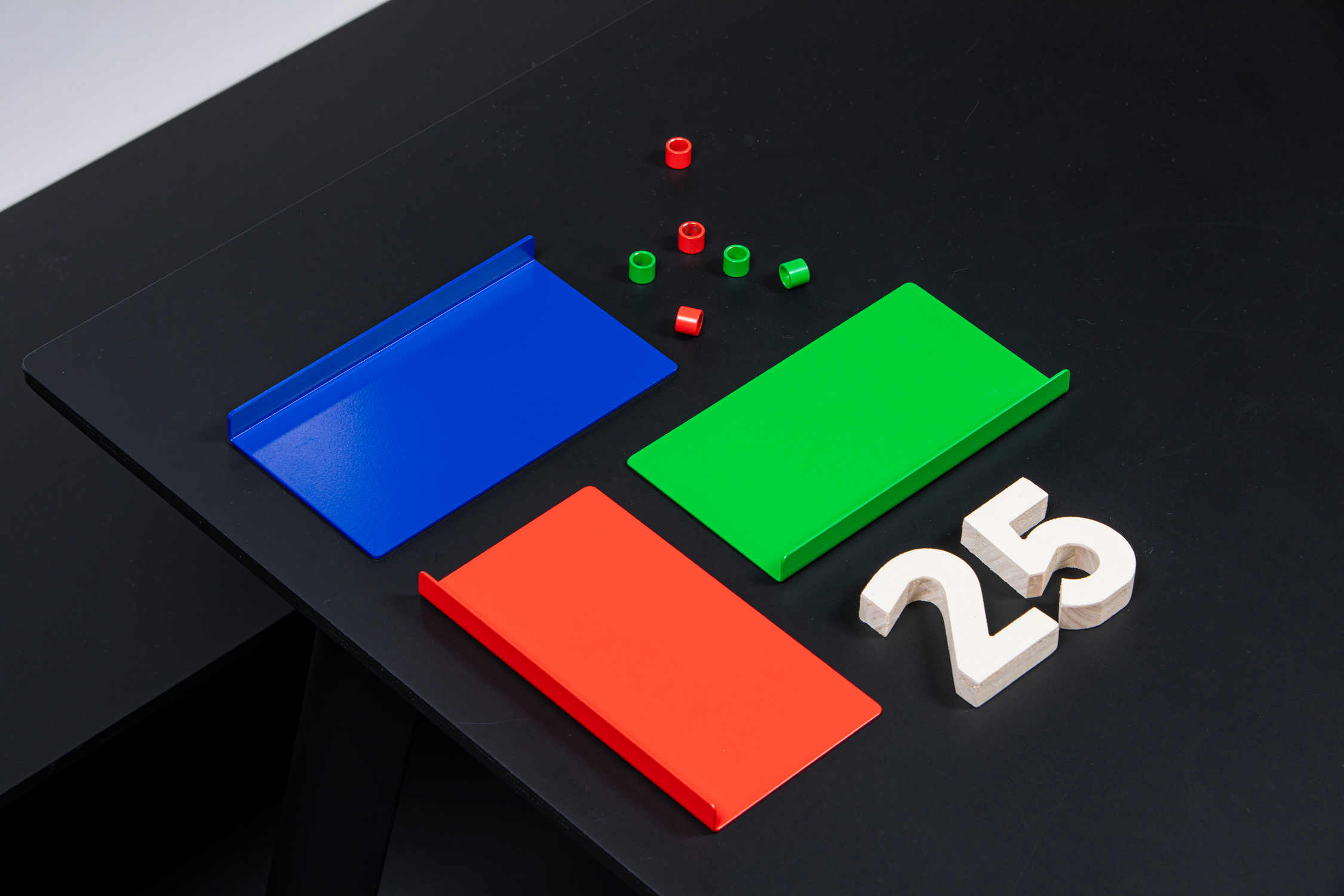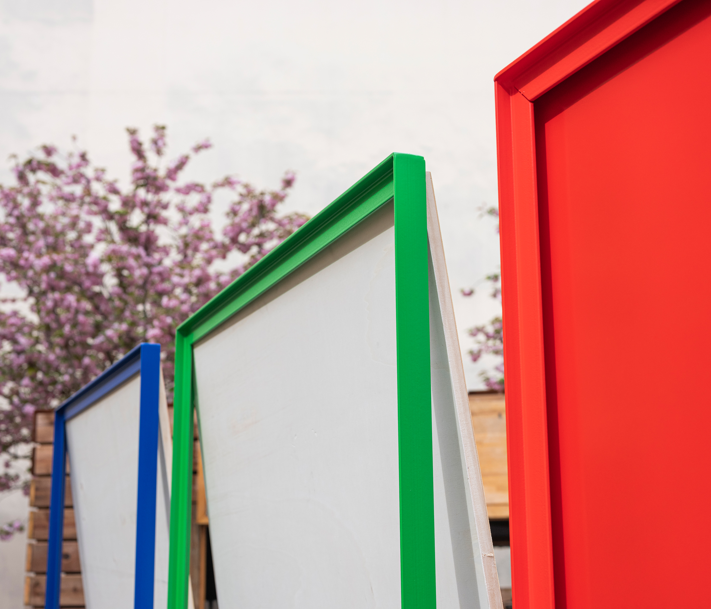 Rouge orientation, bleu identification, vert événementiel. Les trois tons nous servent à élaborer un système d’objets cohérent, capable d’affirmer sa présence dans un environnement disparate.