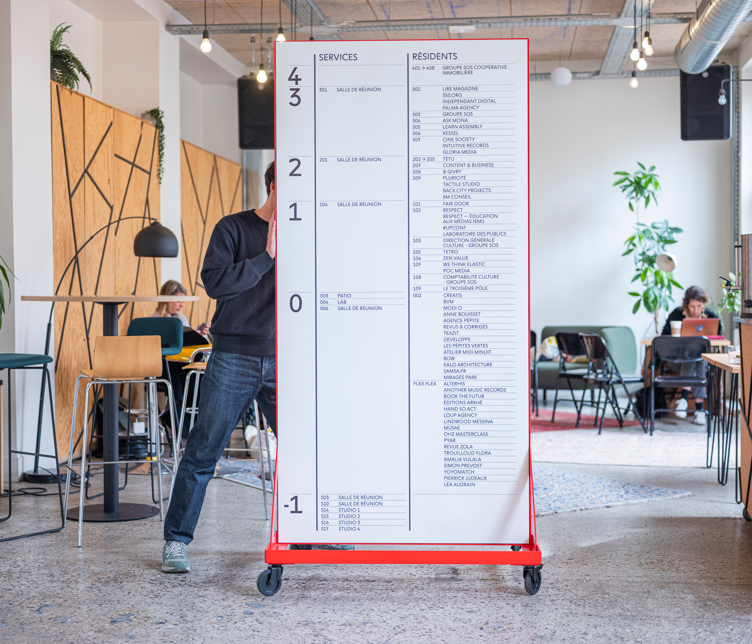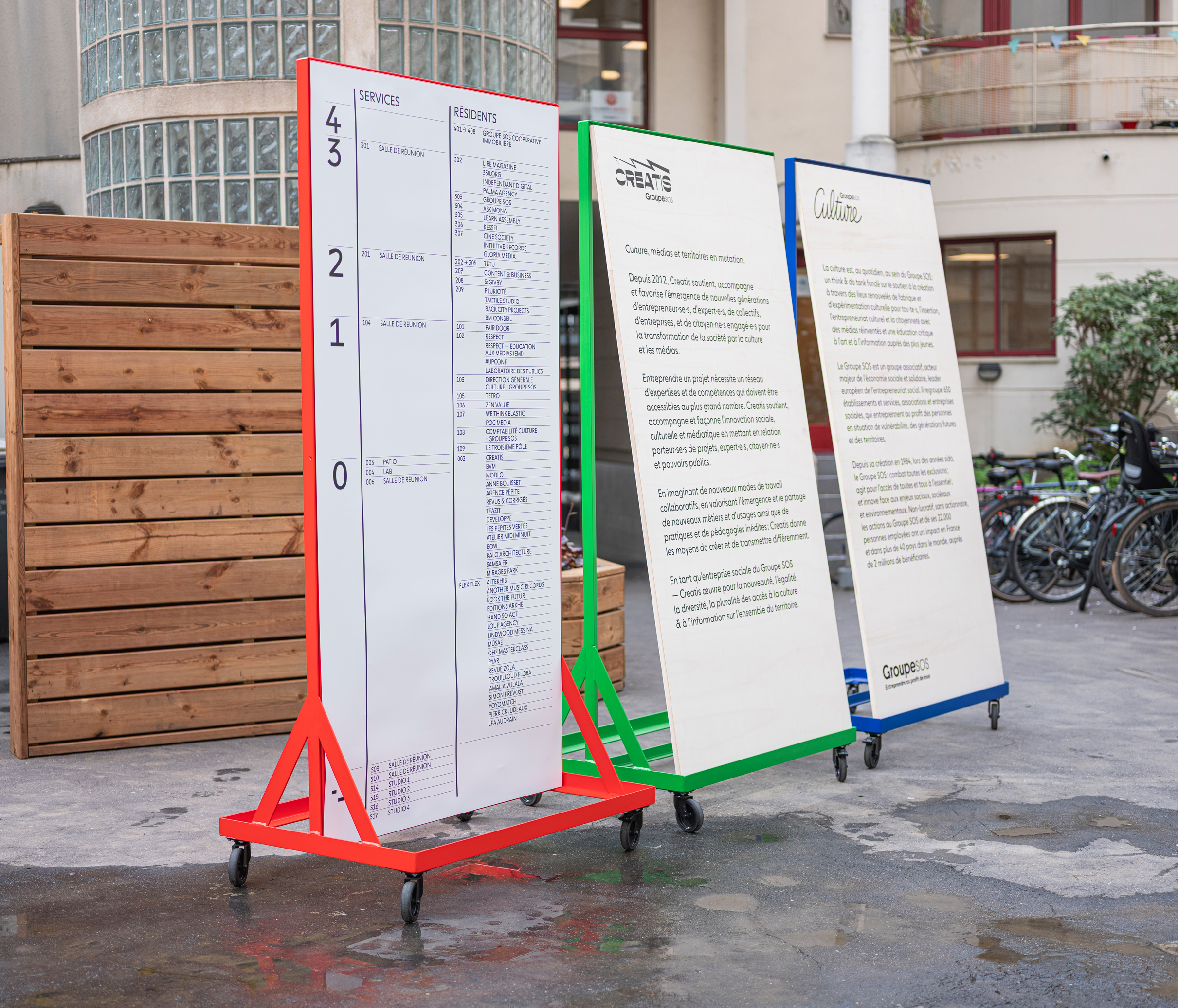 Situé dans le 11e arrondissement de Paris, la résidence Créatis abrite plusieurs entités du groupe SOS ainsi qu’une trentaine d’entreprises et d’indépendants, résidents de longue durée ou créatifs de passage. Dans ce contexte foisonnant, la signalétique doit installer un langage visuel commun. Point de départ du projet: le trio intensément coloré que nous avions déjà fait vibrer dans le Plaidoyer Culture du groupe.