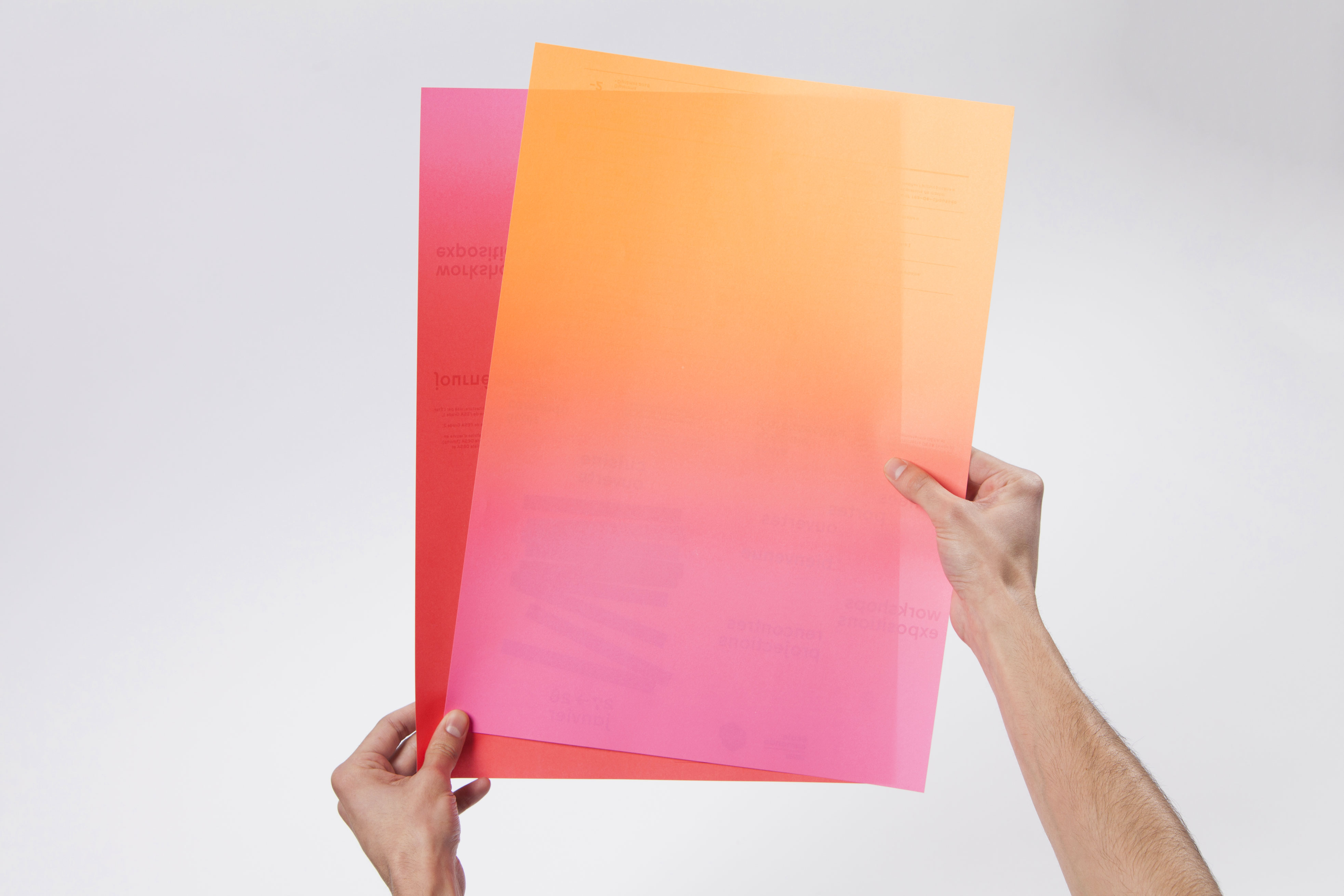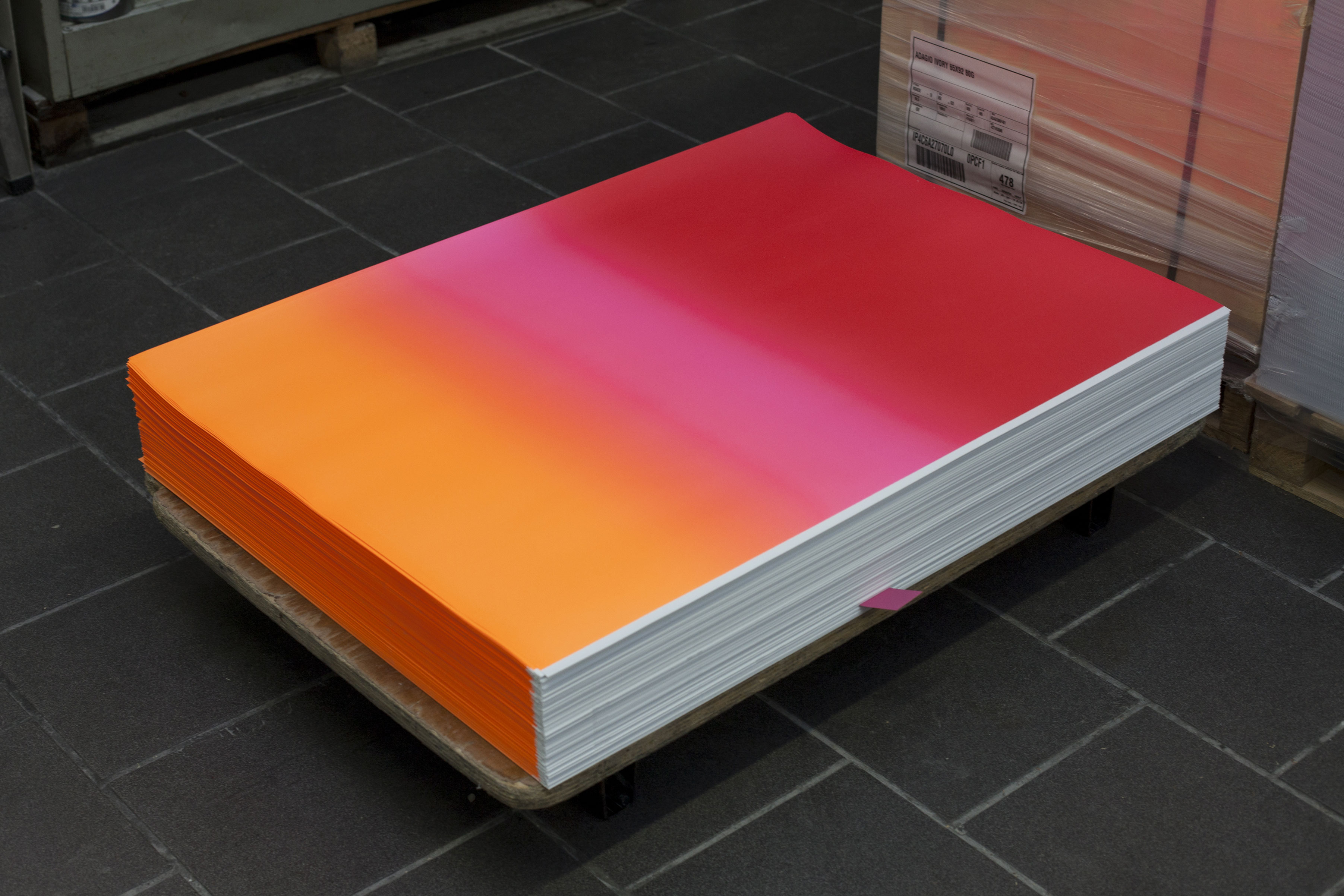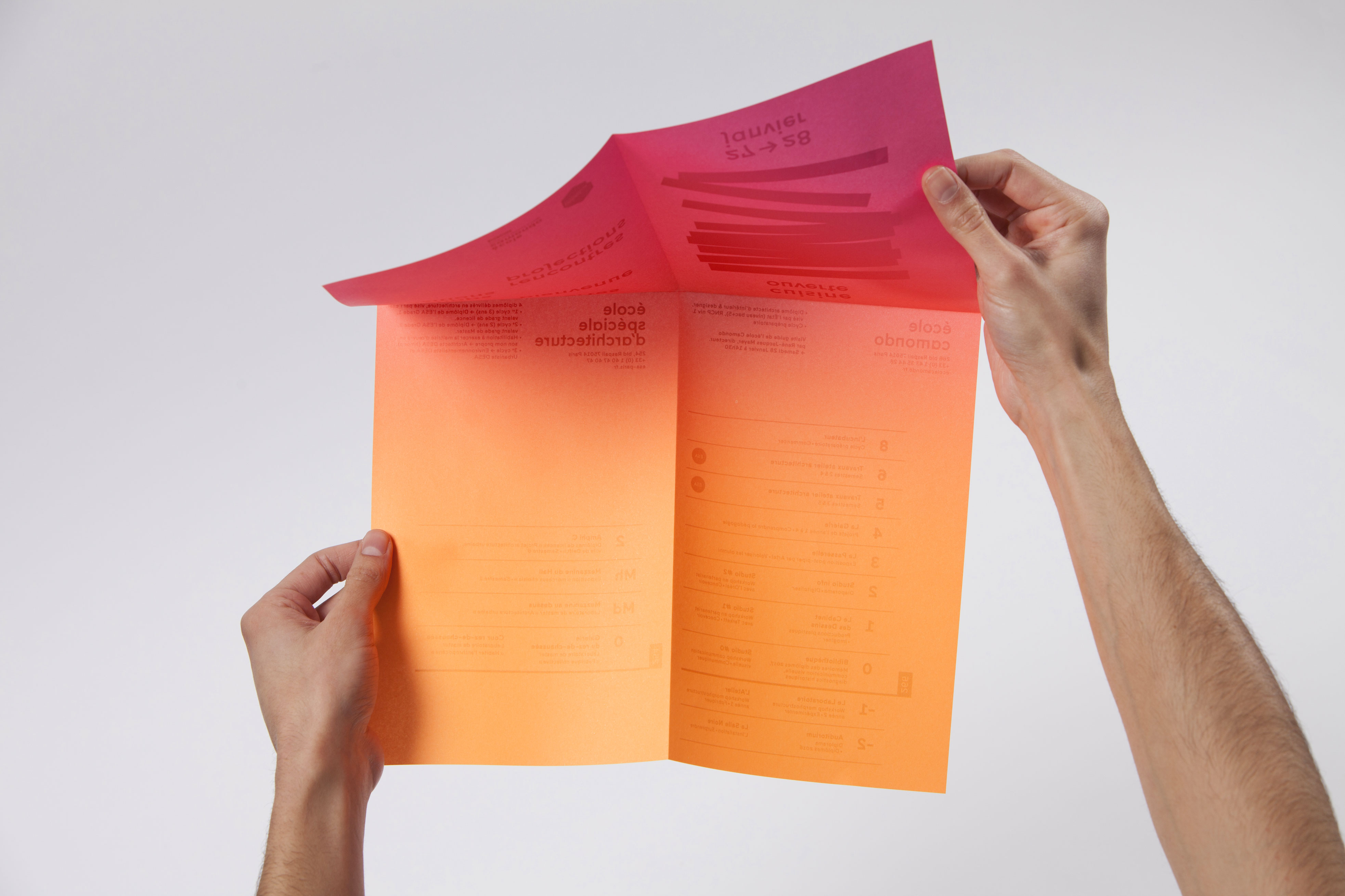 Un dégradé de couleurs fluo est réalisé directement dans l’encrier de la presse offset. Les grands formats, une fois découpés, servent à réaliser les cartons d’invitation et l’ensemble des supports pour la signalétique et l’aide à la visite. Associées au dégradé, nous avons dessiné une dizaine de formes, objets signaux de ces portes ouvertes.