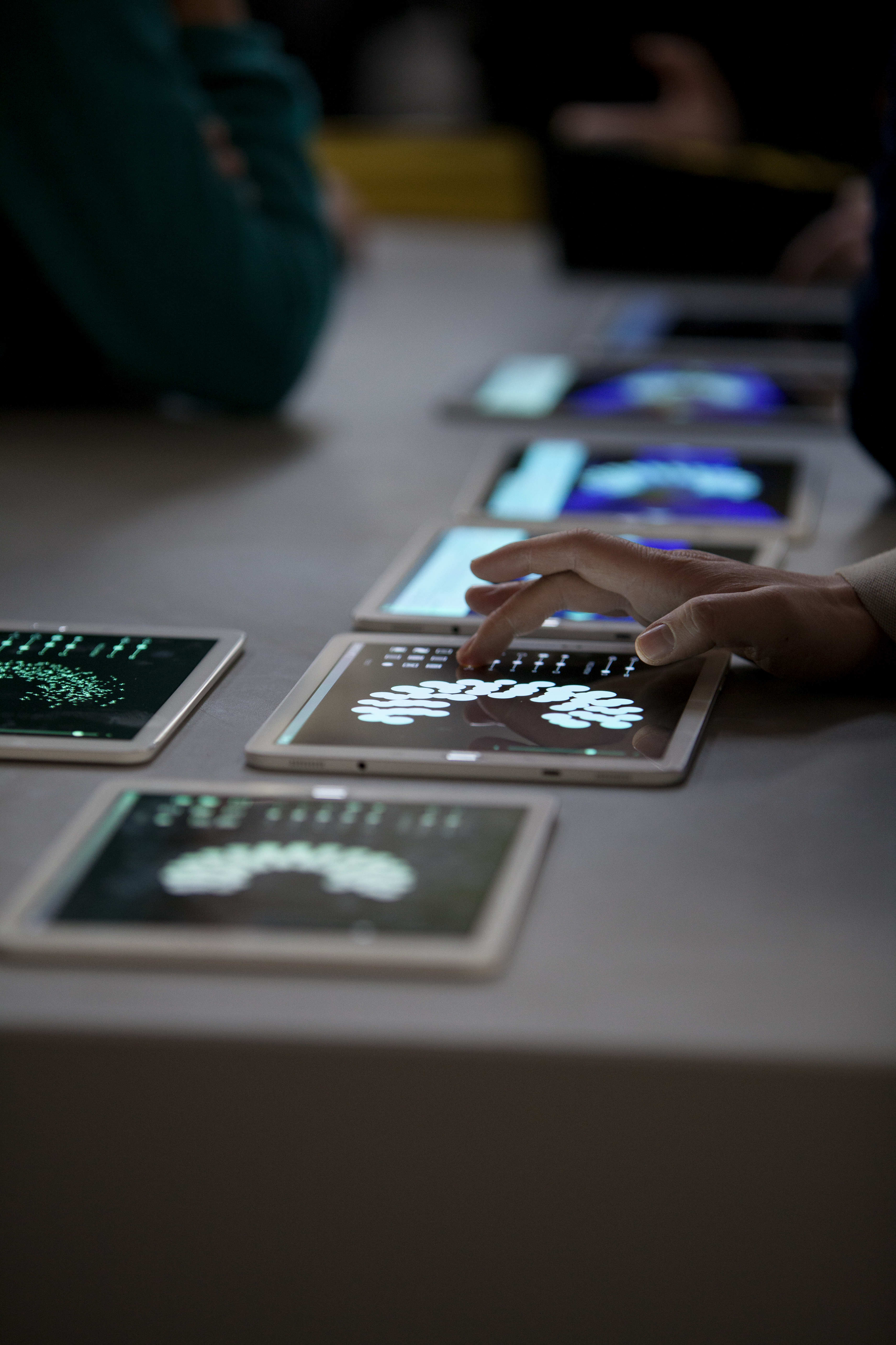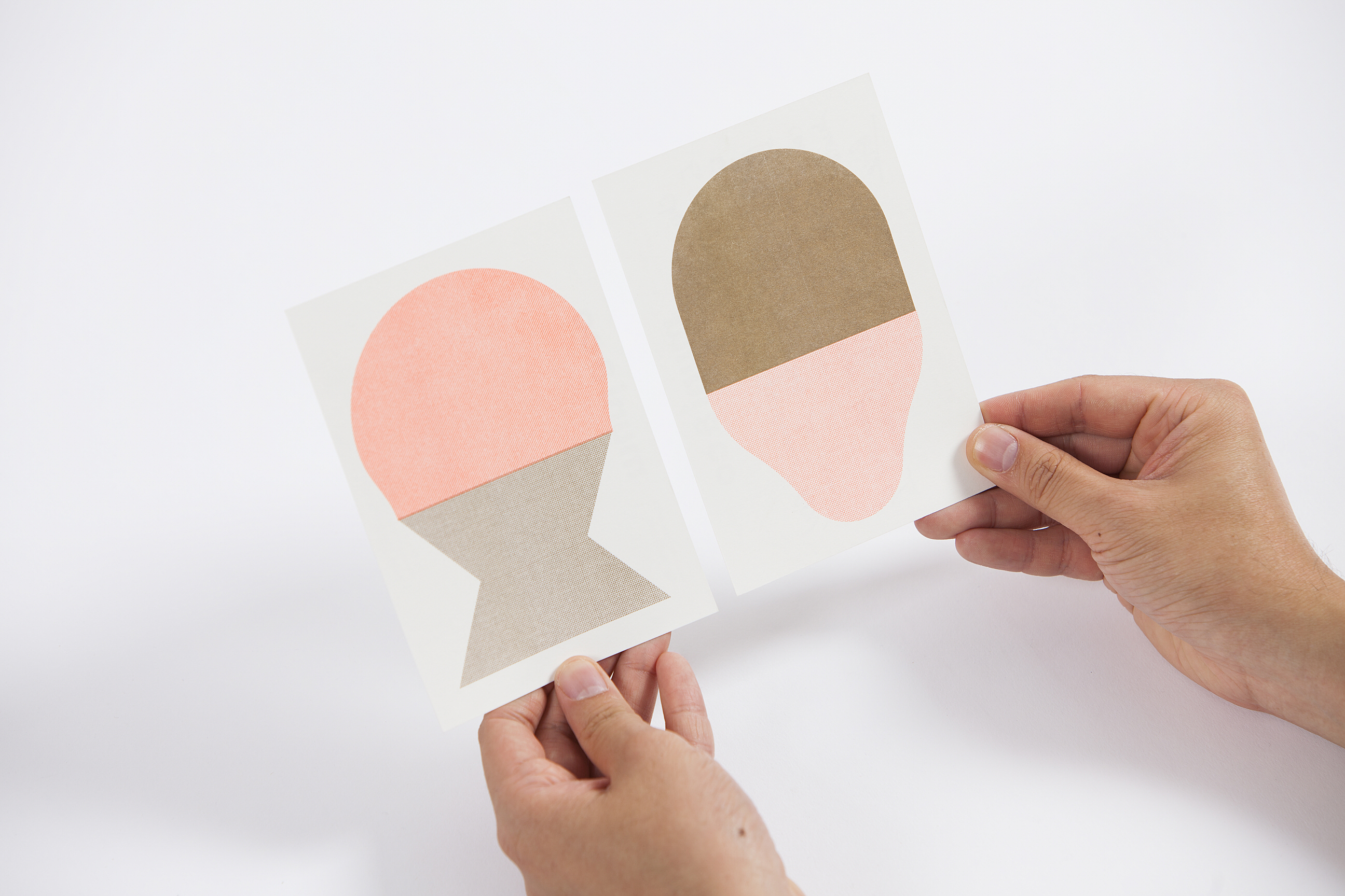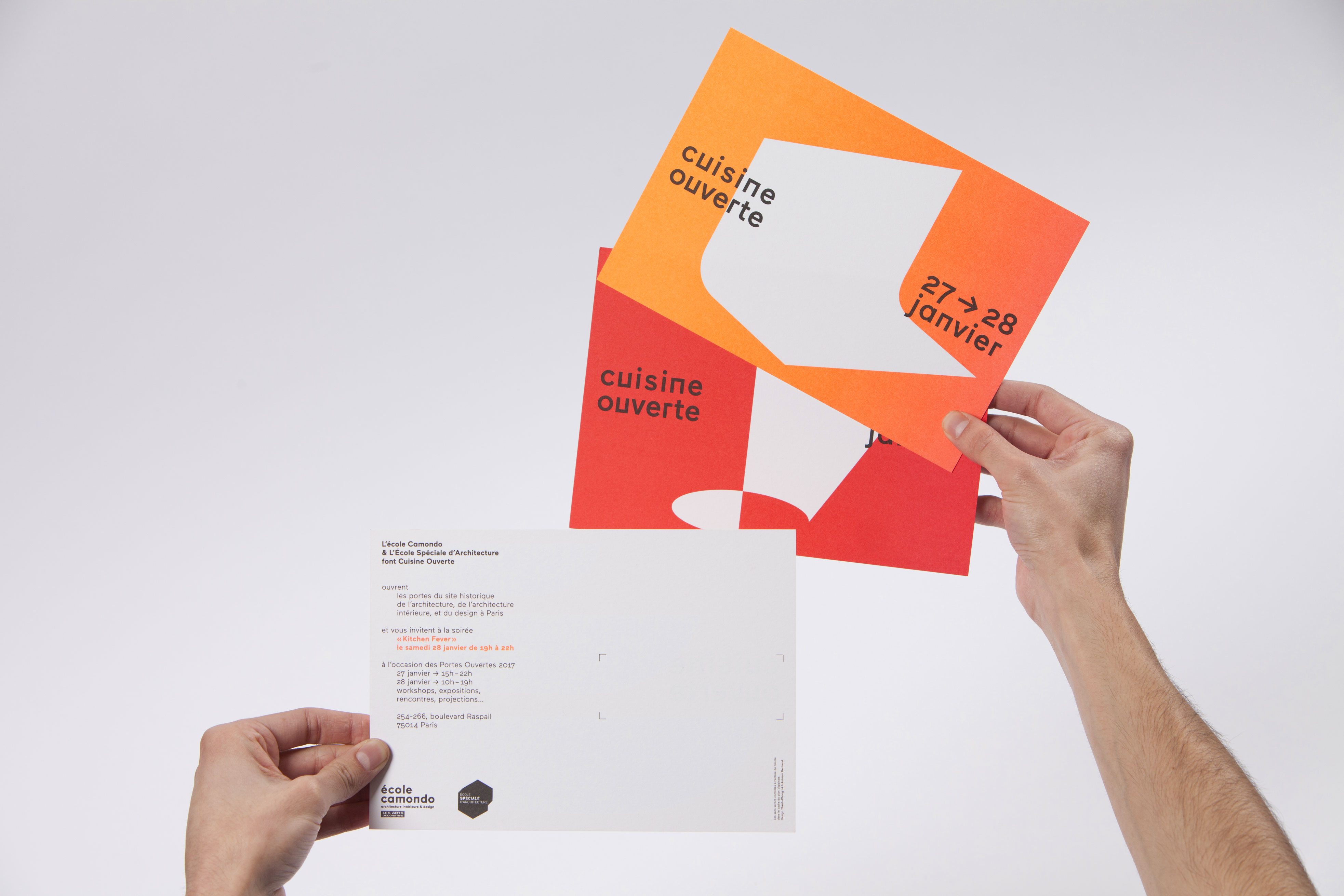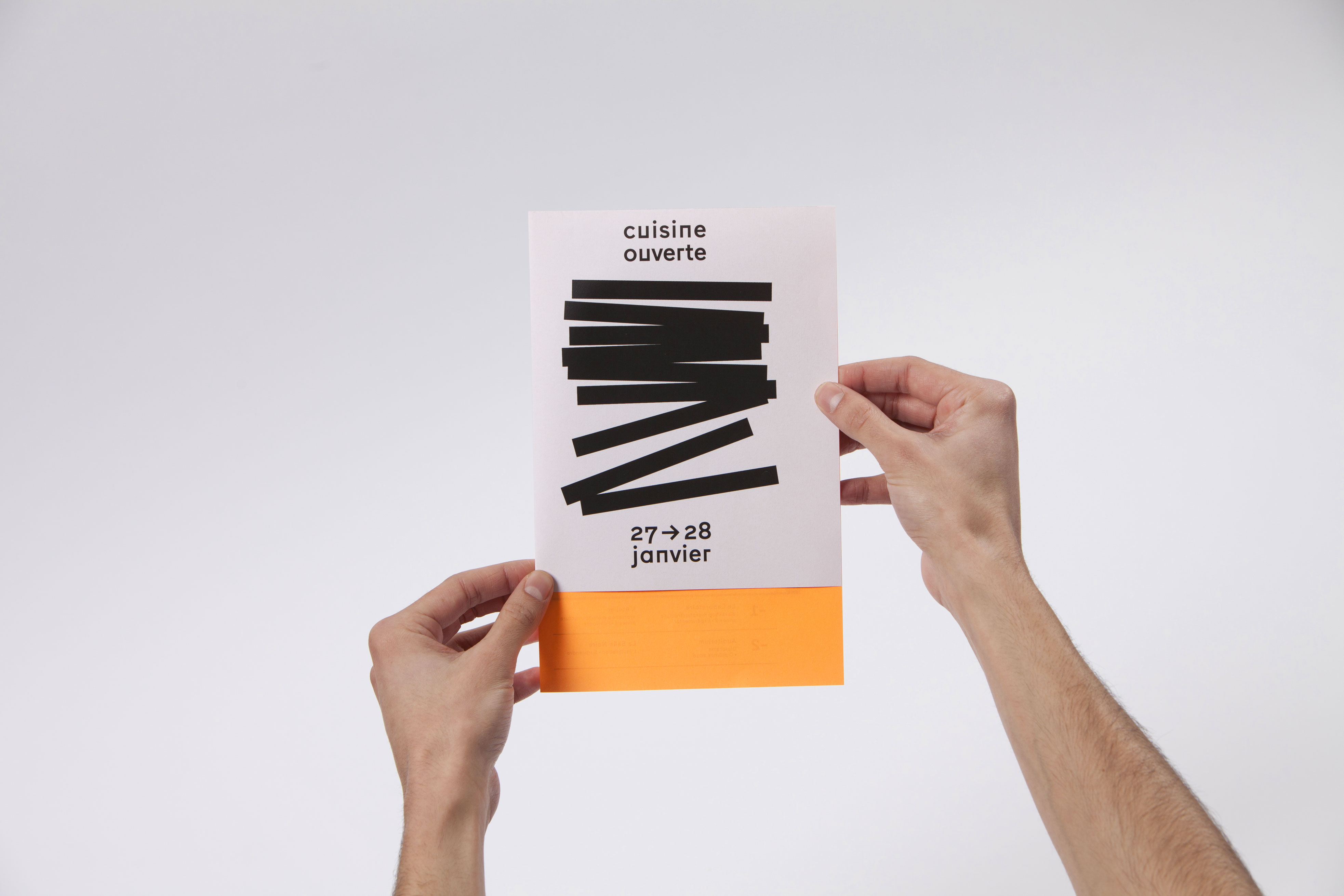 Un dégradé de couleurs fluo est réalisé directement dans l’encrier de la presse offset. Les grands formats, une fois découpés, servent à réaliser les cartons d’invitation et l’ensemble des supports pour la signalétique et l’aide à la visite. Associées au dégradé, nous avons dessiné une dizaine de formes, objets signaux de ces portes ouvertes.
