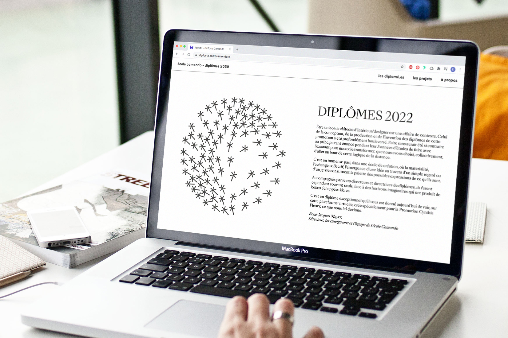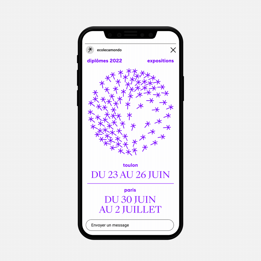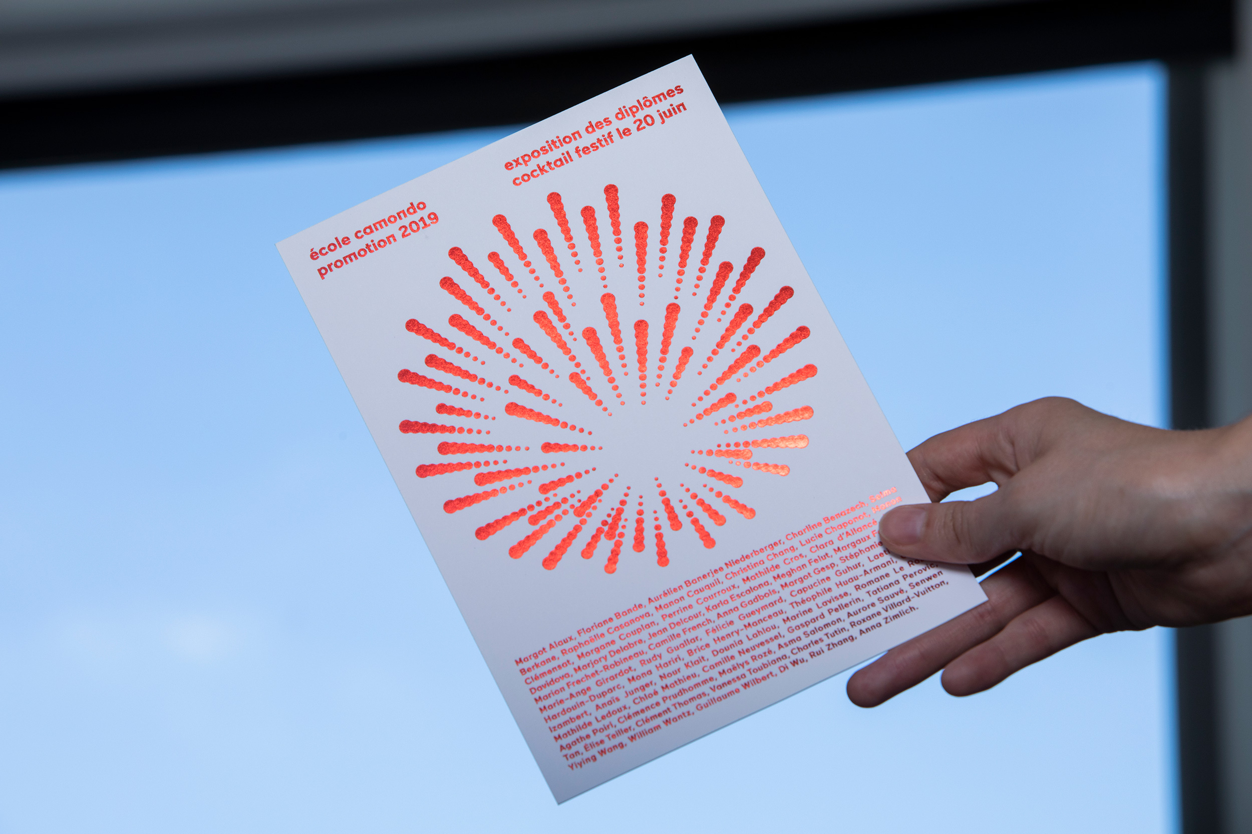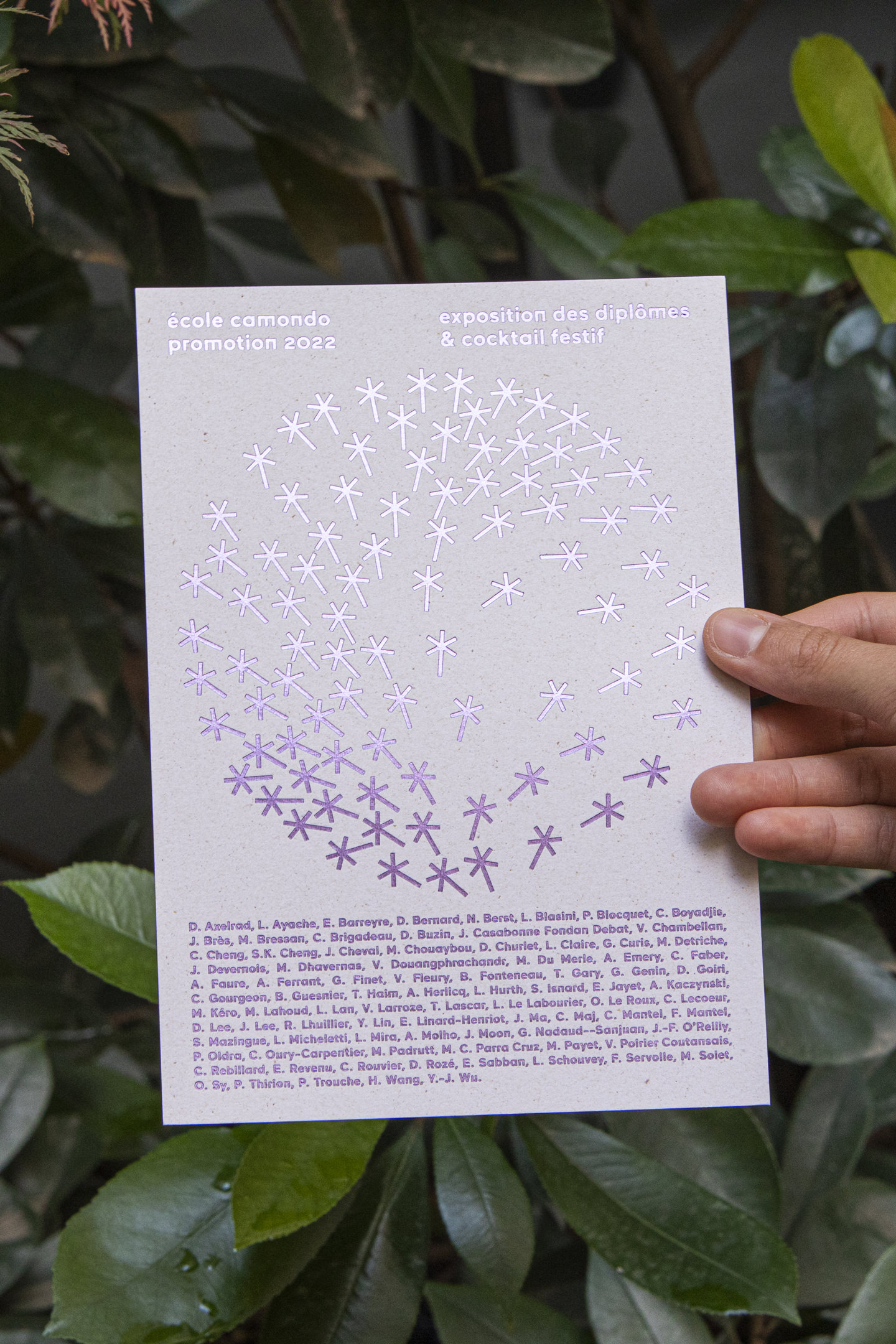 Camondo ne badine pas avec le diplôme. Chaque année, en mai, nous concevons les invitations à l’exposition clôturant le cursus de 5 ans en design et architecture d’intérieur. Dessiné comme un tout composé d’éléments multiples, en nombre strictement identique à celui des jeunes diplômés, le signe de ralliement de la promotion se déploie sur papier, dans l’espace et à l’écran.