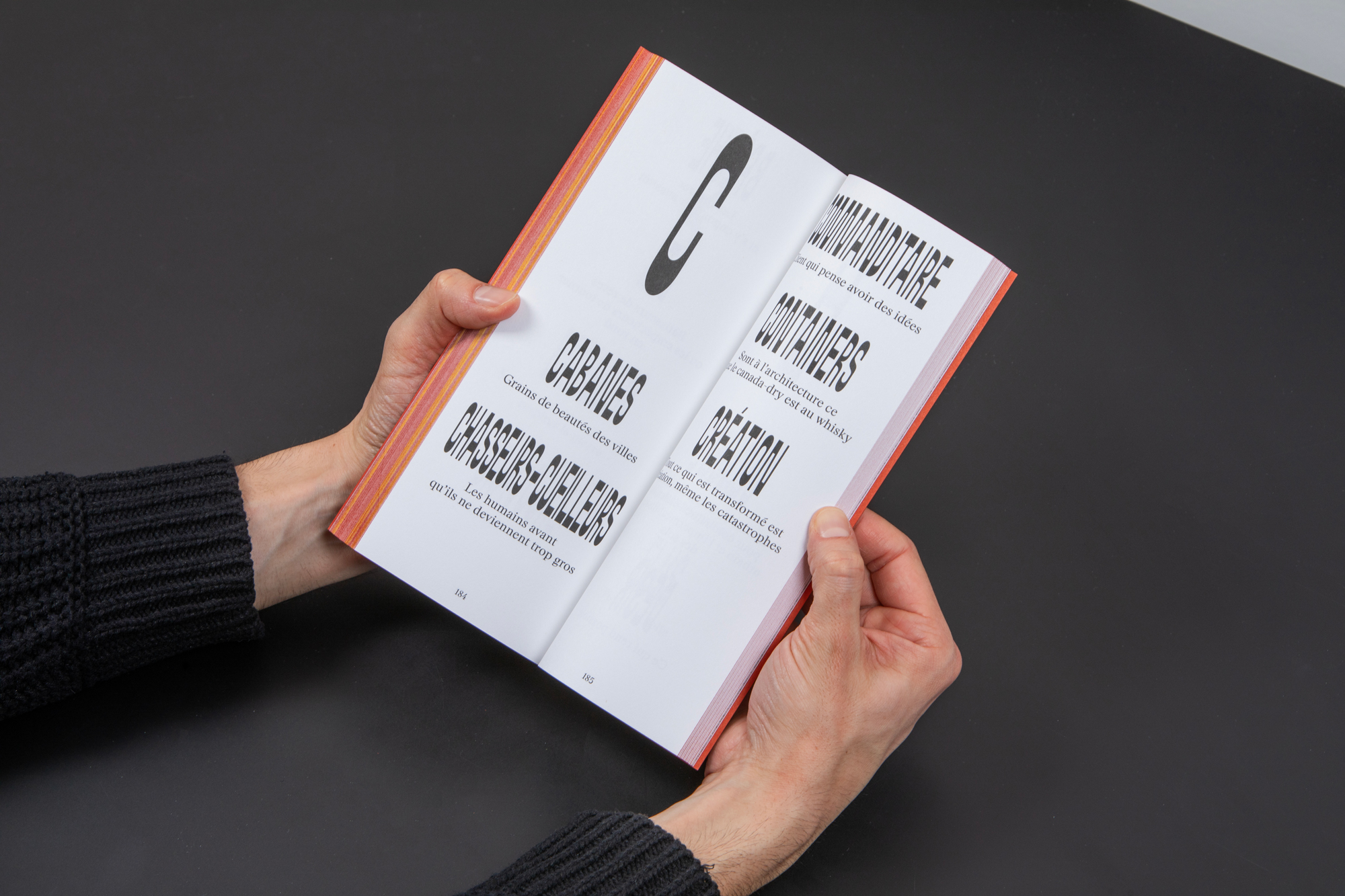 Les six chapitres du recueil sont entrecoupés par trois cahiers d’images, qui proposent une autre modalité réflexive. Les billets sont composés pour une lecture confortable, les définitions pamphlétaires traitées comme des affiches.