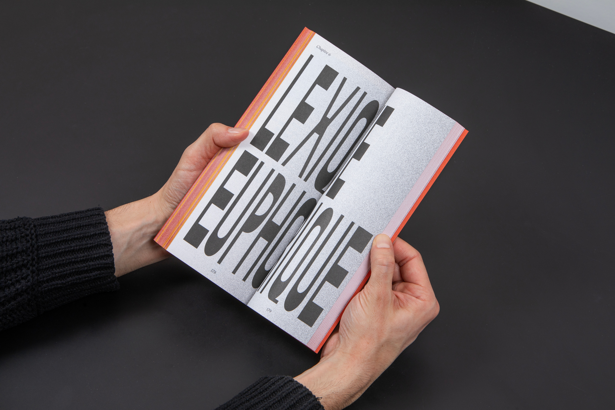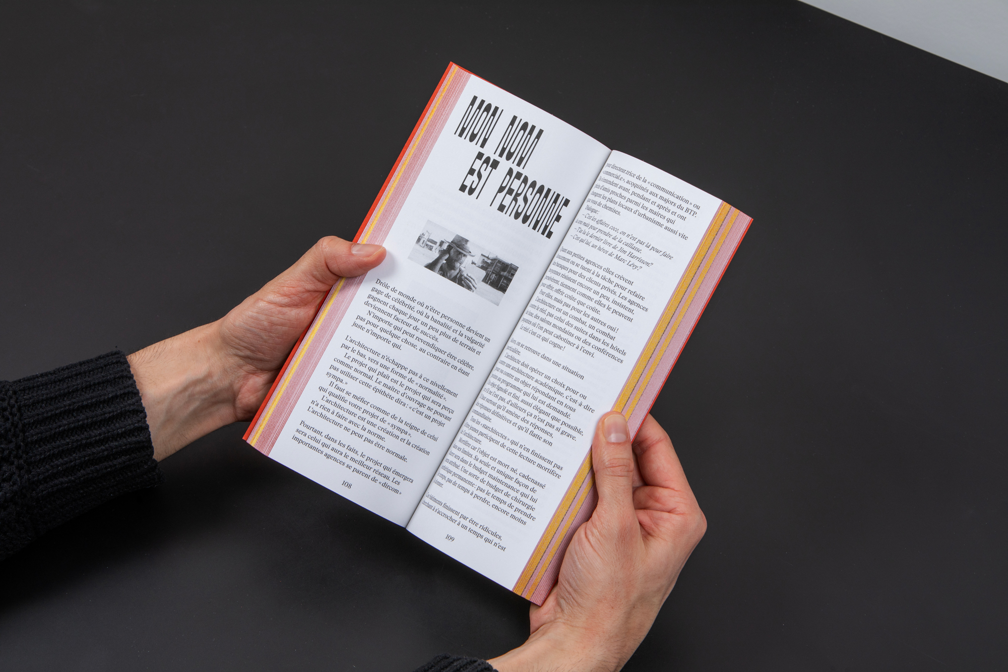 Au service de la métaphore, le format s’allonge, la couleur habille les tranches, le titre s’efface de la couverture. Mais pour que le livre ait véritablement l’air d’une brique, il lui faut une certaine épaisseur que nous obtenons en dilatant la matière éditoriale.