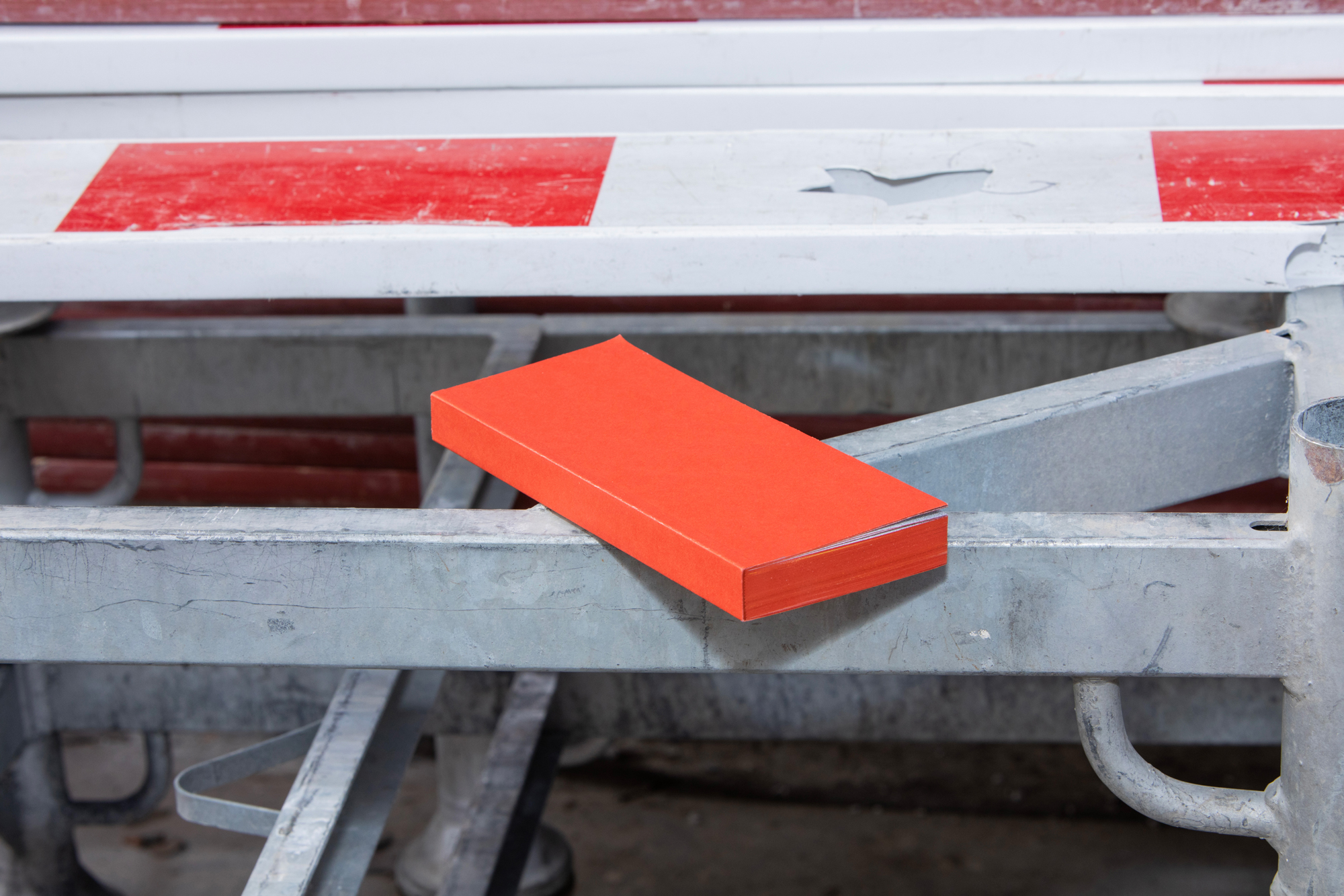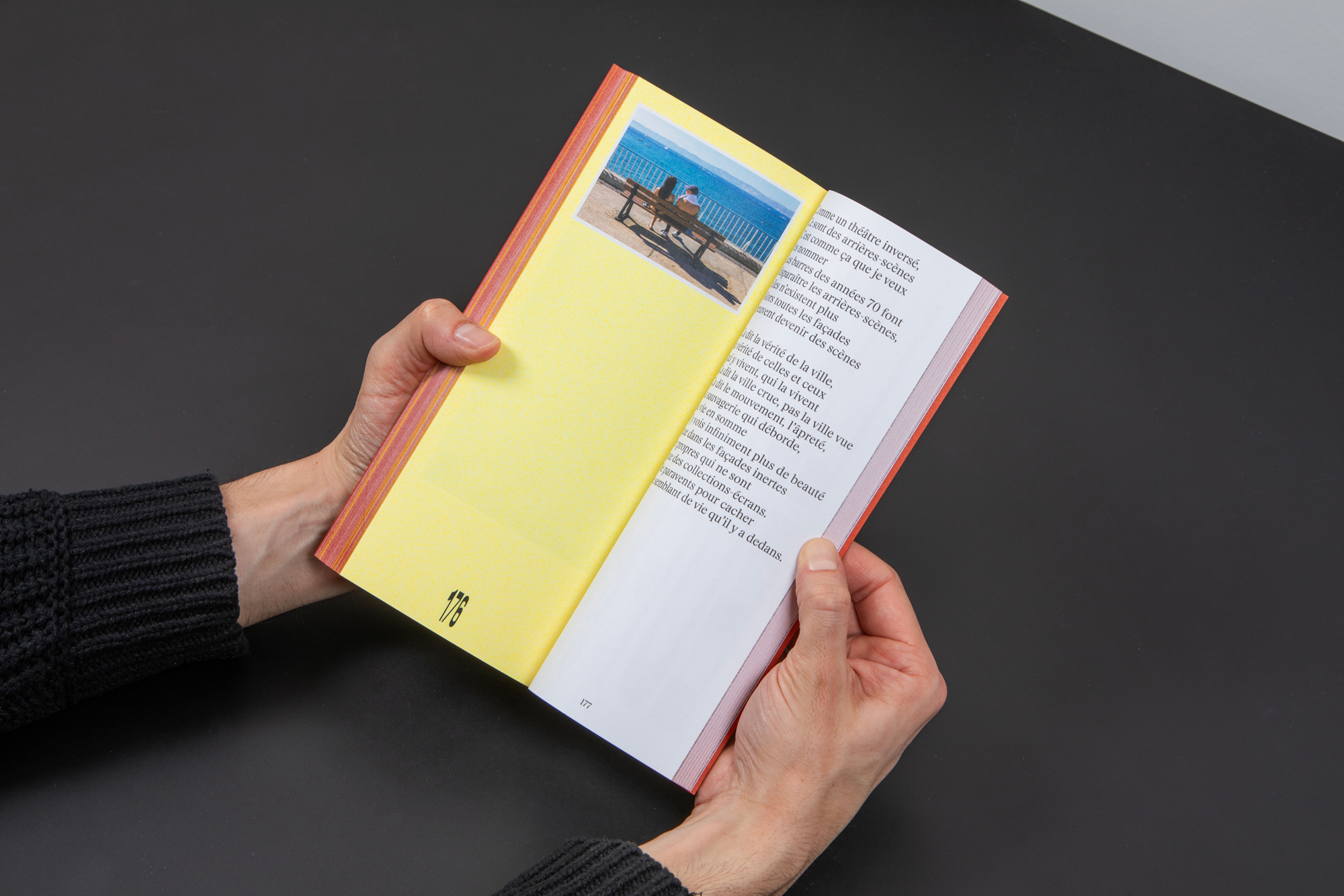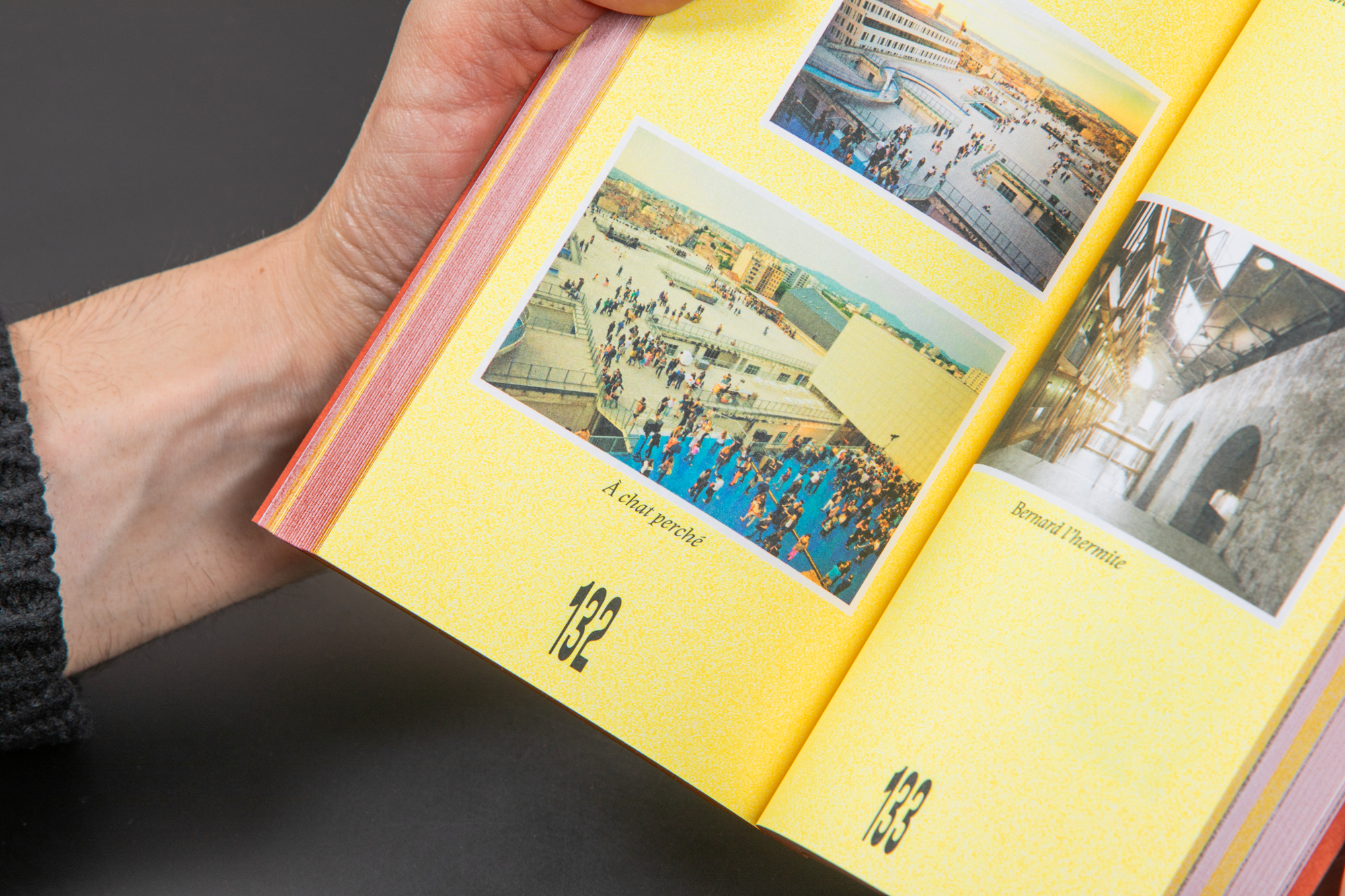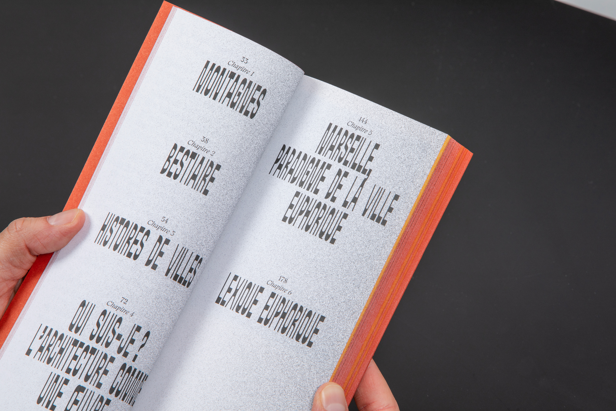 Une fonte étroite, comme celles employées sur l’asphalte des villes, est choisie pour le titrage. Elle permet de jouer dans ce format très allongé et se lit mieux en basculant le livre à l’horizontale.
