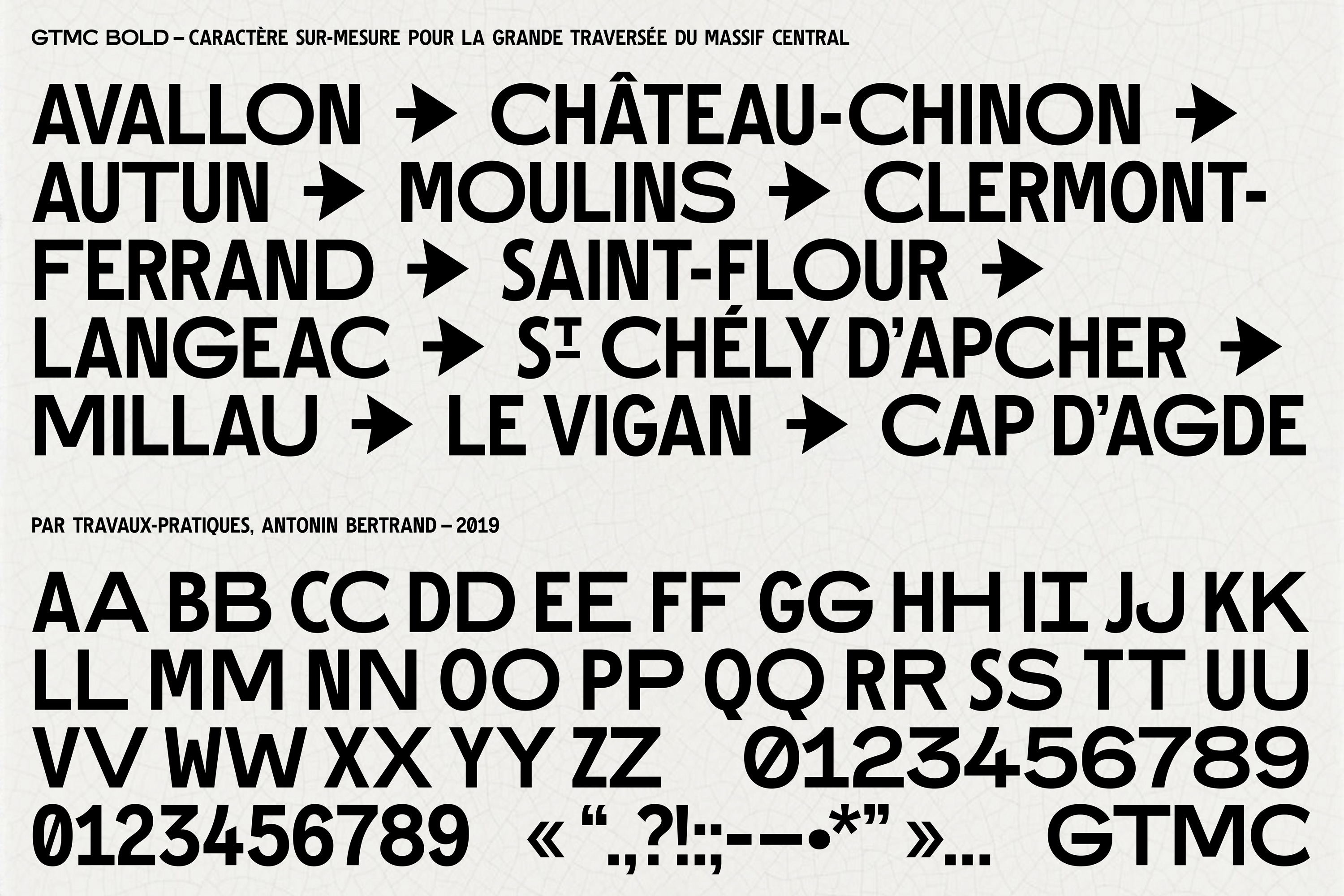 Clin d’œil aux anciennes bornes Michelin, une typographie est dessinée en deux variantes, étendue et condensée. En fonction de la longueur de chaque toponyme, qui peut varier drastiquement, on combine les lettres de l’une et de l’autre pour occuper au mieux la surface disponible.
