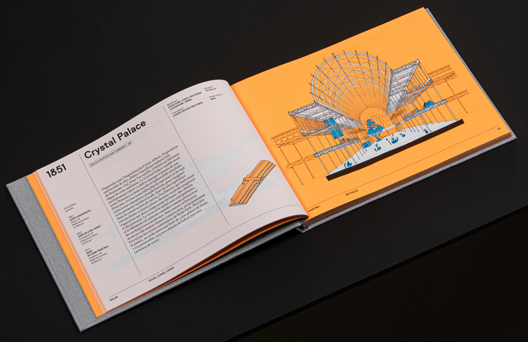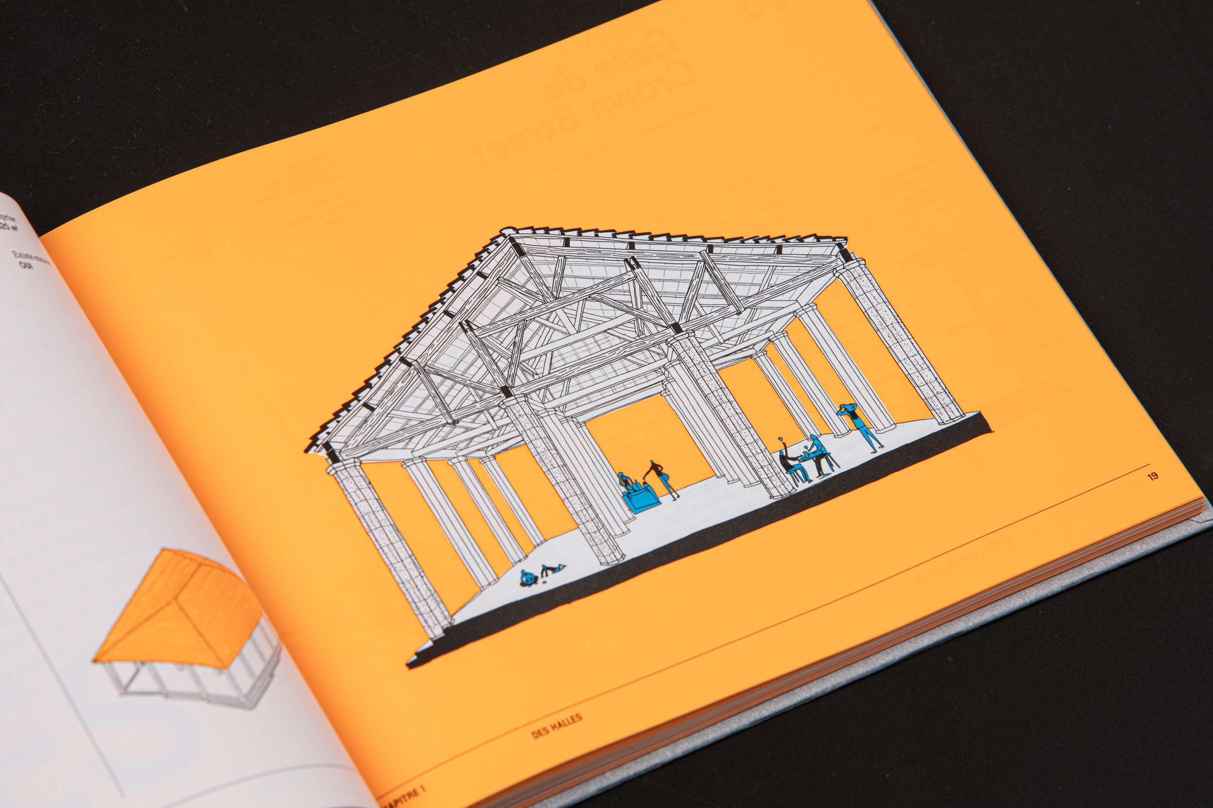 Une riche documentation est rassemblée pour permettre à Patrice Rambaud, illustrateur, de représenter dix halles remarquables en coupe-perspective.