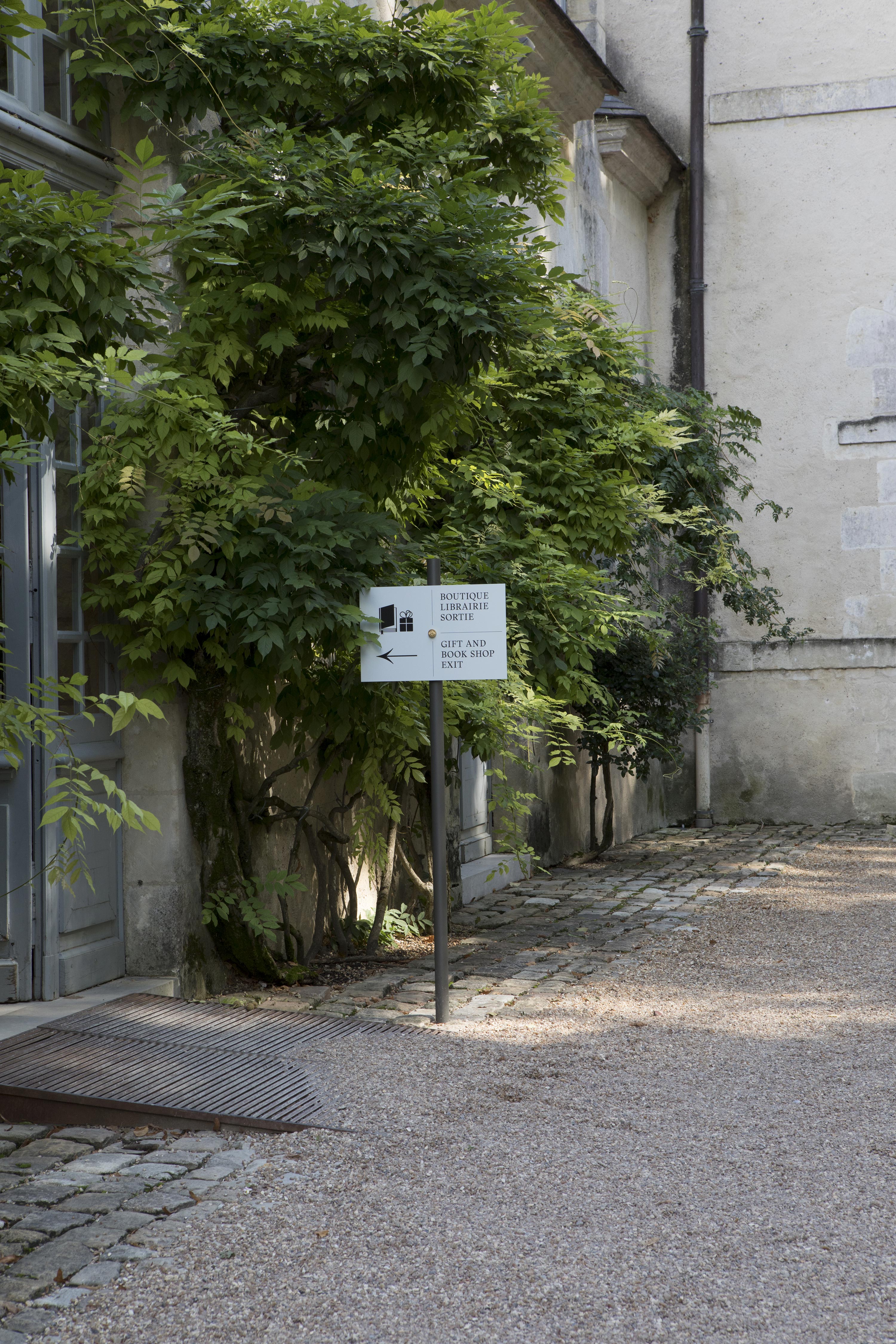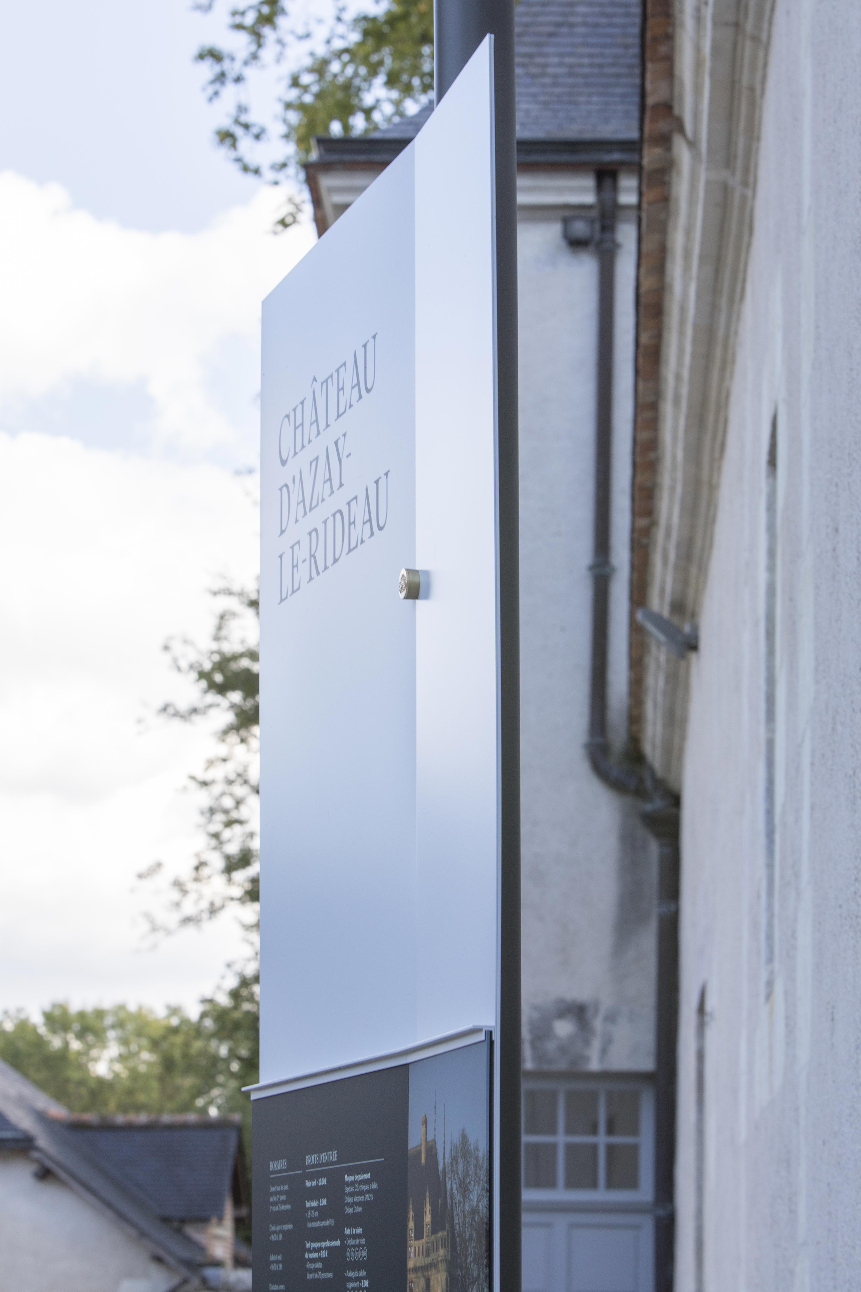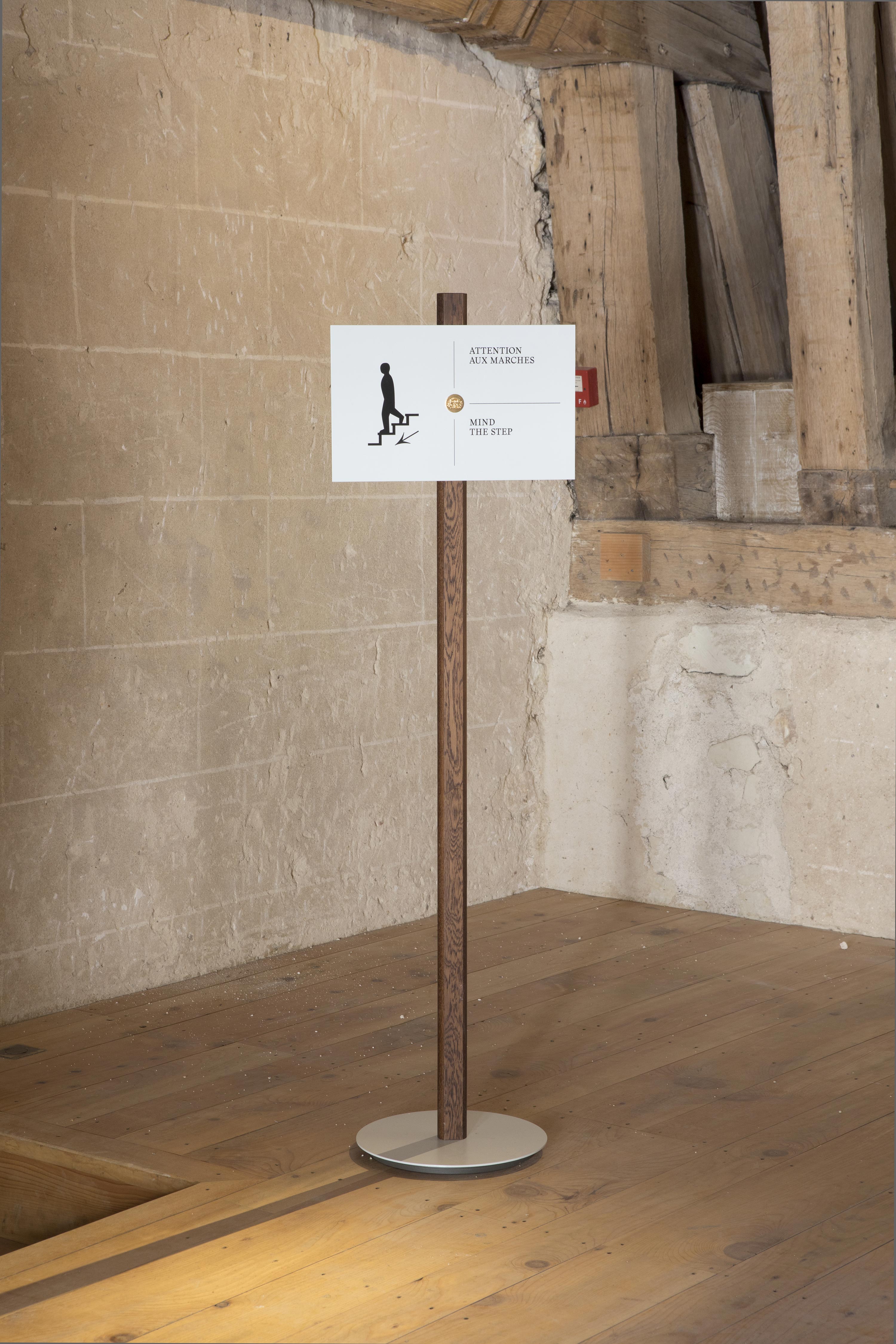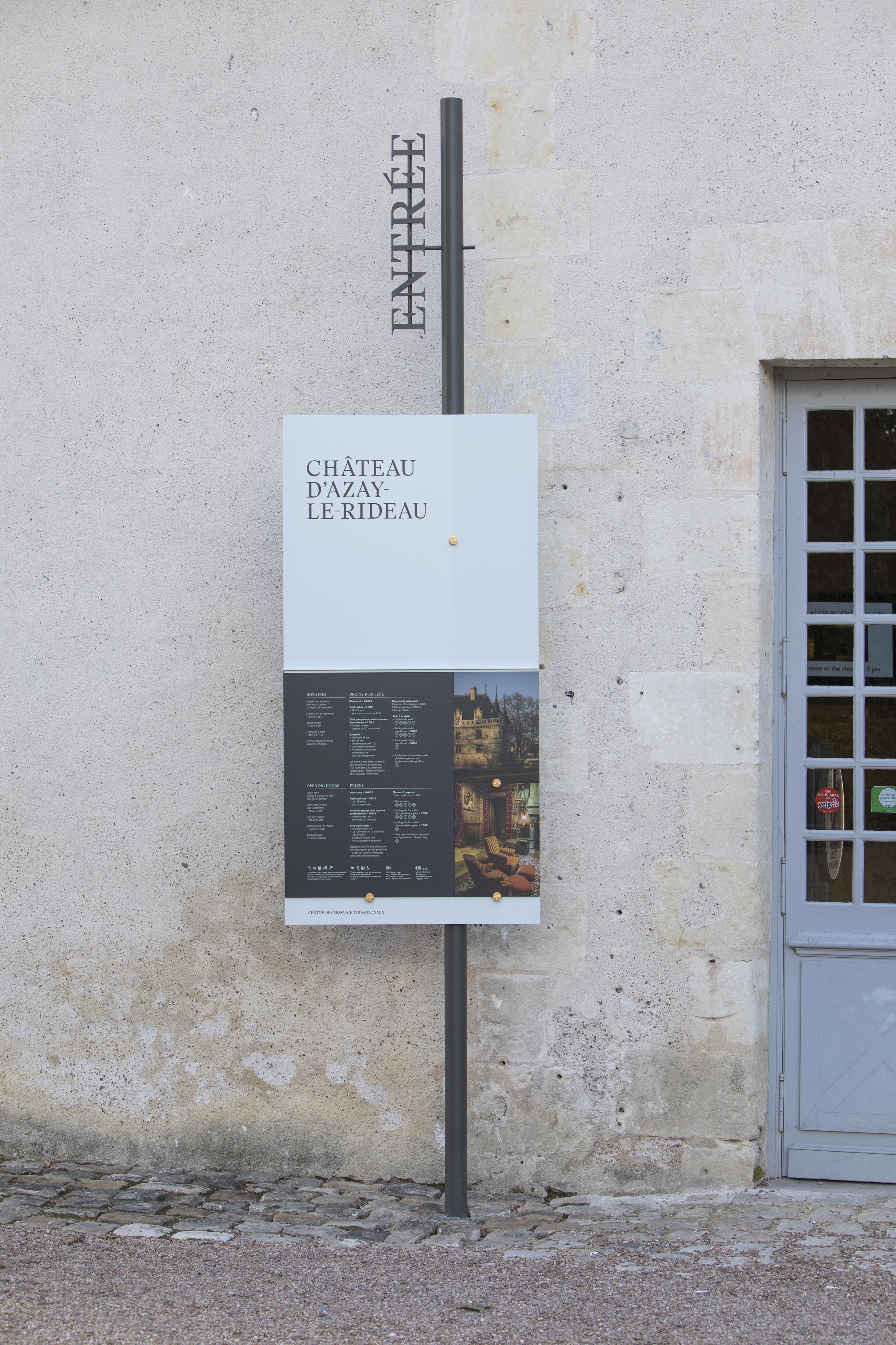 Dans le domaine, la signalétique est placée près du sol pour préserver le paysage et inciter à l’observation. Dans le château, verticale et mobile, elle s’intègre au décor sans trahir sa vocation première: situer et orienter le visiteur.