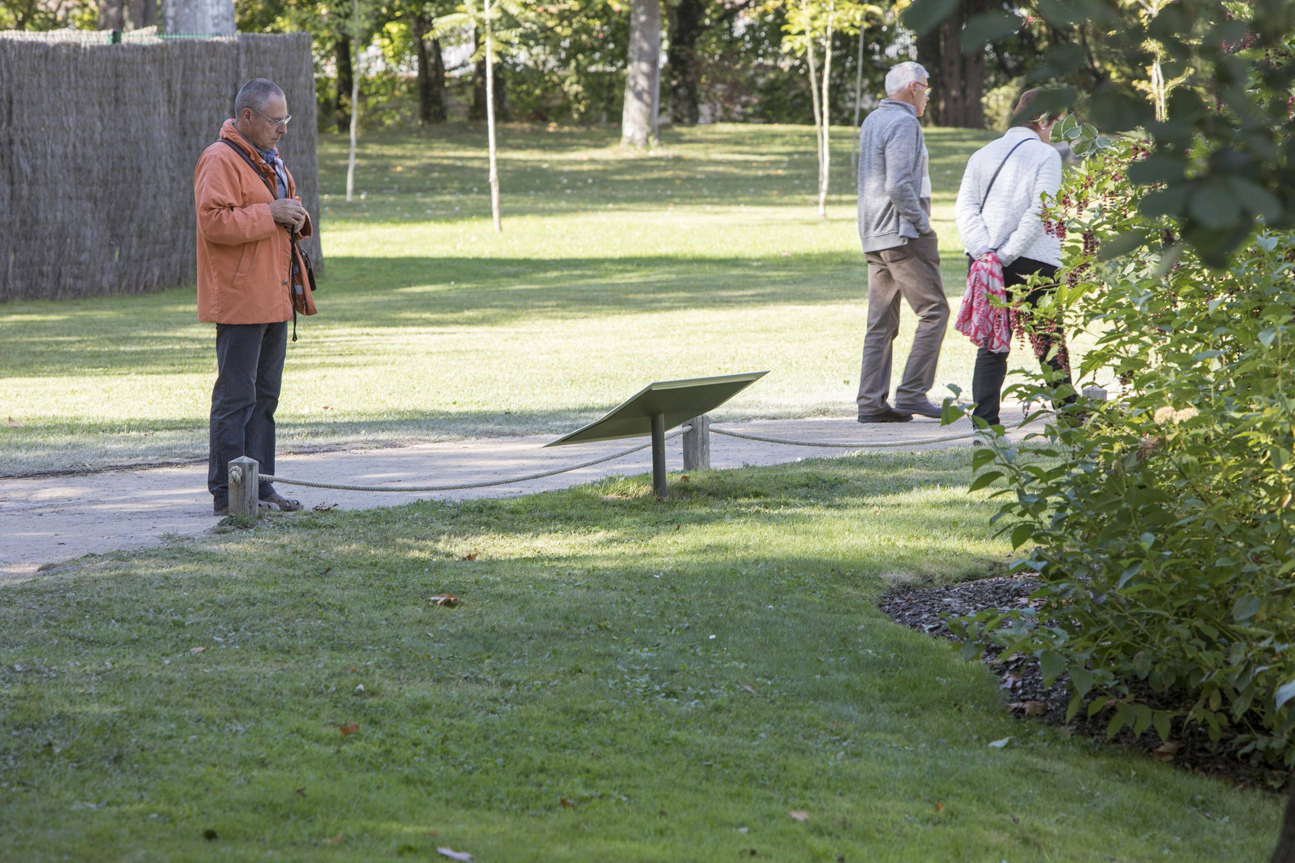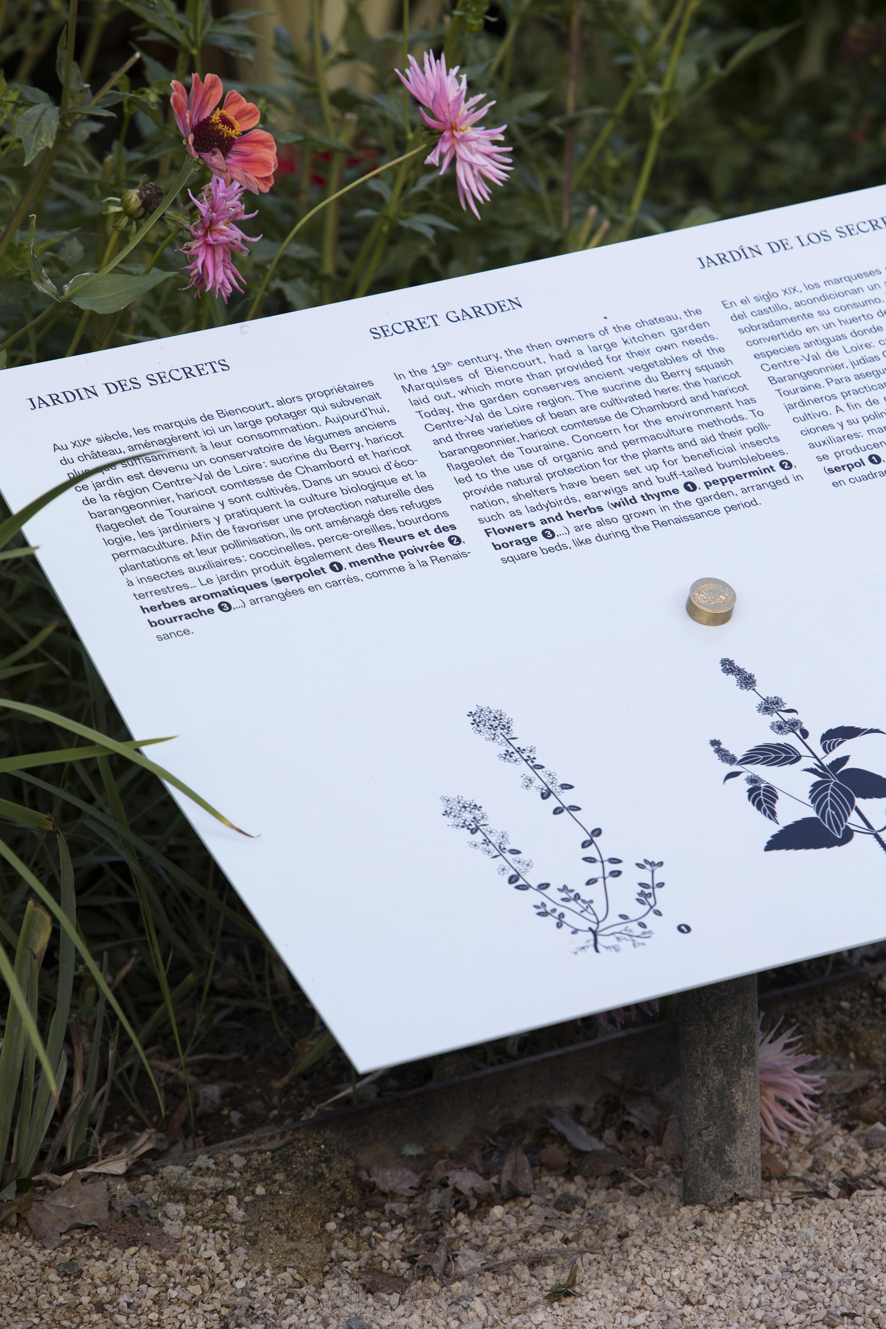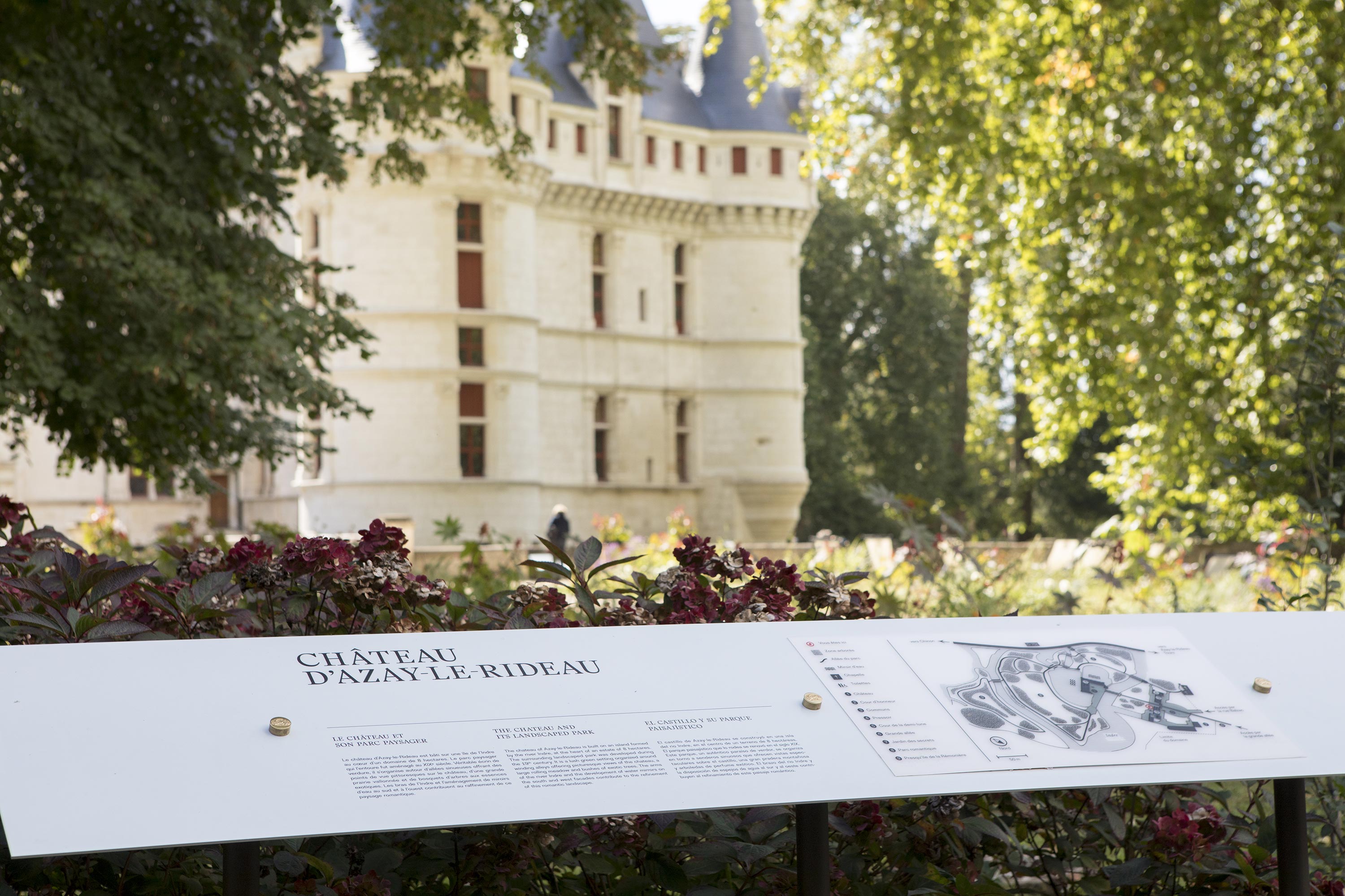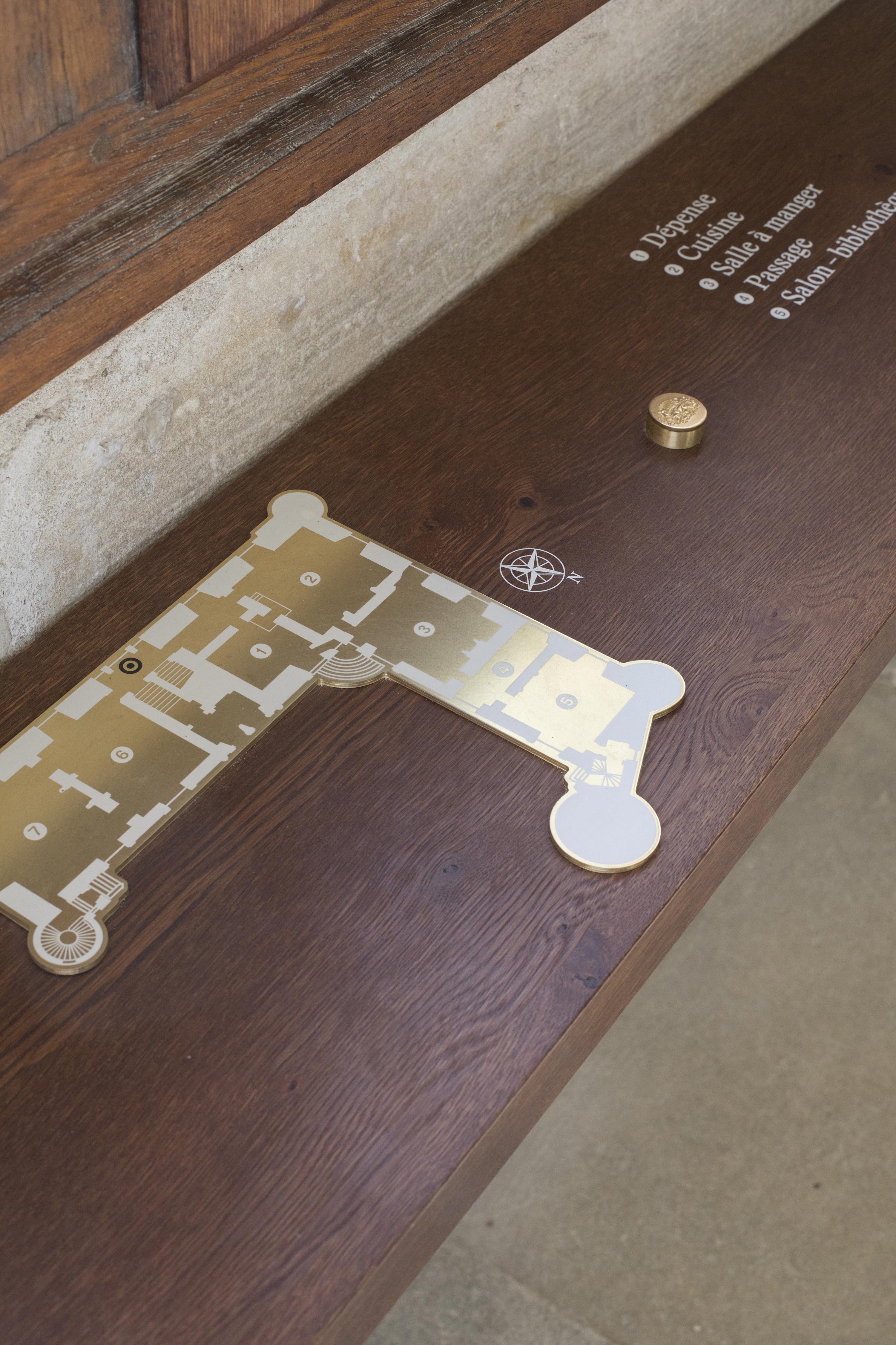 Dans le domaine, la signalétique est placée près du sol pour préserver le paysage et inciter à l’observation. Dans le château, verticale et mobile, elle s’intègre au décor sans trahir sa vocation première: situer et orienter le visiteur.