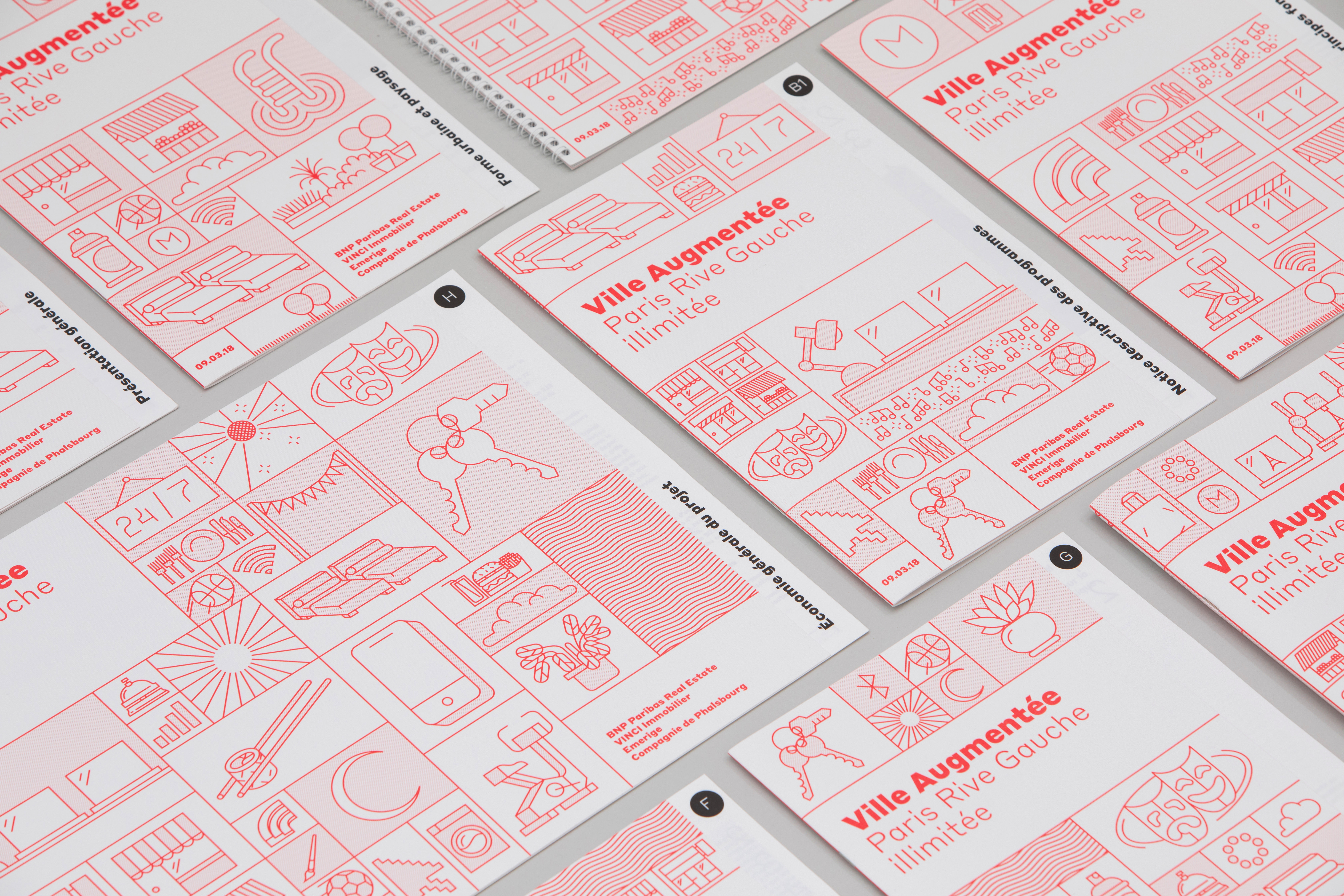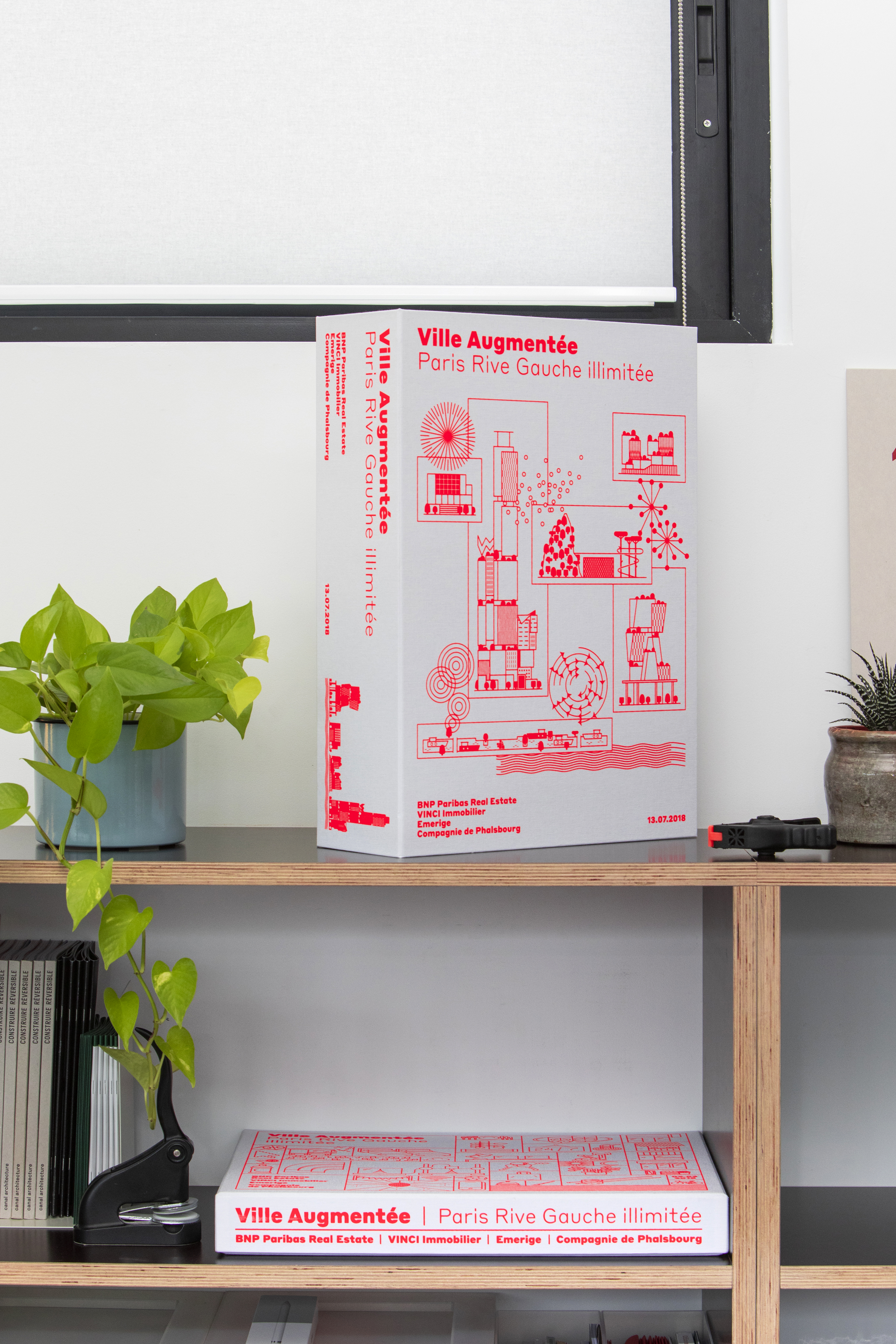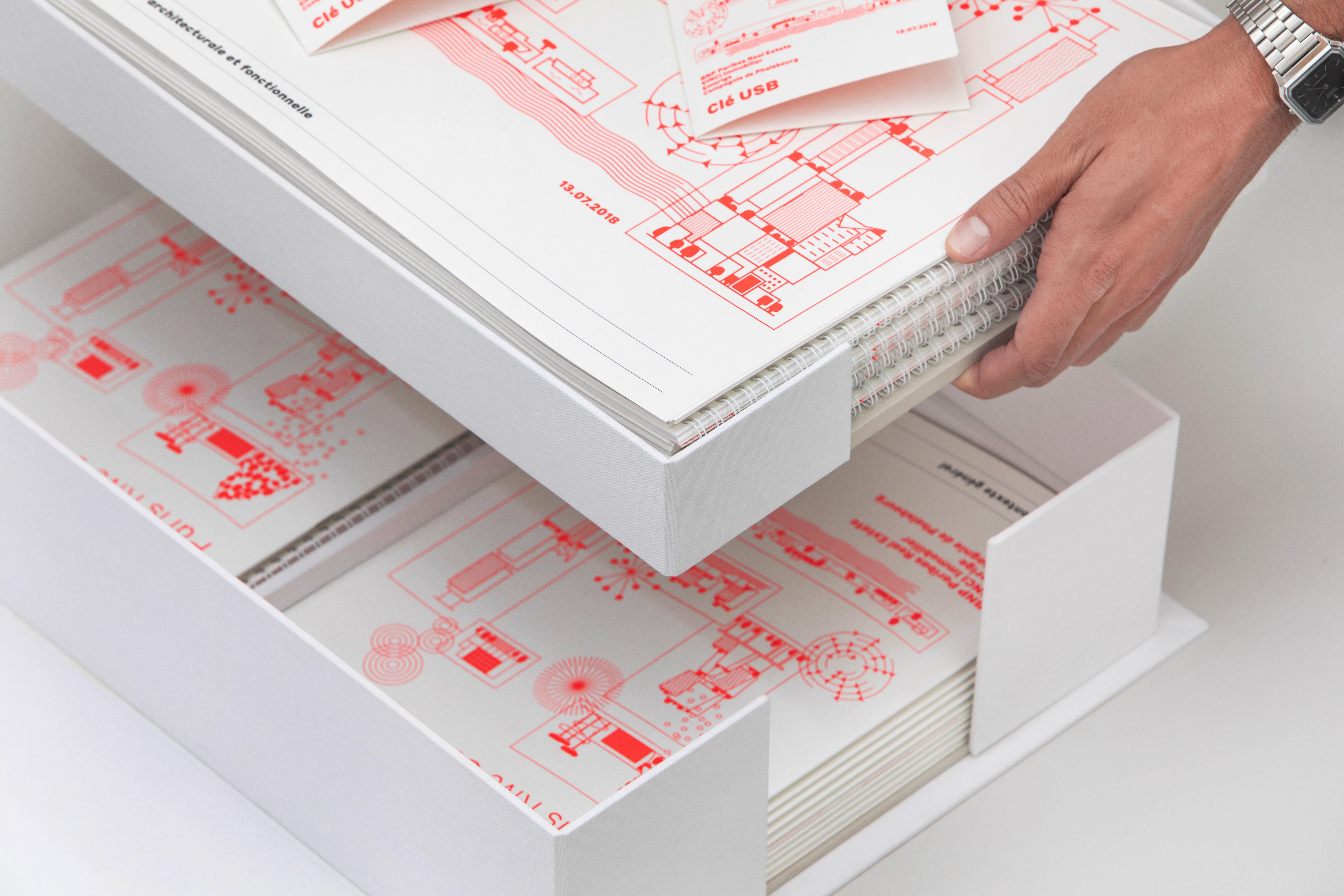 Pour le rendu intermédiaire, nous développons une identité qui met en valeur la programmation innovante du projet et l’associons à la notion de « ville augmentée ». Pour le rendu final, c’est l’architecture qui permet de révéler l’identité proposée pour le quartier. À chaque phase, un soin particulier est porté à la fabrication des livrables, boîtes sur mesure, sérigraphie, impression en ton direct…