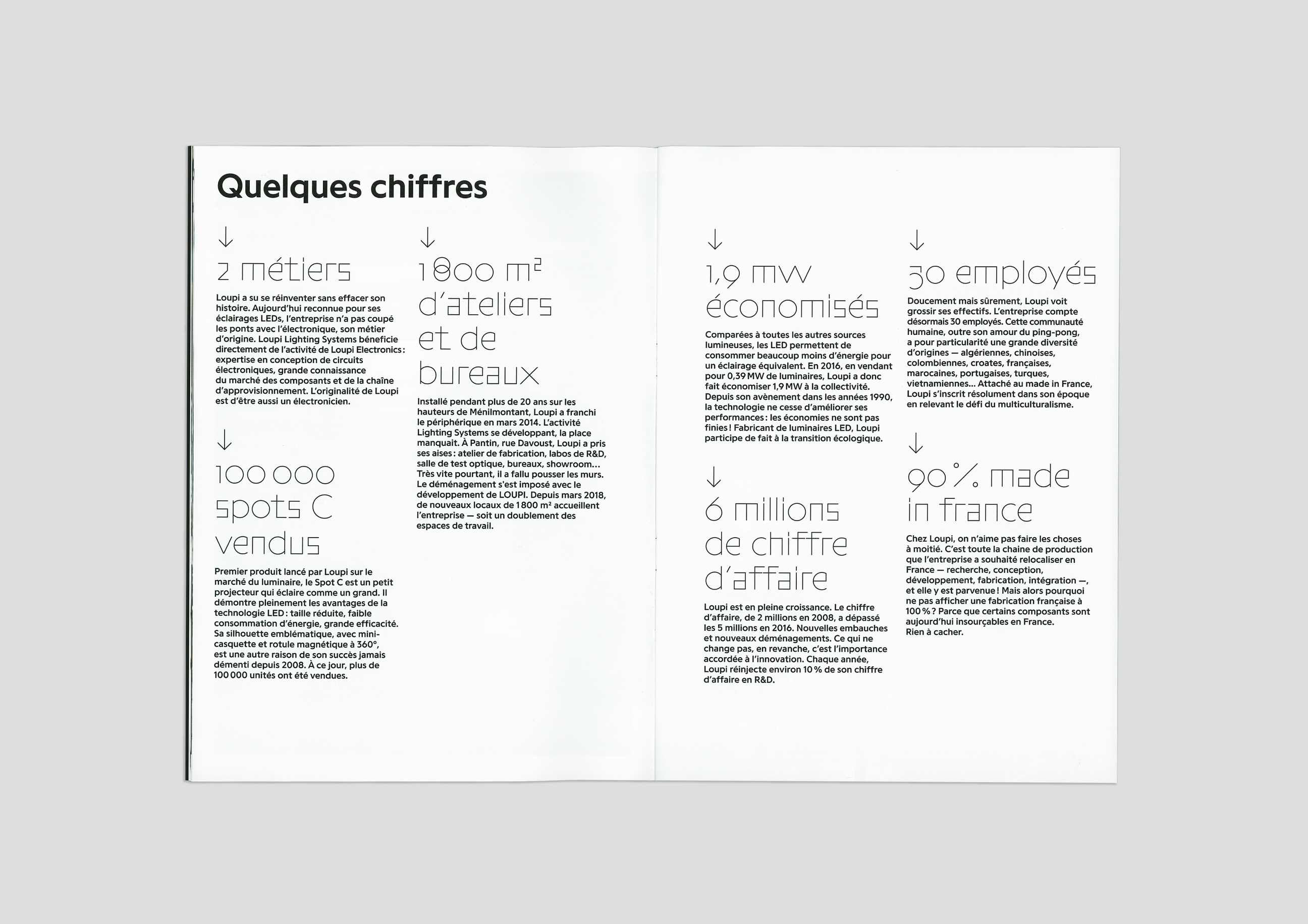 Pour cette publication, nous avons souhaité mettre en lumière les qualités humaines de Loupi. Implantée à Pantin, cette entreprise d’une trentaine de salariés fabrique des luminaires LED et équipe les plus grands musées, hôtels, commerces, etc. Notre travail d’éditorialisation et de rédaction a été enrichi d’un reportage photographique signé Guillaume Herbaut.