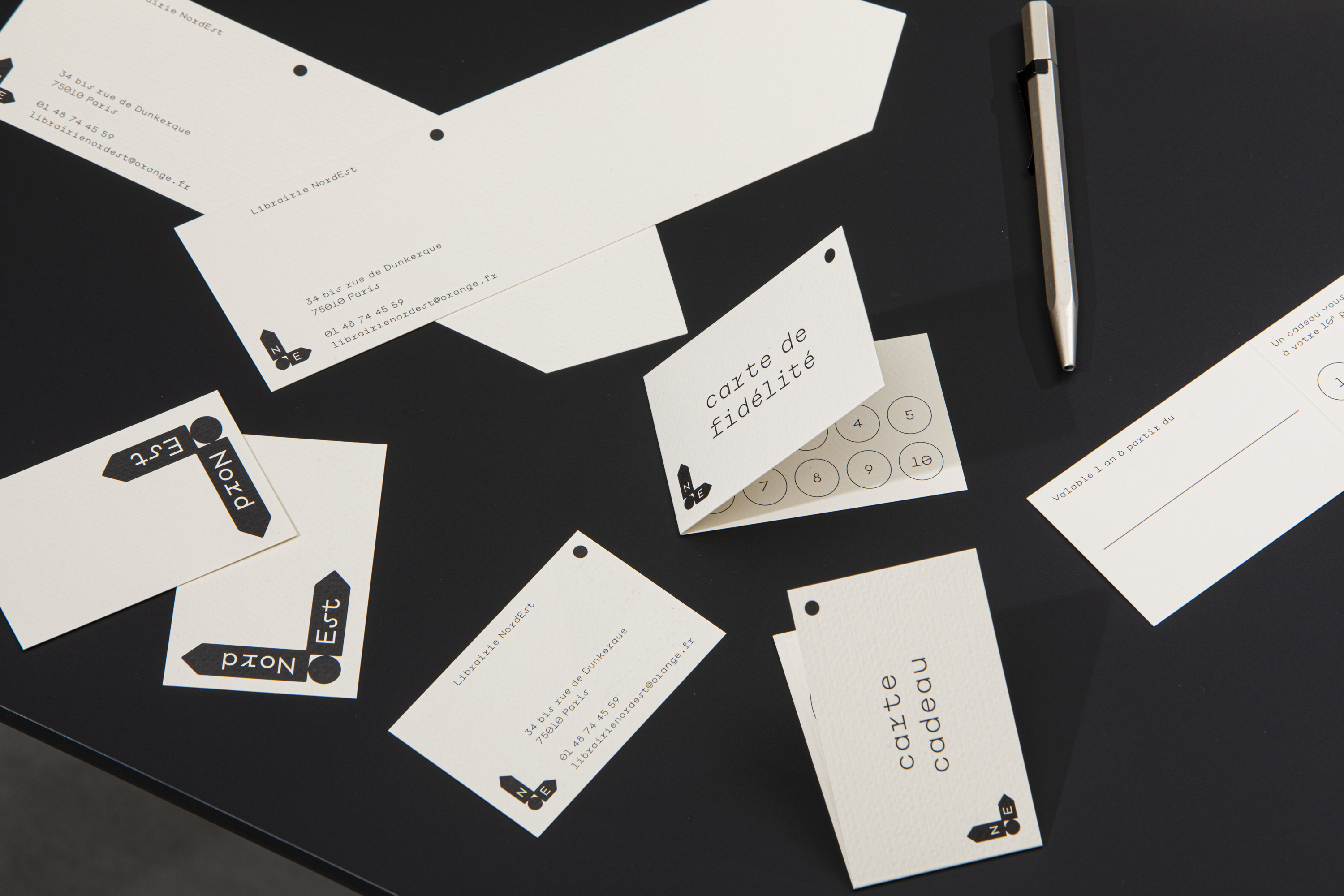 Court et évocateur, le nom NordEst est du pain béni pour un graphiste. La lettre L, pointant les deux directions cardinales, s’impose pour symboliser la librairie. Le caractère Euclid mono est choisi pour sa chasse régulière et son dessin singulier. De là découlent les éléments de papeterie et l’ensemble des outils qui permettent aux libraires de communiquer en vitrine et sur Instagram.