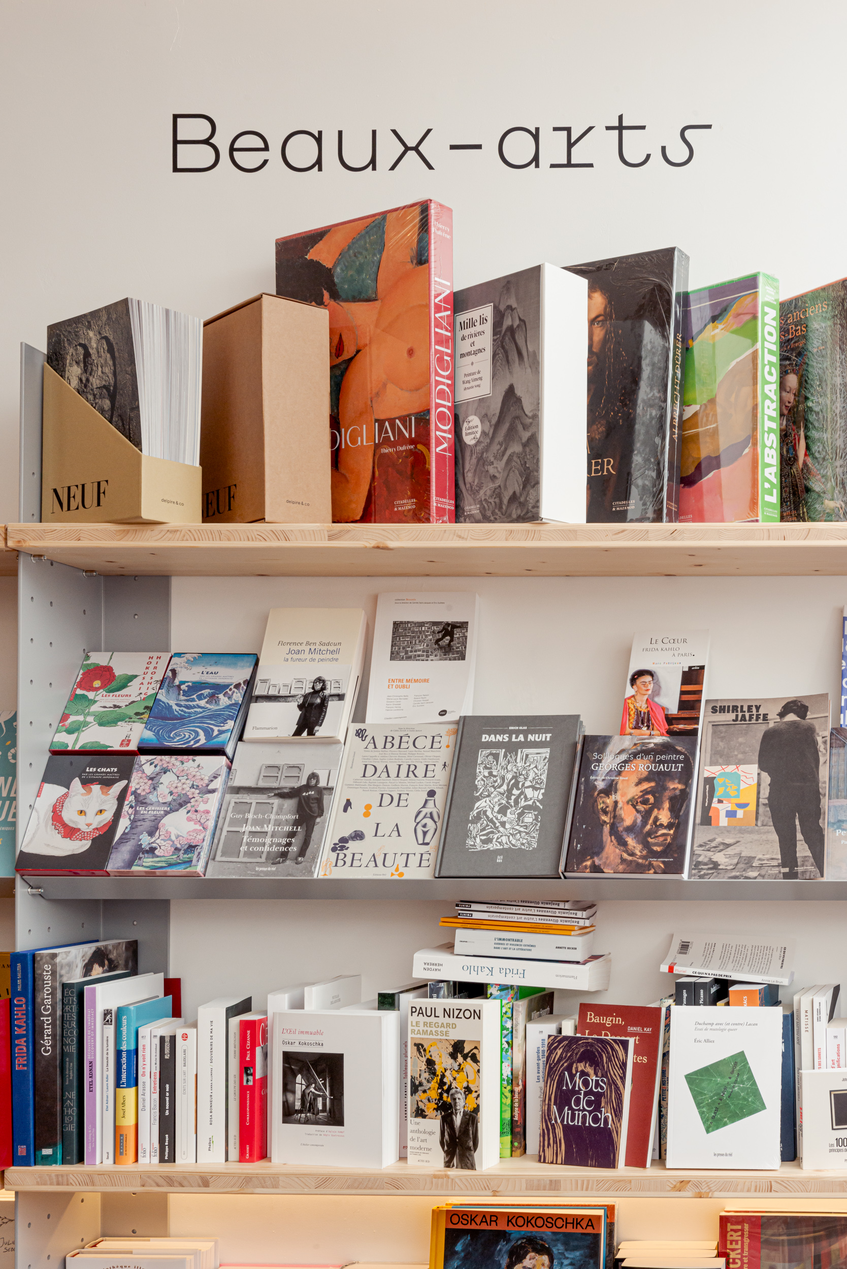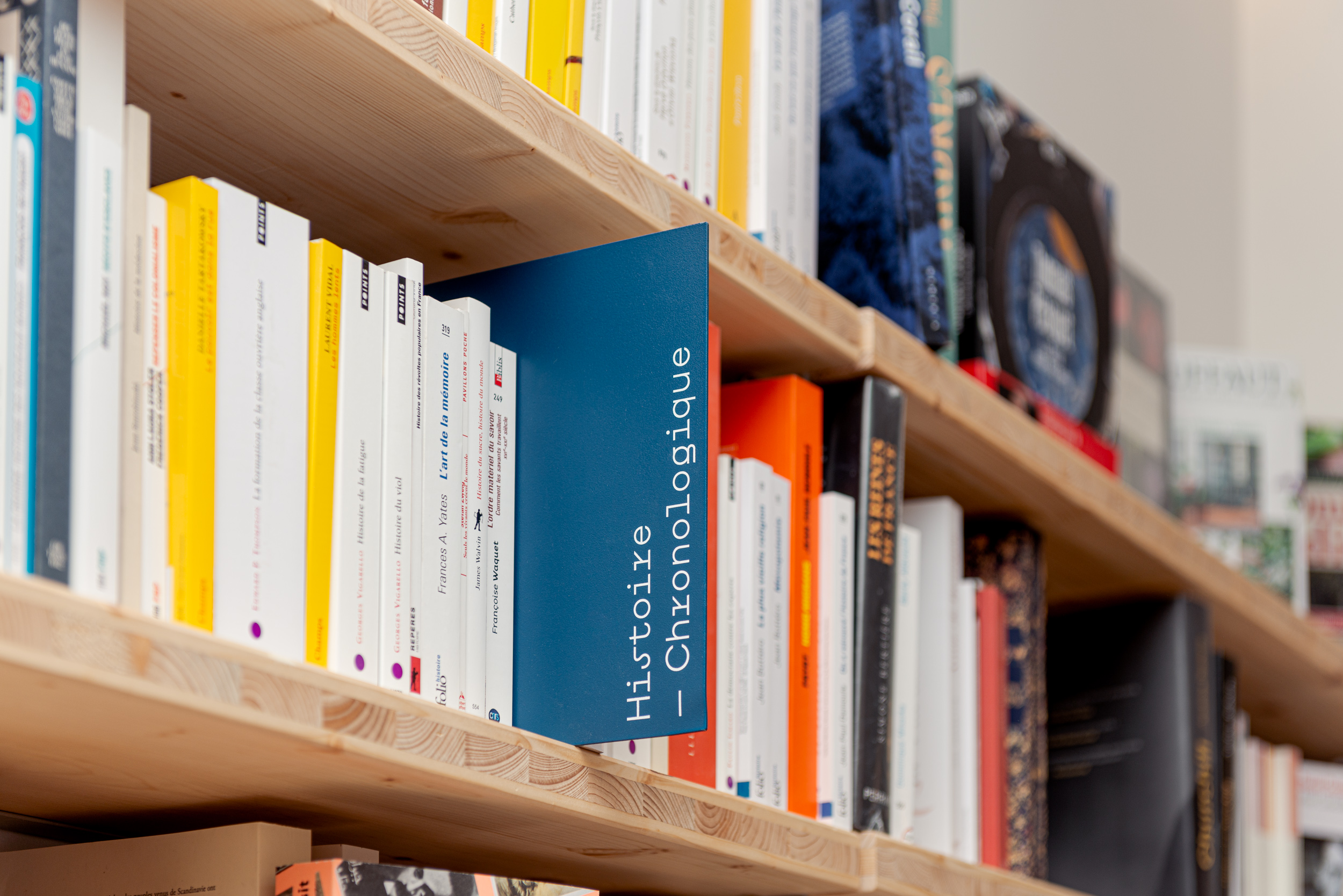 Installée en drapeau, une petite enseigne en tôle découpée, laquée et sérigraphiée signale la librairie aux passants.