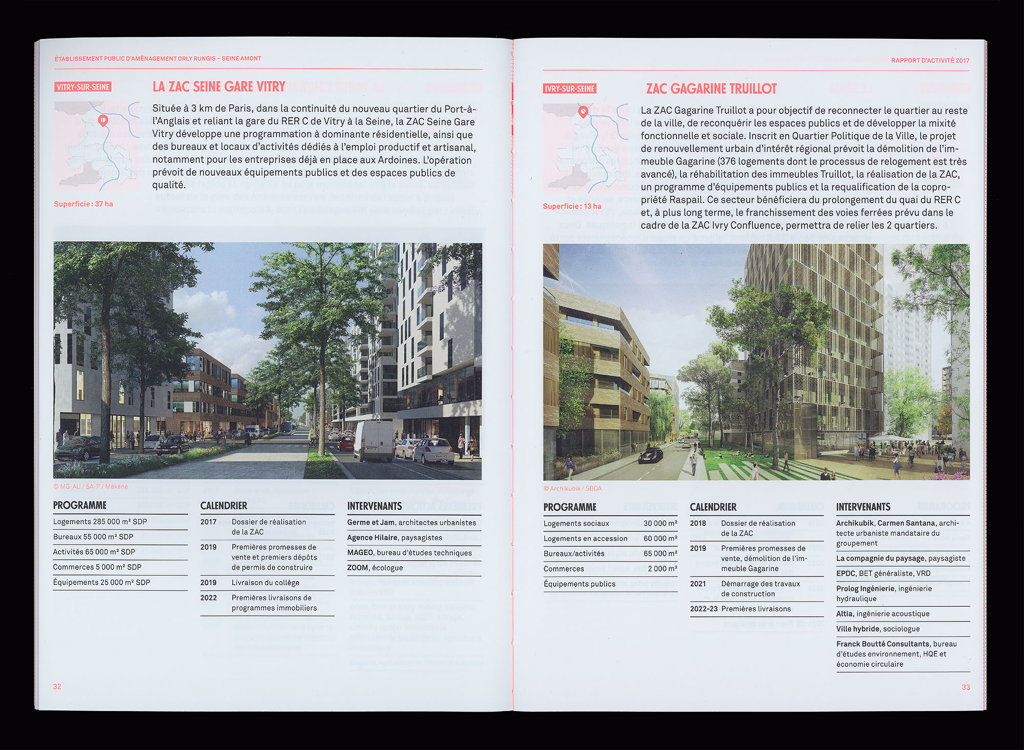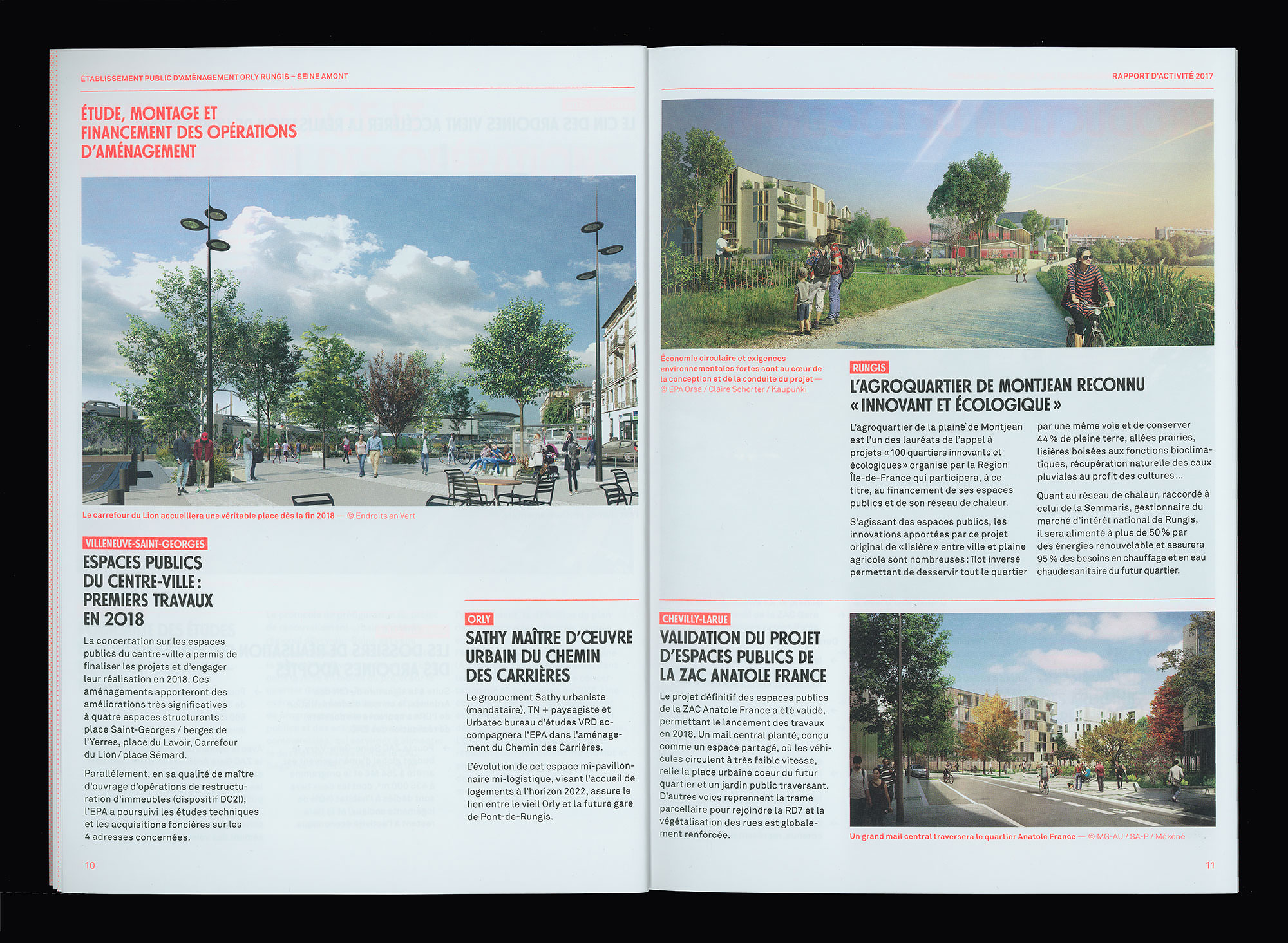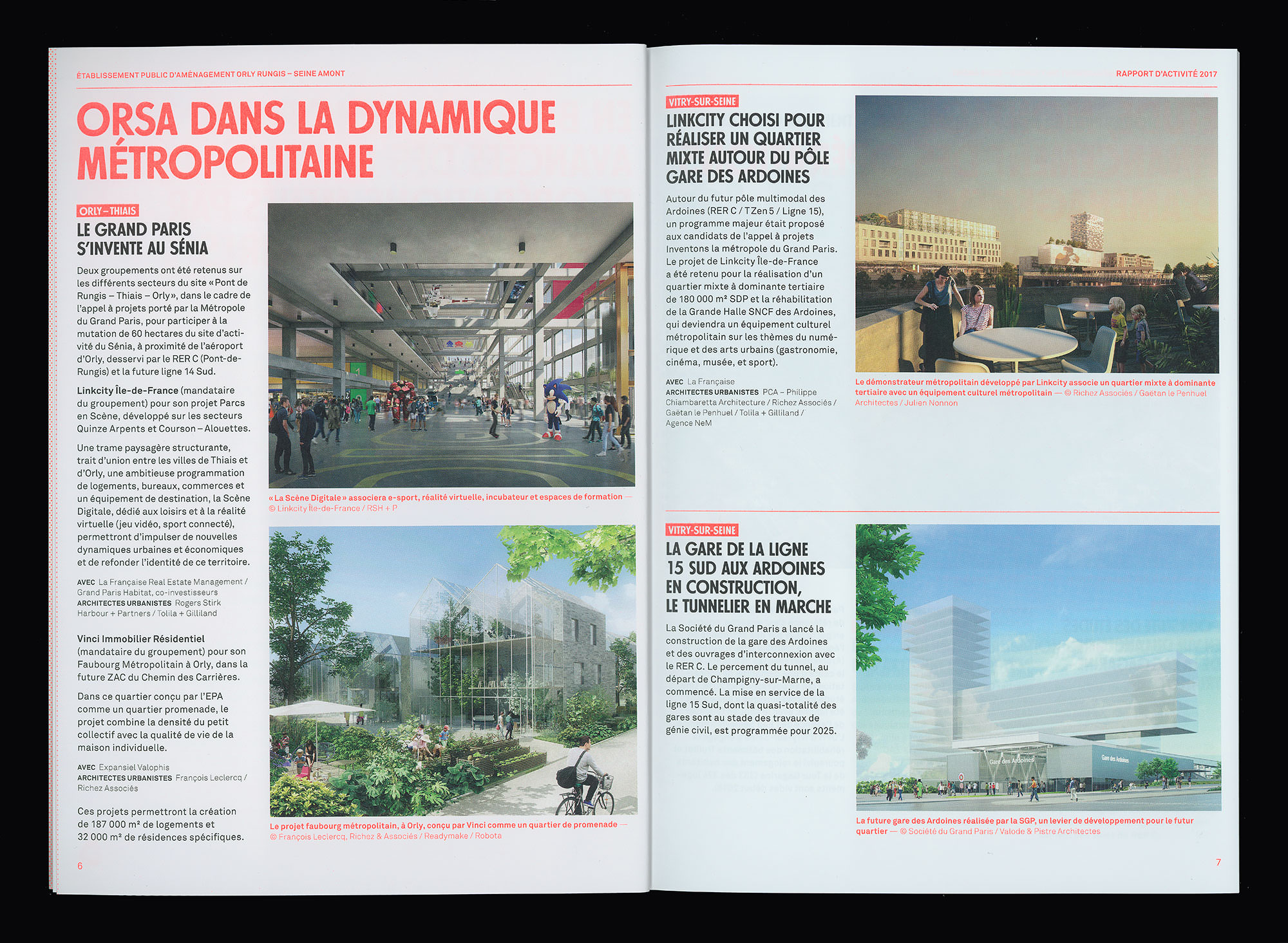 Conséquence de sa fusion avec Grand Paris Aménagement, l’établissement public d’aménagement ORSA adopte un nouveau format pour son rapport d’activité et nous en confie la conception. Belle surprise, lorsque nous retrouvons au fil des pages deux projets lauréats que nous avions accompagnés : Chemin des Carrières avec Vinci Immobilier et l’Agroquartier de Montjean avec Nacarat.