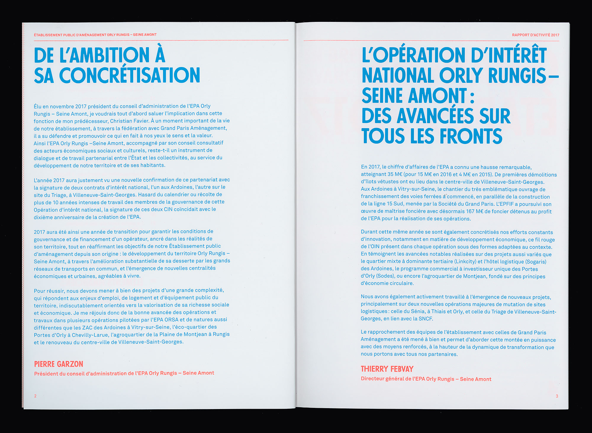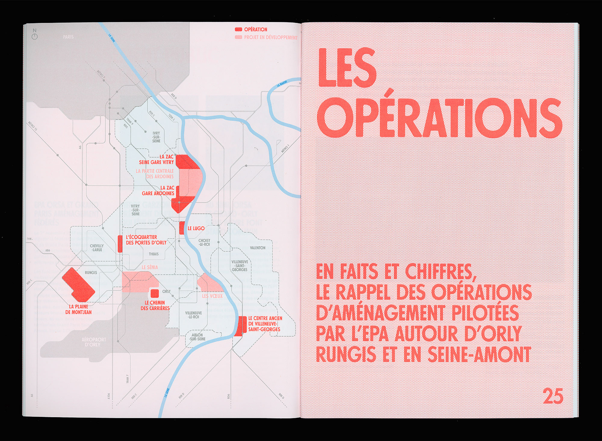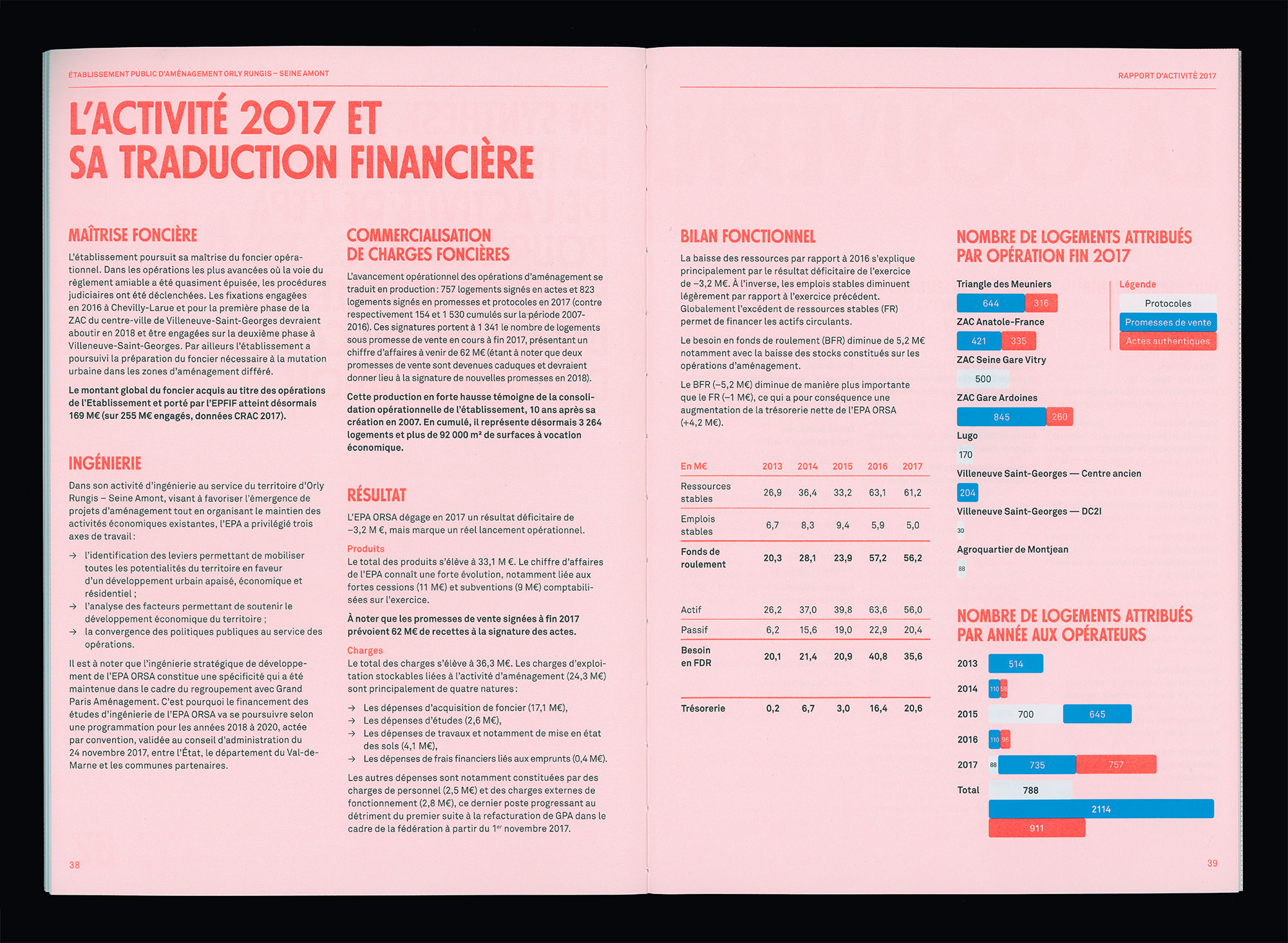 Conséquence de sa fusion avec Grand Paris Aménagement, l’établissement public d’aménagement ORSA adopte un nouveau format pour son rapport d’activité et nous en confie la conception. Belle surprise, lorsque nous retrouvons au fil des pages deux projets lauréats que nous avions accompagnés : Chemin des Carrières avec Vinci Immobilier et l’Agroquartier de Montjean avec Nacarat.