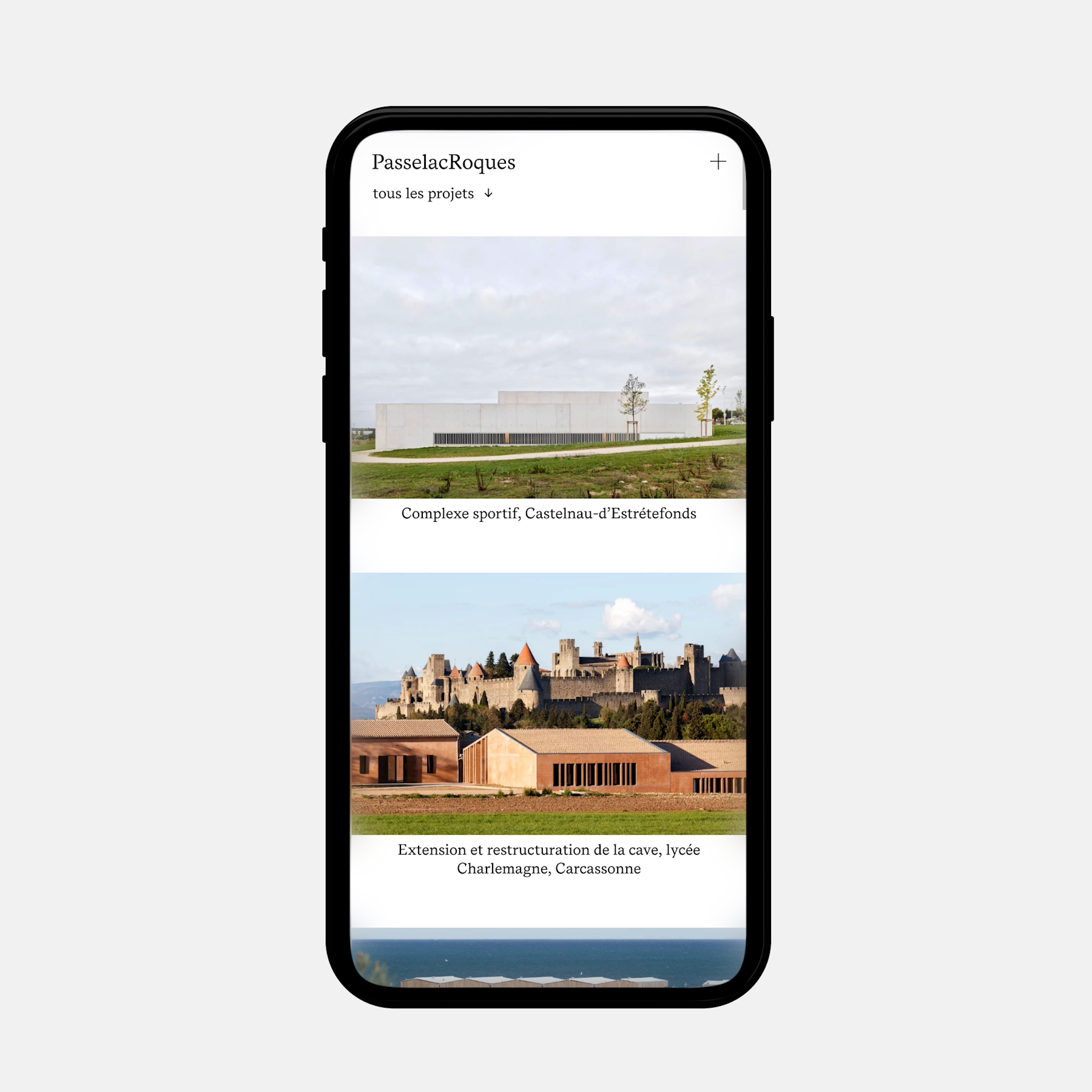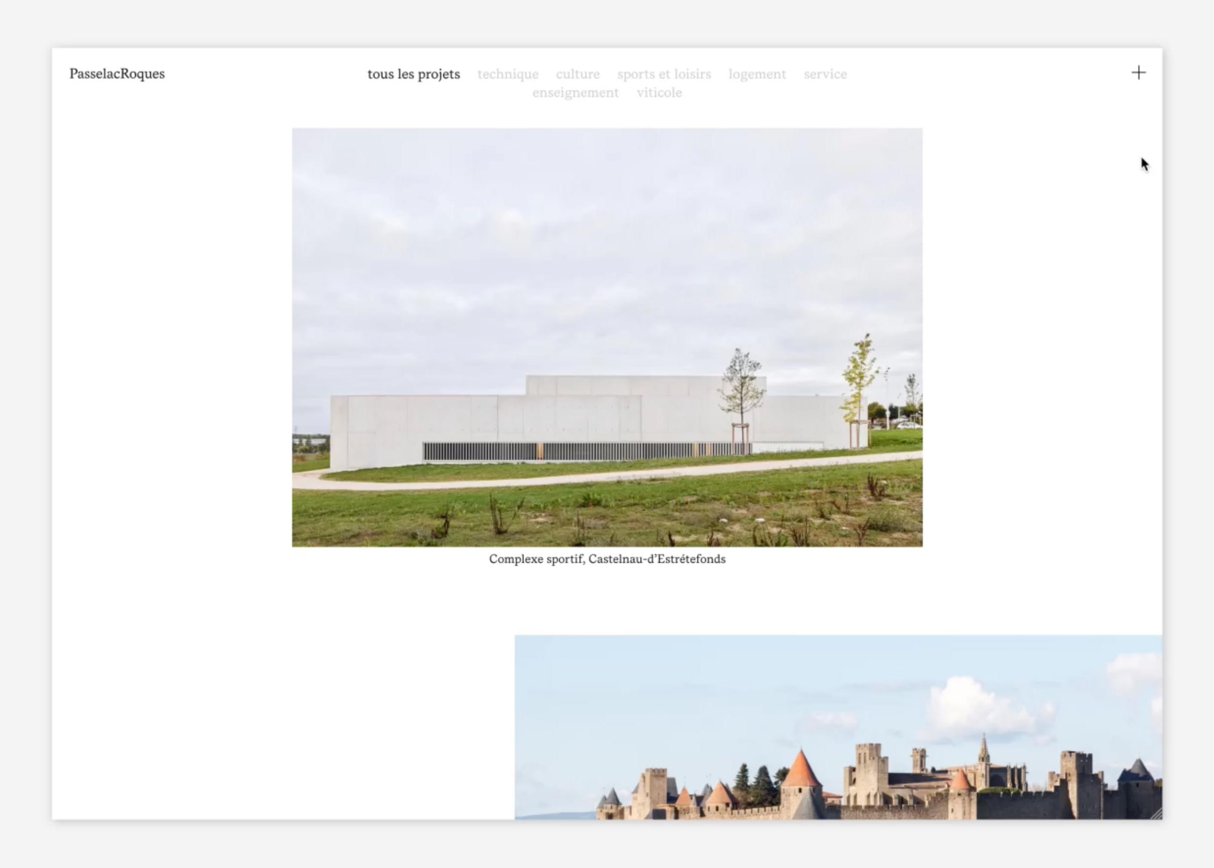 Leur architecture nous frappe par son horizontalité : c’est donc par un scroll horizontal que l’on explore chaque réalisation, s’en approchant peu à peu avant d’y pénétrer.