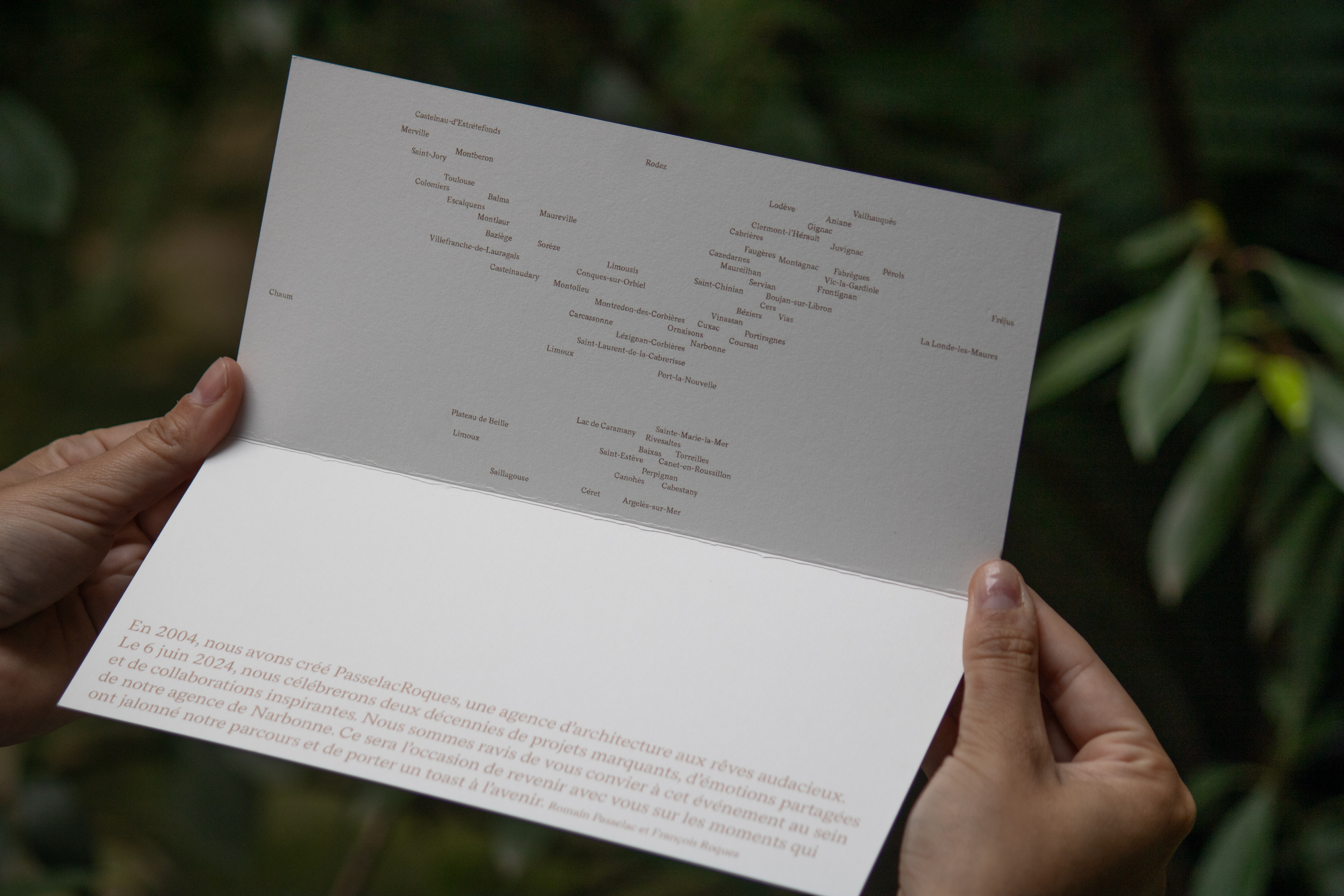 Sur le carton d’invitation à la grande fête d’anniversaire, signalées par un double X, toutes les réalisations de l’agence dessinent la carte de son enracinement sudiste, d’Argelès-sur-Mer à Fréjus en passant par Rodez.