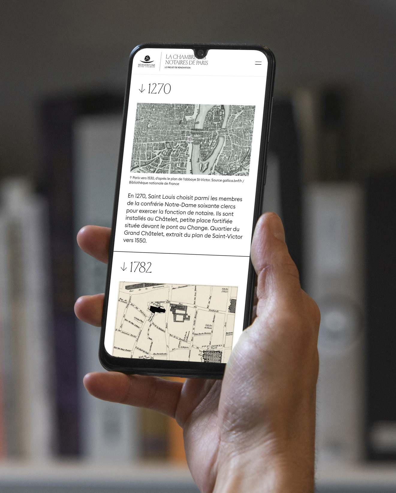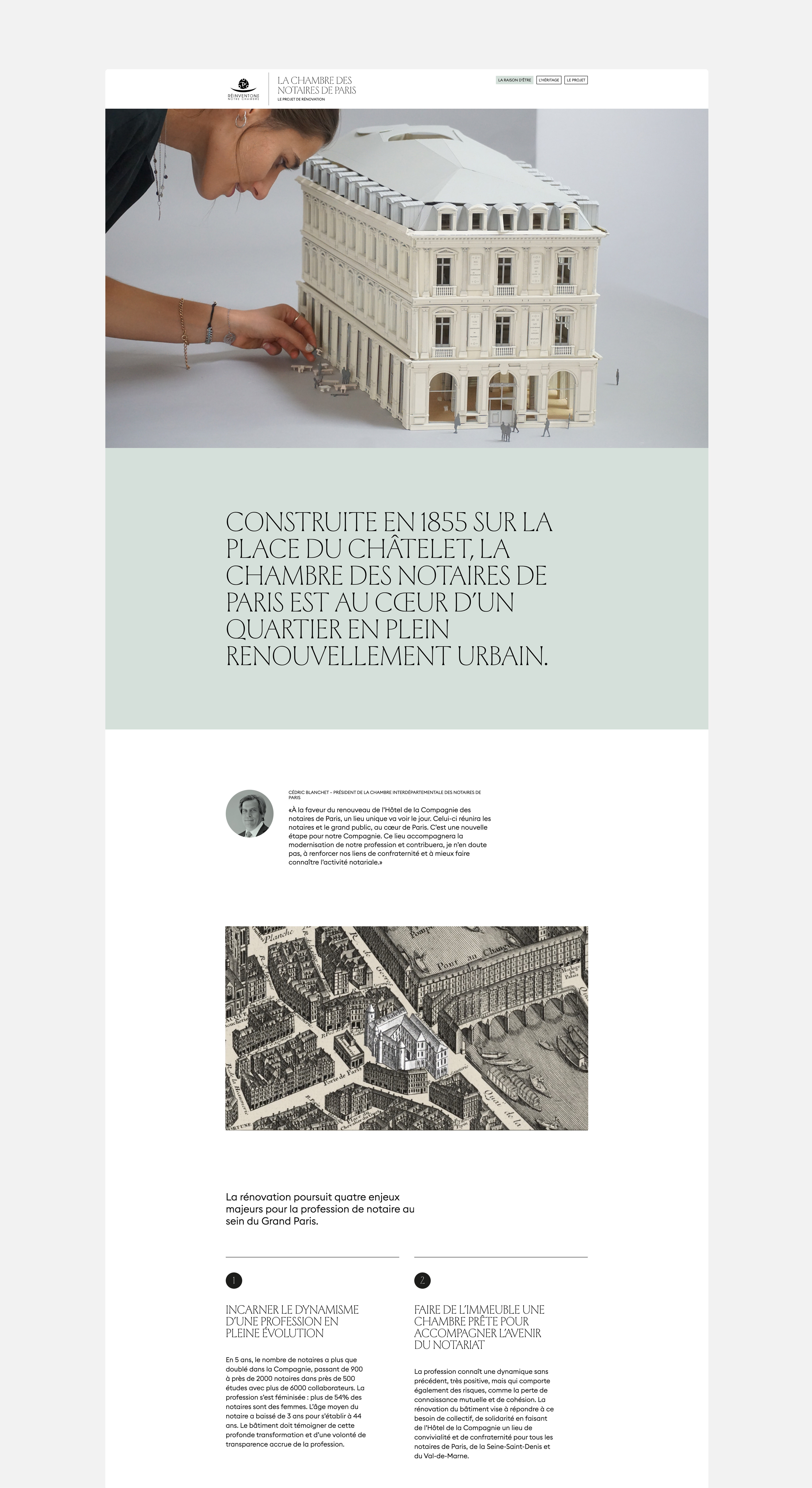 Le financement du projet, pour qu’il soit relancé, est soumis au vote de l’assemblée générale des notaires du Grand Paris. Sur les conseils des architectes, le bureau de la Chambre nous confie la réalisation d’un document qui doit convaincre la confrérie de s’engager pour la rénovation. Nous leur proposons plutôt de mettre en place un site internet , en amont de l’assemblée, et de réaliser un film à projeter le jour J.