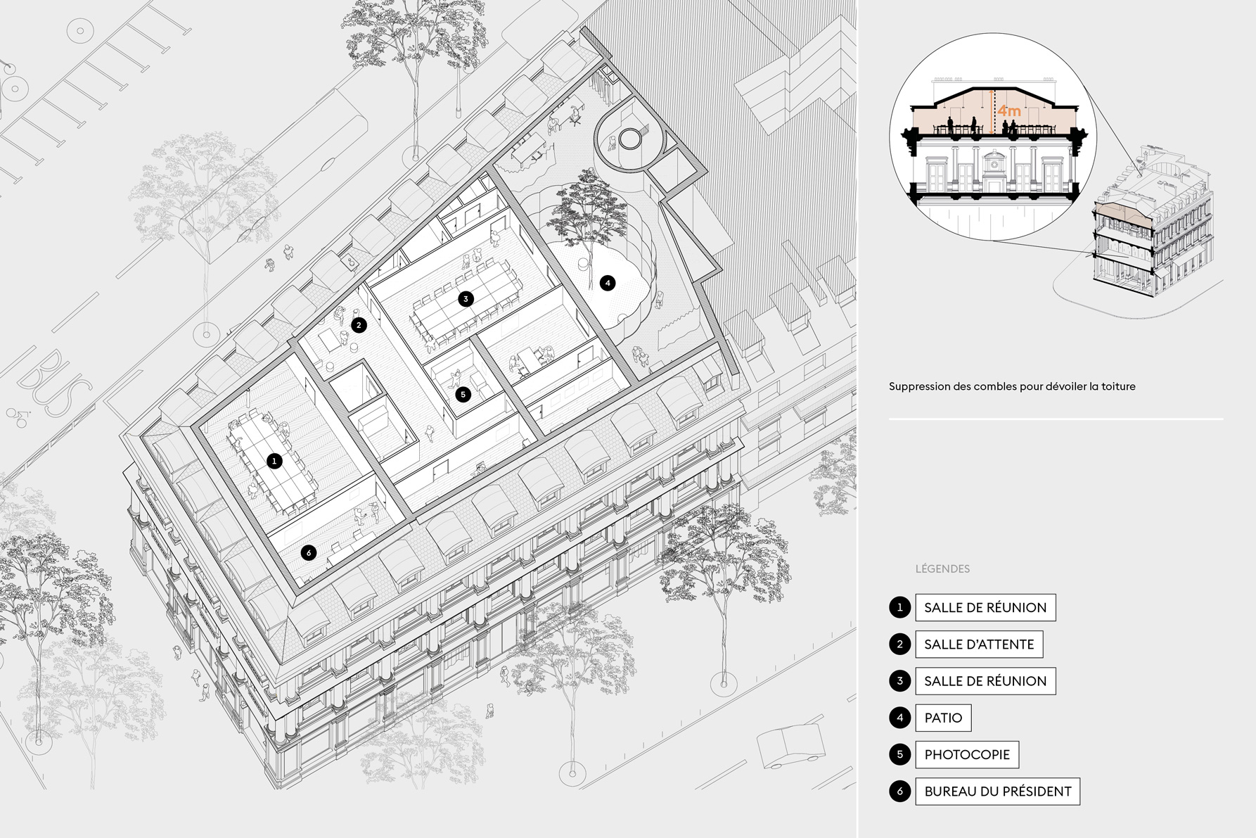 La Chambre des Notaires de Paris souhaite remettre au goût et à l’usage du jour l’édifice haussmannien qui l’abrite place du Châtelet. Elle entend ainsi participer au nouvel élan du quartier, insufflé par la rénovation des théâtres, et accompagner la mutation de la profession. À l’issue d’un concours très disputé, l’Atelier Senzu l’emporte mais la crise sanitaire met en pause l’opération.