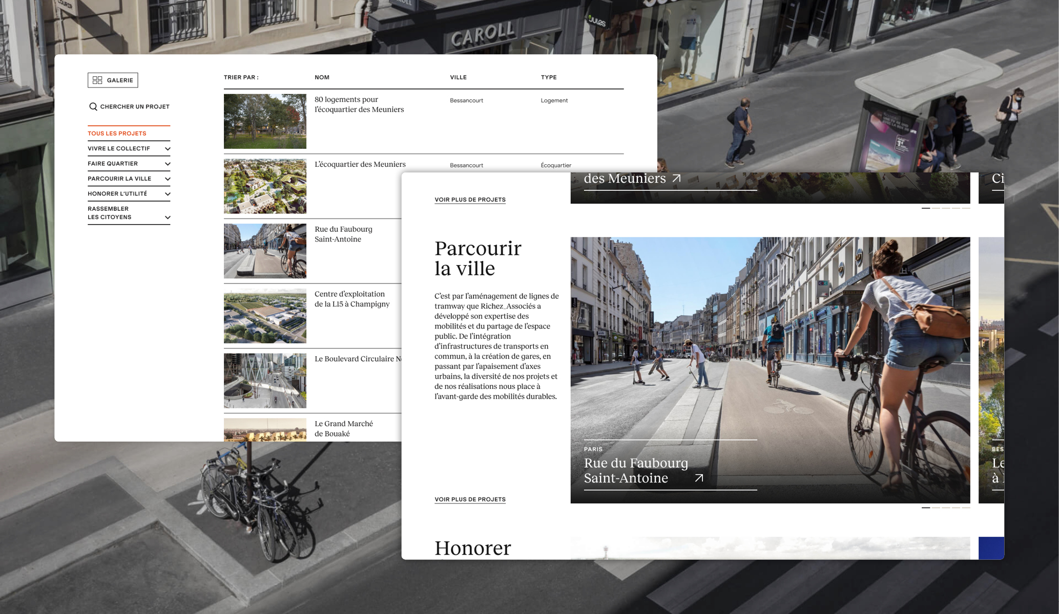 L’ancien site était pléthorique. À cela une raison de taille: c’est un outil pour les associés lors de leurs rendez-vous de prospection. Comment renouveler la voix de l’agence tout en répondant à cet usage spécifique ? En exposant quinze projets phares et en facilitant l’accès à tous les autres projets grâce à un outil de recherche performant.