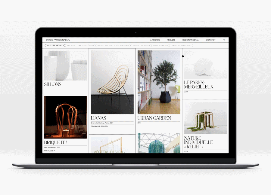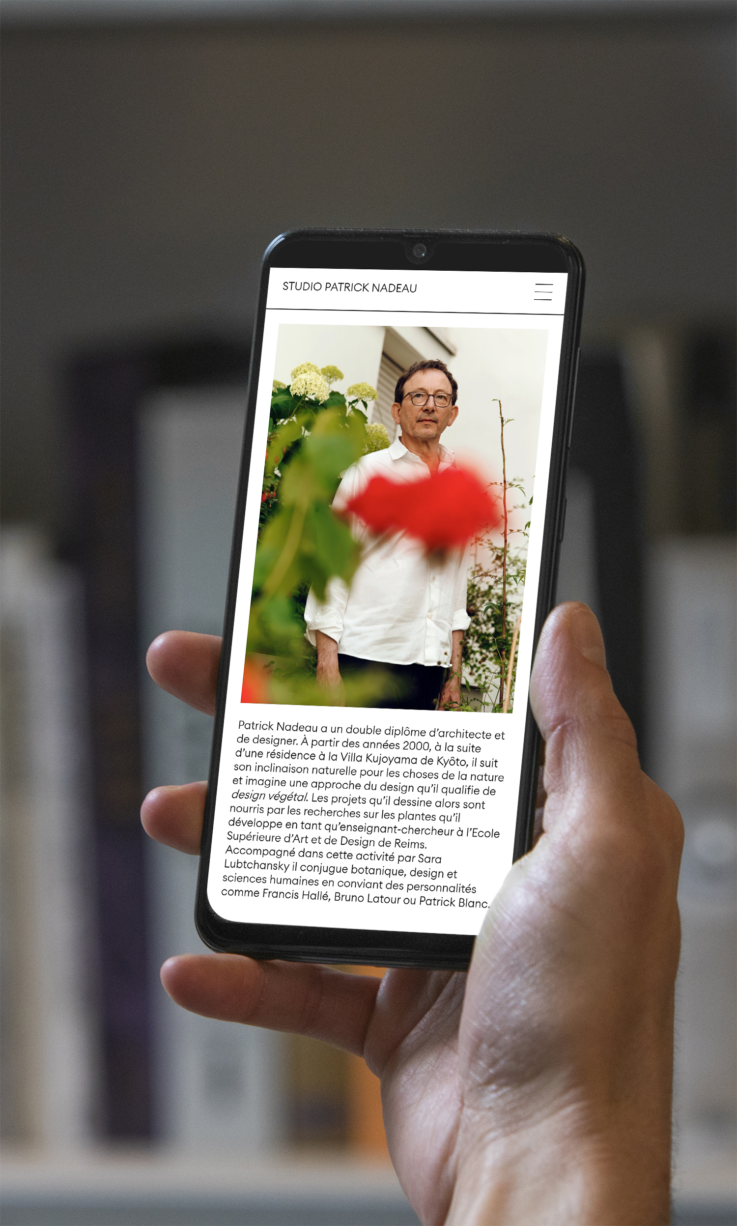 Amoureux du végétal, Patrick Nadeau l’utilise comme un matériau fondamental pour créer objets, installations, scénographies, architectures d’intérieur… Cette approche hybride, dont il est le précurseur, il la transmet notamment à l’école Camondo, lieu de notre rencontre. Pour la création de son site internet, nous avons établi un cadre graphique pur où s’exprime avec aise toute la poésie de son univers.