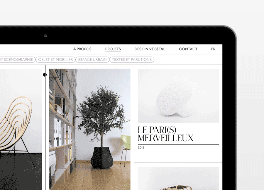 L’iconothèque du designer étant particulièrement riche, la photographie s’impose comme clé d’accès privilégiée à son travail. Des micro-interactions enrichissent l’expérience de navigation, conférant au site un aspect vivant.